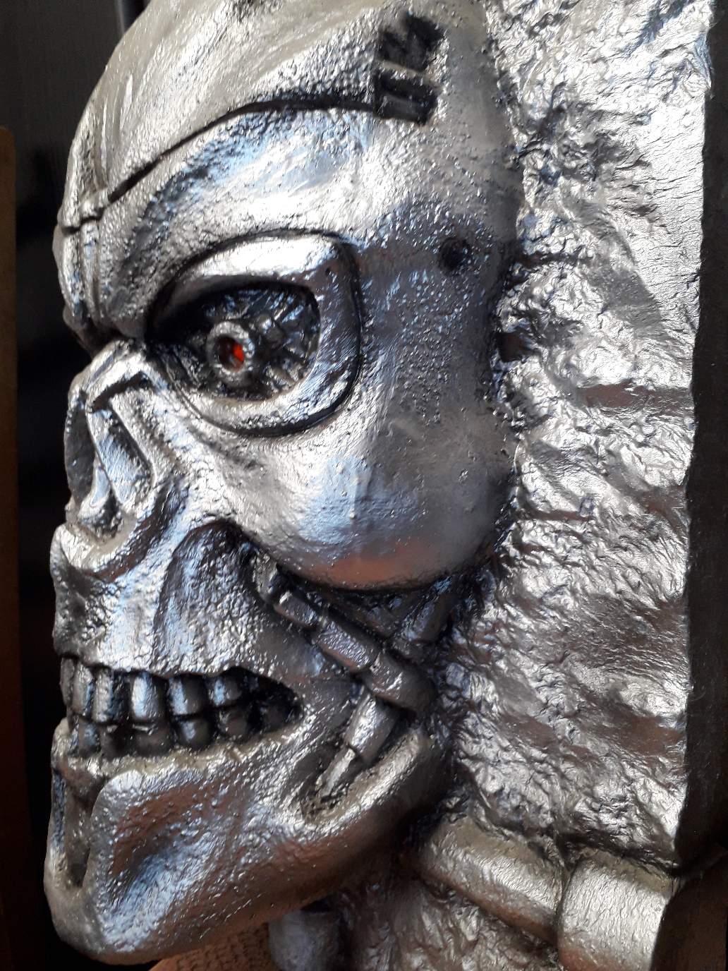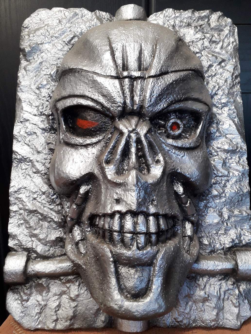 You are bidding on an unique, handmade relief of the head of the Terminator T800. It is made of Styropore fixed with Acryl.