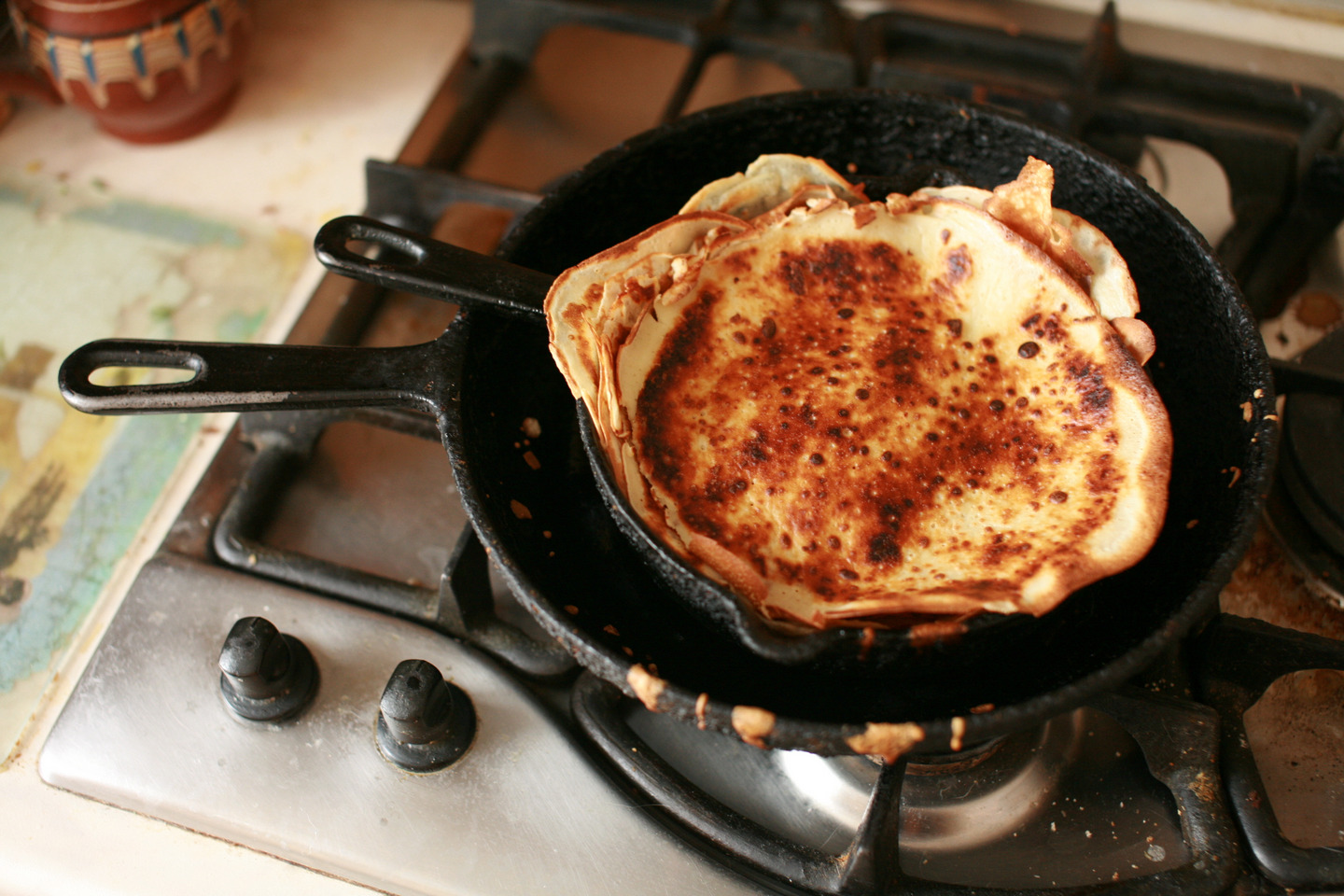 в этом смысле еще интеерснее те блины, которые "на кипятке". у них очень пористая дырчатая структура полуается, фактически все из дырок состоят. я пару раз делал, за неимением в доме молока - мне тожэе понравилось! а уж какой там простор для гадания, хихи. (но они очень непрочные, расползаются прямо на сковороде под руками - ребенка к такому я бы не приставил, ничего не будет получаться).