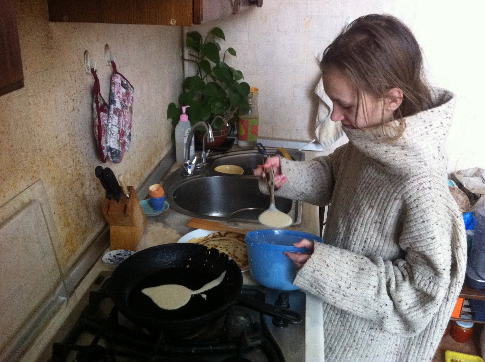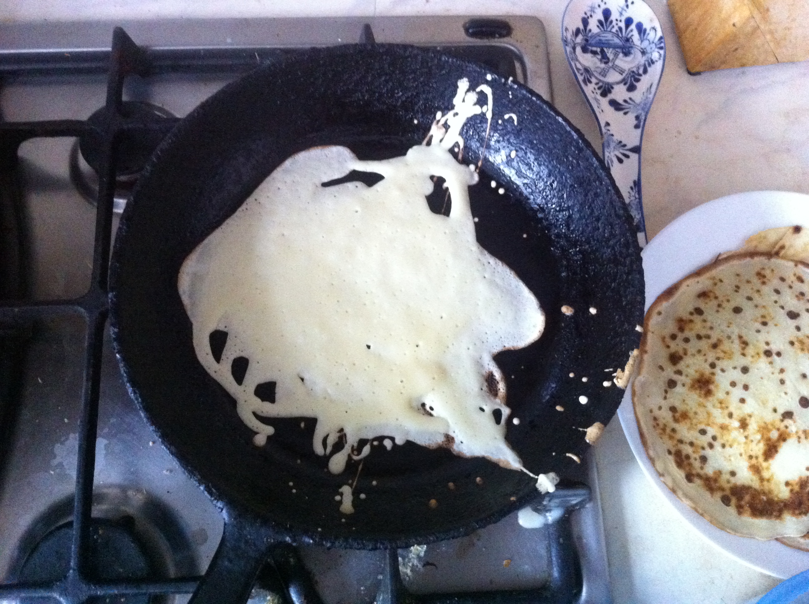 На завтрак мы с дочкой пекли блины! Еще вчера вечером ложась спать, она захотела блинчиков. Мы с ней условились что утром обязательно этим займемся, при ее непременном участии. Мама с утра наносила полезный но неприятный визит к зубному врачу, и оставила инструкции - освежила в памяти, что и в какой пропорции смешивать. Тесто детка перемешала полностью сама, а вот поджиг газовой плиты ей всё еще не даётся. Как и кручение-верчение тяжелых чугунных сковородок, с целью растекания блинного теста ровным слоем.