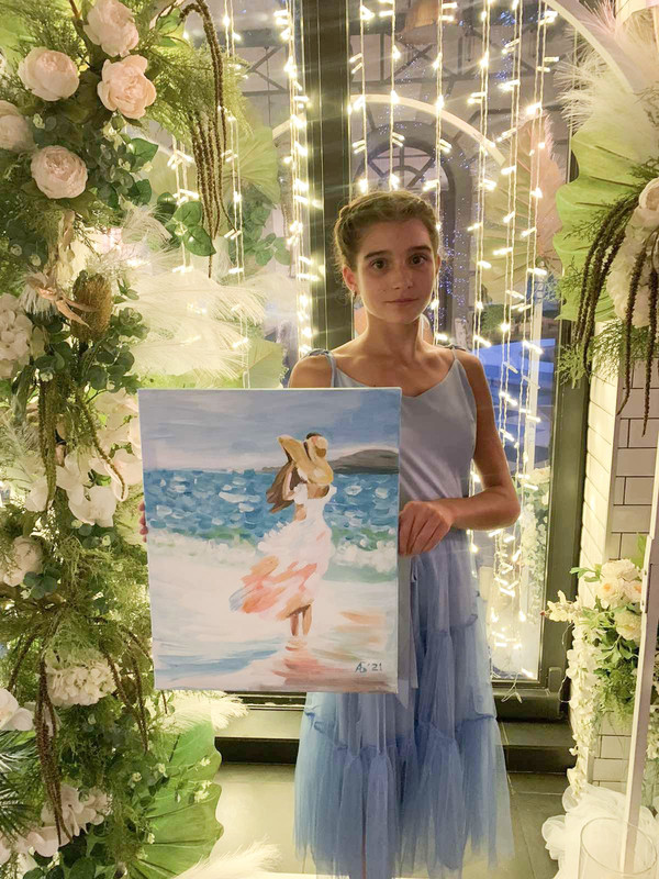 Или "Canvas, acrylic paints, dimensions 35x50 cm" - это относится ко всей картинке в целом : Девочка держит в руках акварель..., Девочка под аркой держит в руках акварель девочки на пляже... или та девочка, что держит акварель с девочкой тоже нарисована?