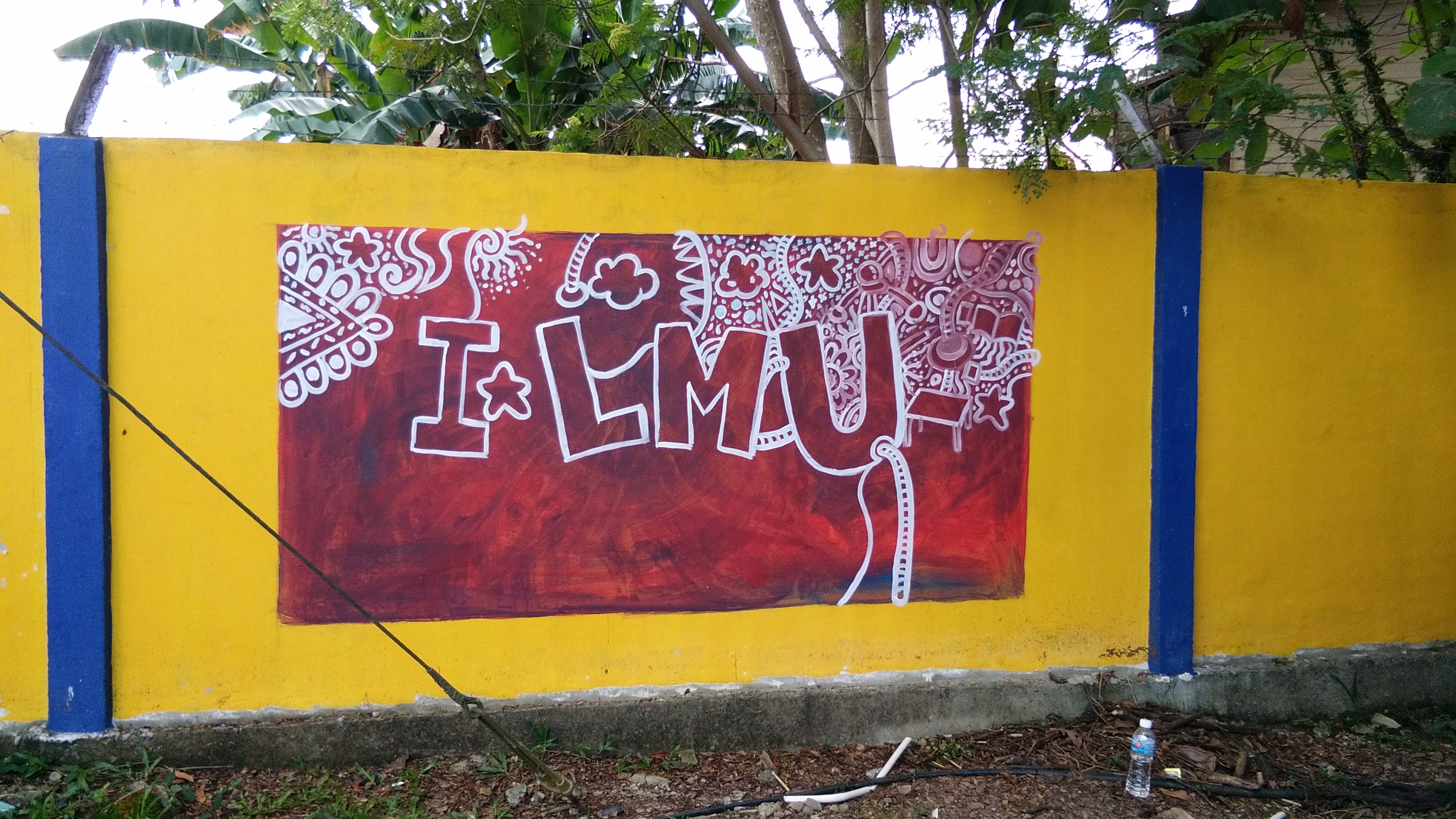 I'm just thinking for the simple mural just using Doodle technique. The background already paint with maroon color, so its better for me using the white paint.