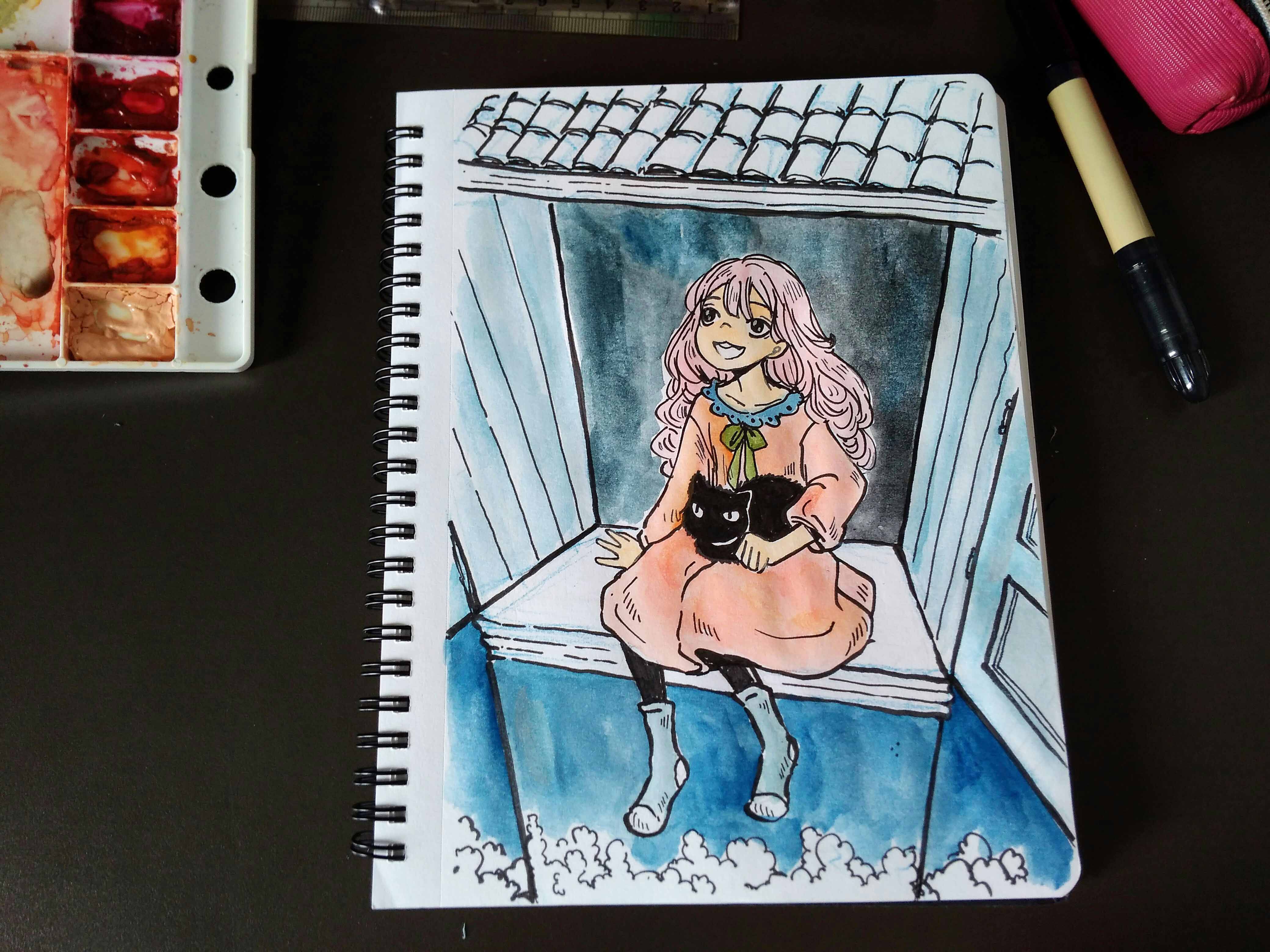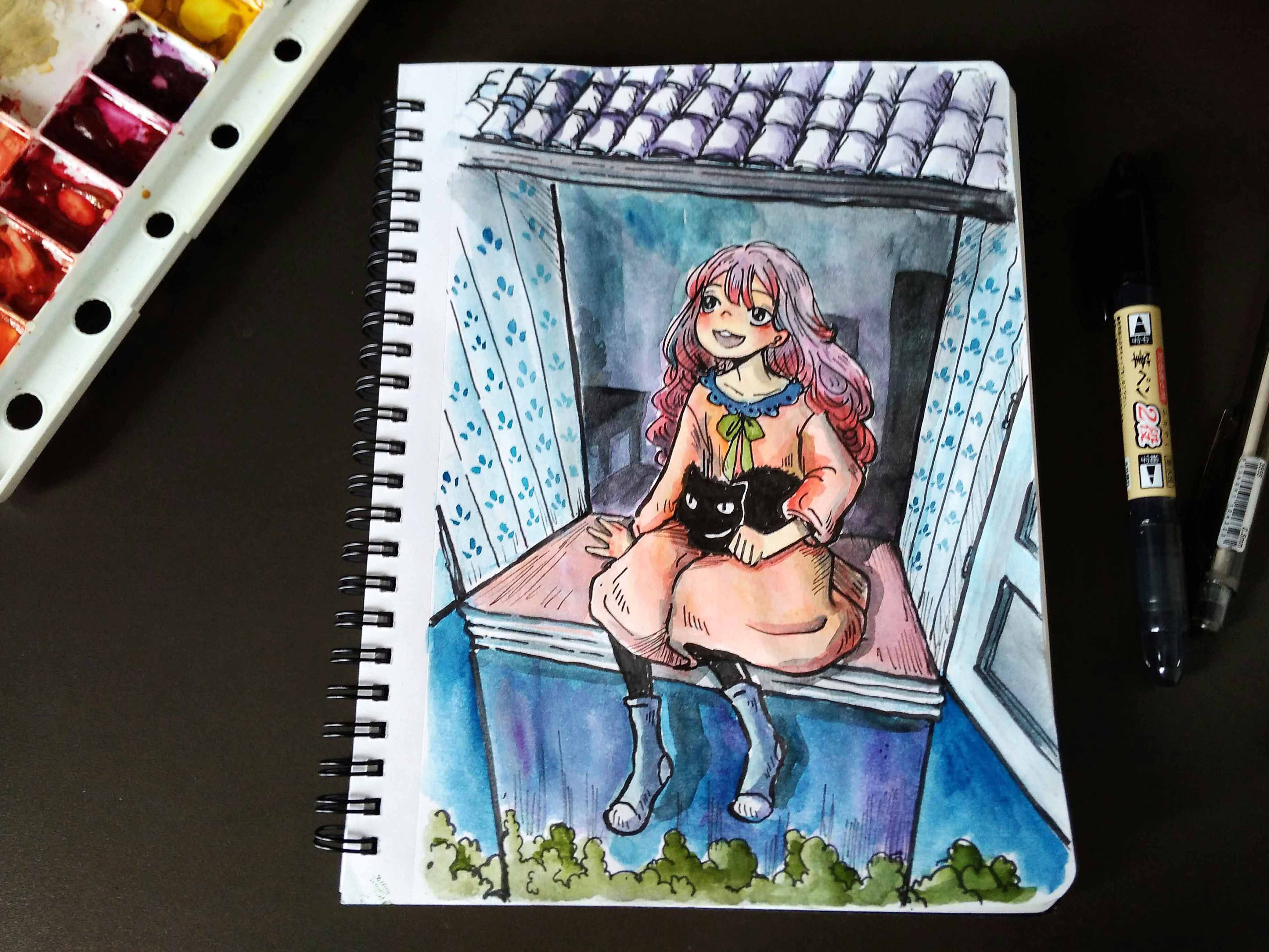 Today I will be sharing the watercolor painting I did with this girl and her cat looking out from their room window to see the moon.