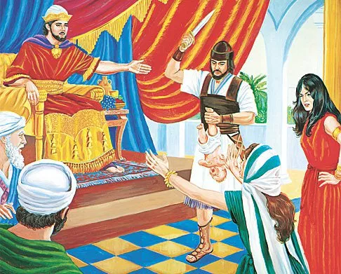 The determined king tells one of his guards to take his sword to divide the boy for whom these two women were fighting, a decision that made the guard hesitate, but he obeyed his king, and slowly took off his sword, and arrived where one of the women, who held the baby, the real mother of the child, prostrated before the king, to ask him not to kill the child, while the other woman said yes, neither for you nor for me, this act, I determine the decision of wisdom, of the king, understanding that the true mother, was the one who asked for clemency for the life of the child.