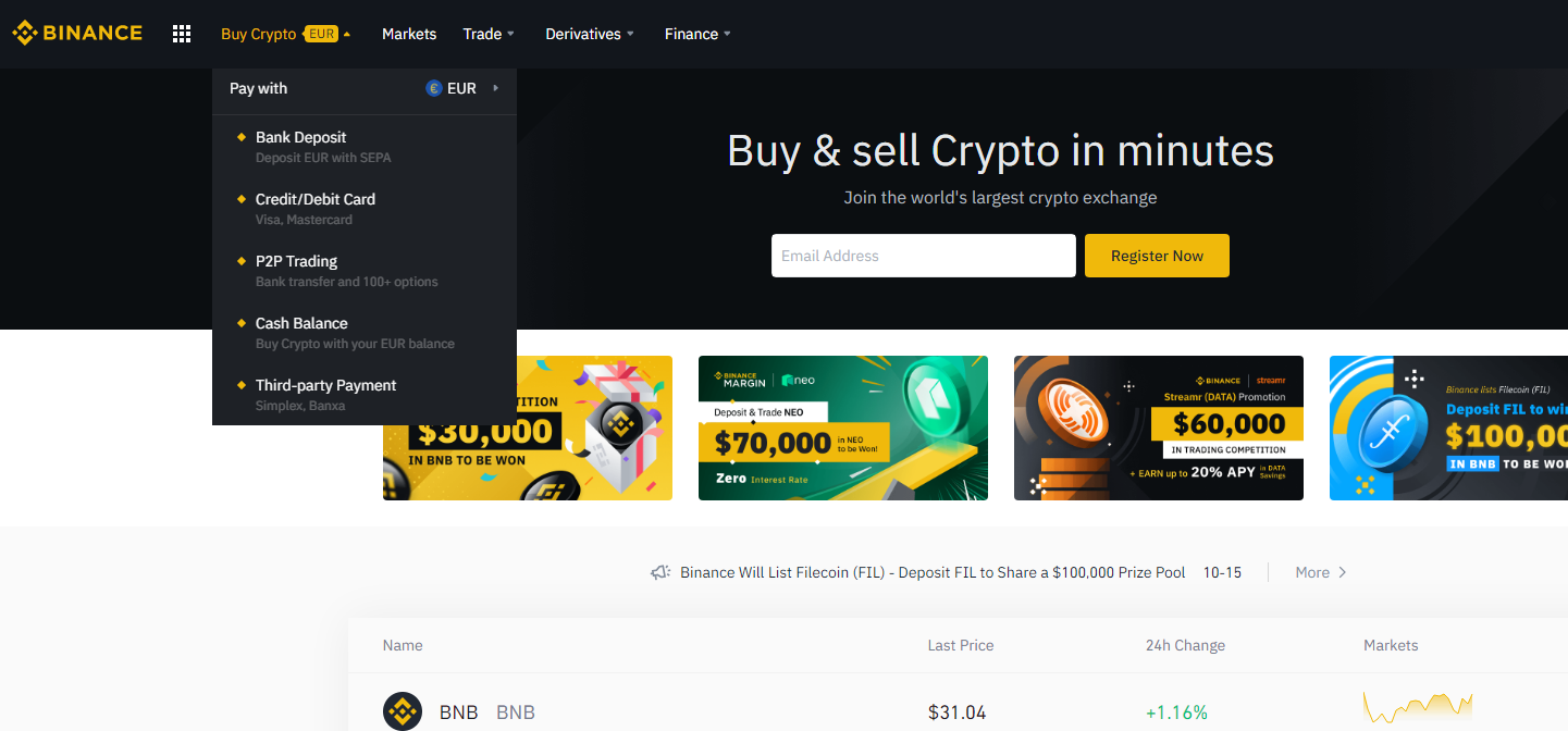 You can find the Binance website at www.binance.com. This is a natural place to start if you want to purchase crypto. They are making it very easy at their website, just check the screenshot below.