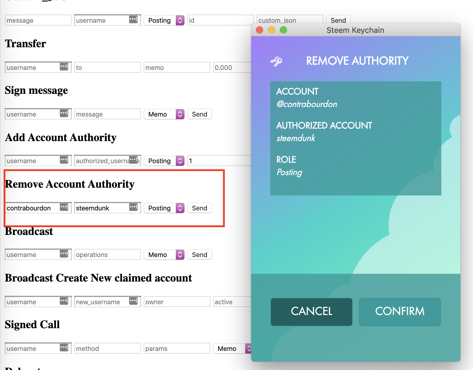 Scroll down to "Remove Account Authority" and enter your username in the first box and the authorising account in the other box. Select Posting or Active and click Send. Steem Keychain will pop up to confirm the transaction. This webpage does not ask for any credentials.