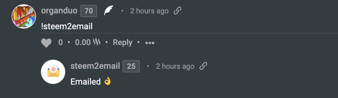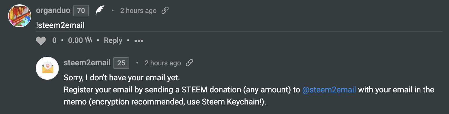 !steem2emailin a comment to get the post sent to your email inbox. - If you call the bot without registering, you will get the following message: