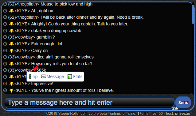 You can now (once again) click usernames in chat which should open up a menu allowing you to tip other users STEEM.. as well as direct private message and view their gambling stats, however the last 2 functions are still being implemented.