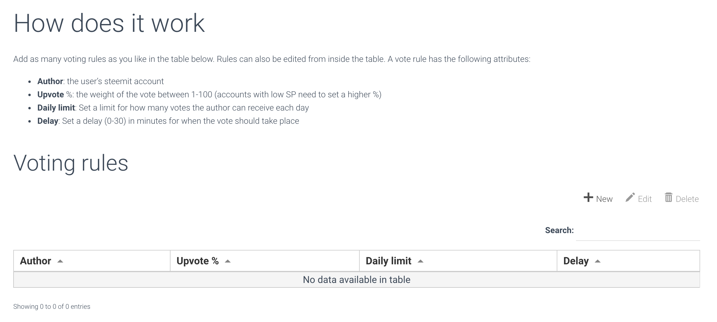 Log in at https://steemautomated.eu/ with your STEEM account. After logging in you will be able to go to the voting page. On this page you can manage all of your custom voting rules. But first you will have to authorise steemautomated to perform offline votes for you.