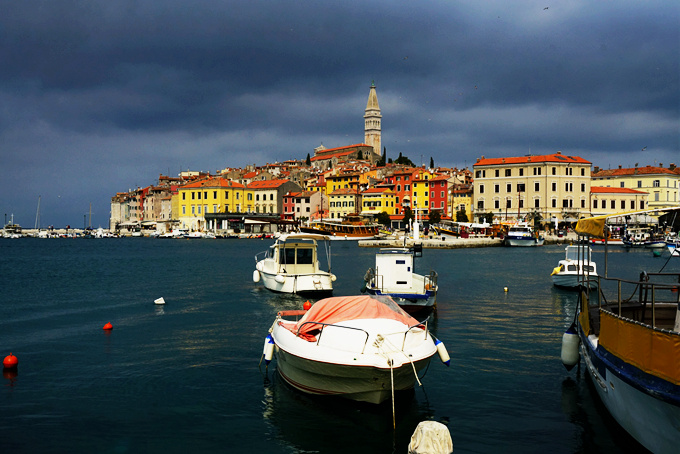The shower is approaching noon, the billowing thick clouds, but also as a beautiful old building color, the Church of clock tower and, like a painting of the thick and heavy in colours. At this time, Rovinj is not beautiful?