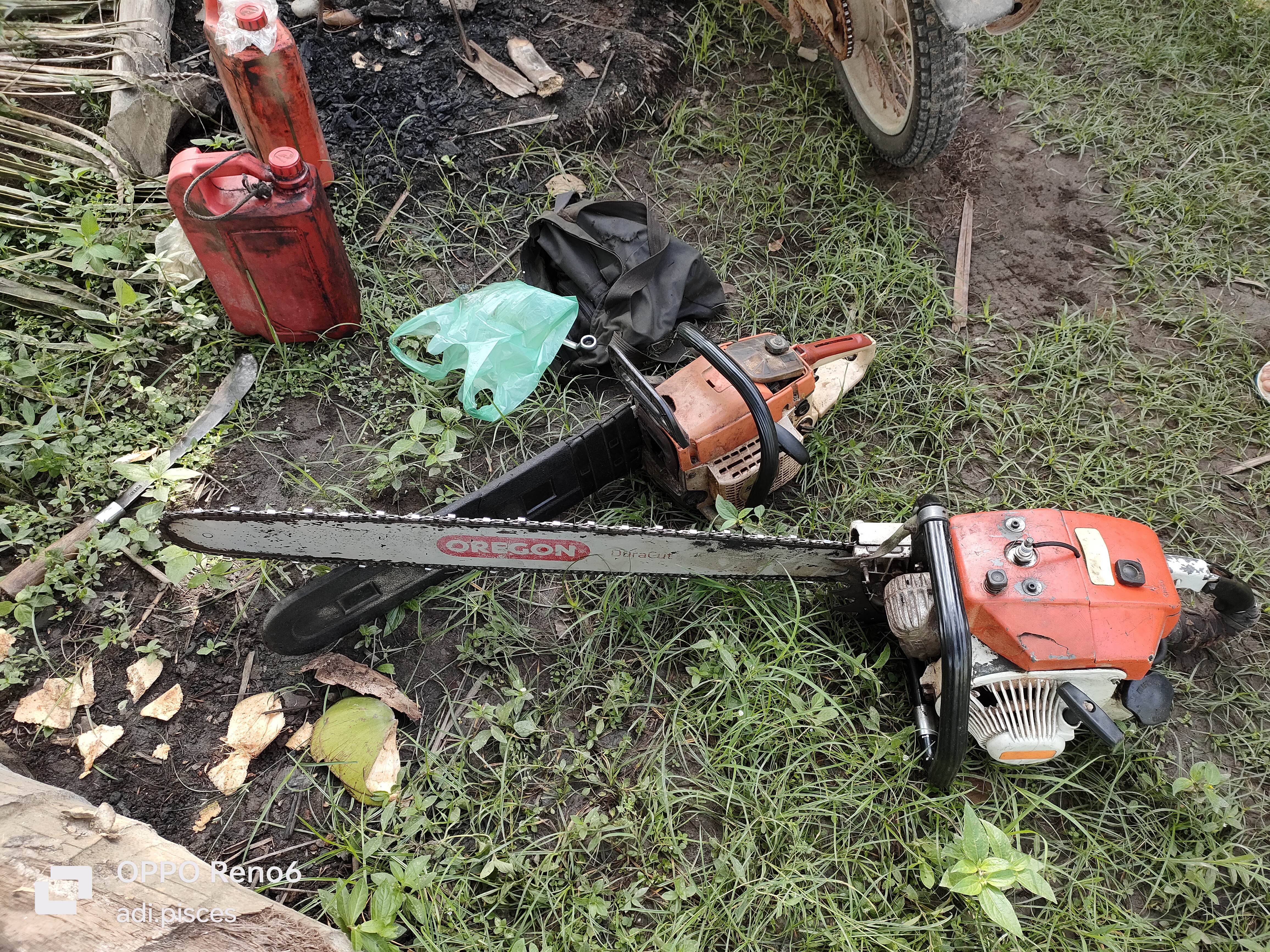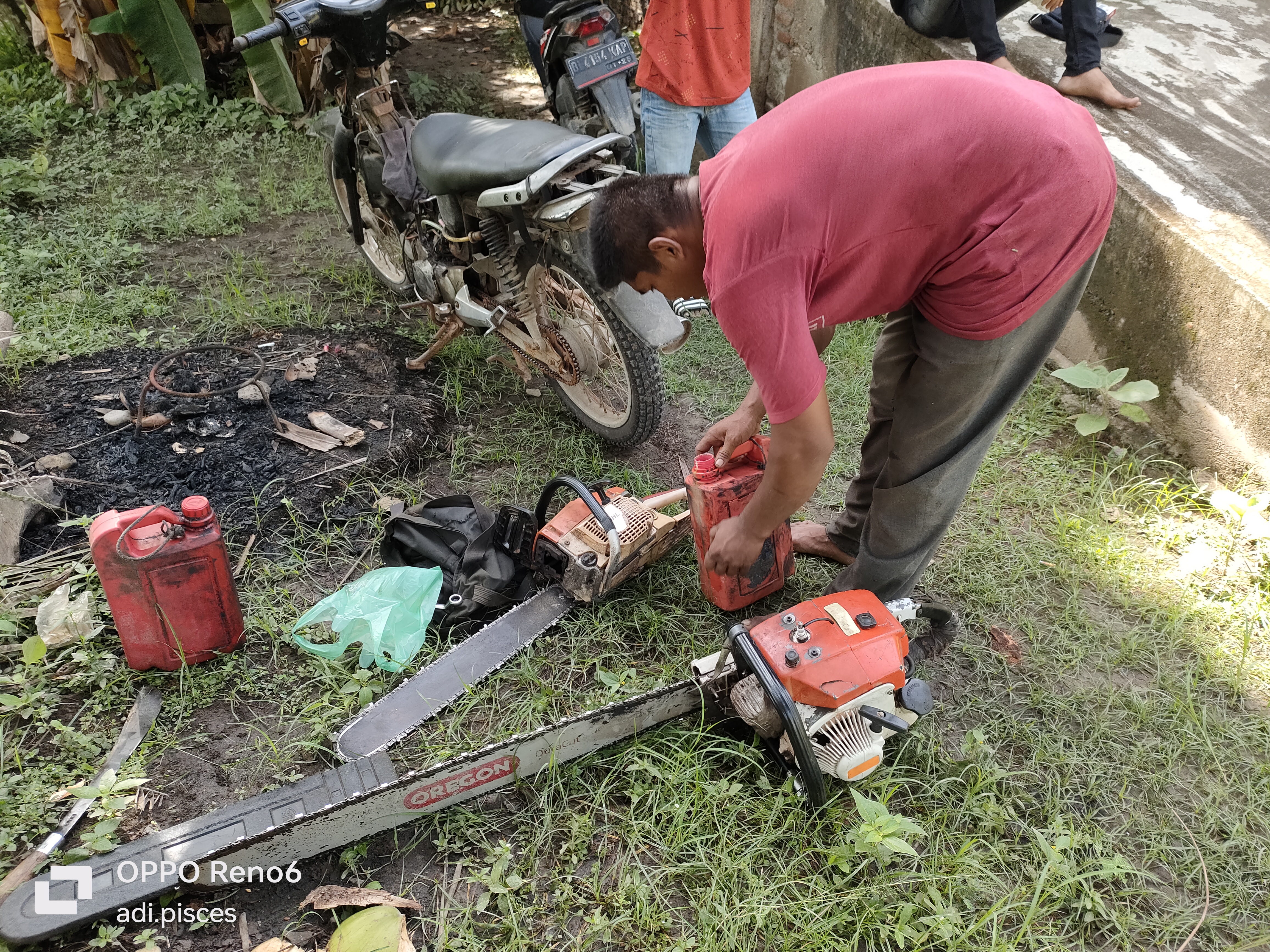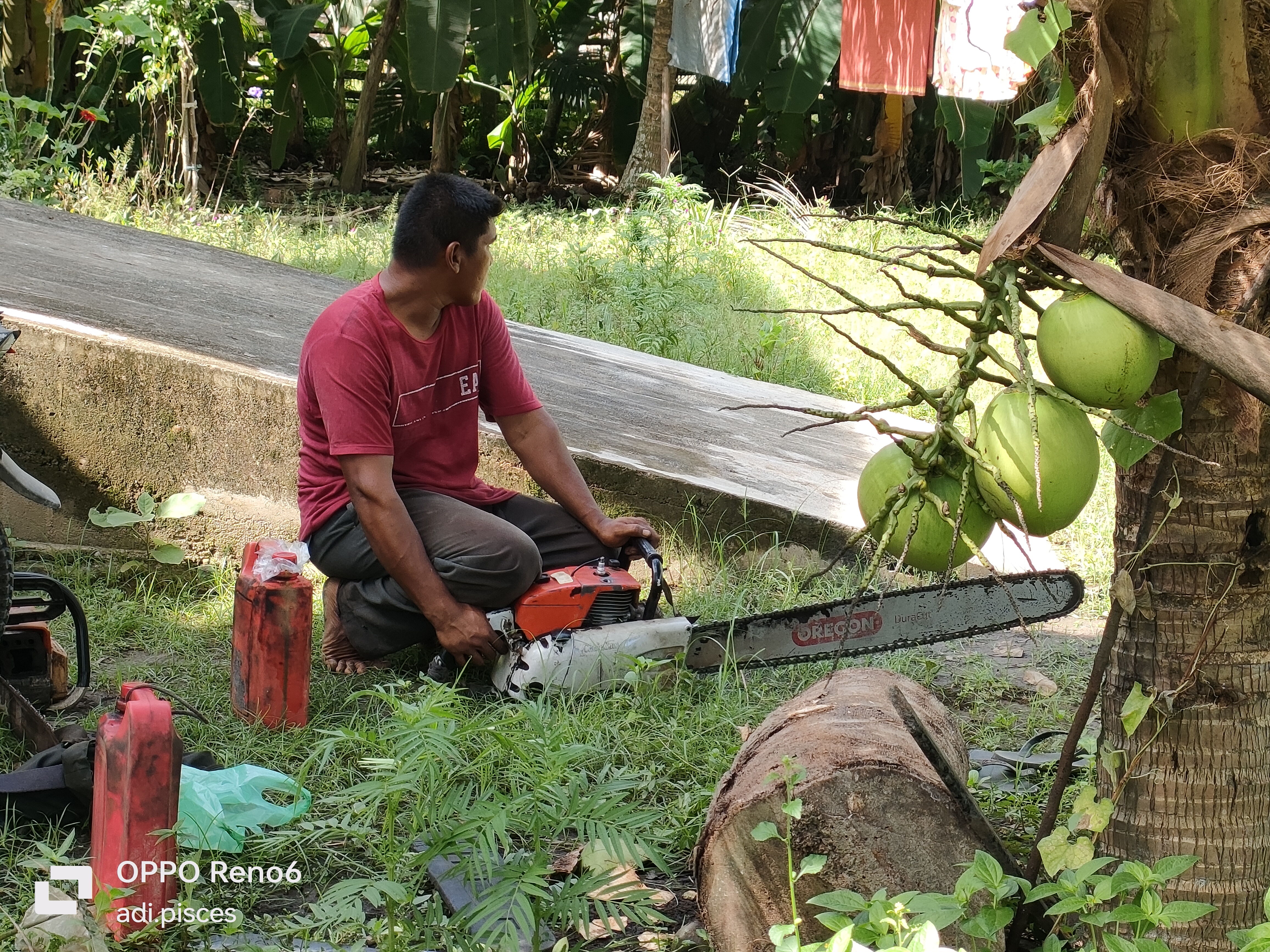 Sebelum melakukan pemotongan, mesin pemotong kayu akan di lakukan pengecekan dan pemanasan mesin hingga di siap untuk digunakan, dan kami pun sudah mulai siap-siap di sana untuk membantu agar proses pemotongan pohon kelapa nantinya tumbang kearah yang di harapkan.
