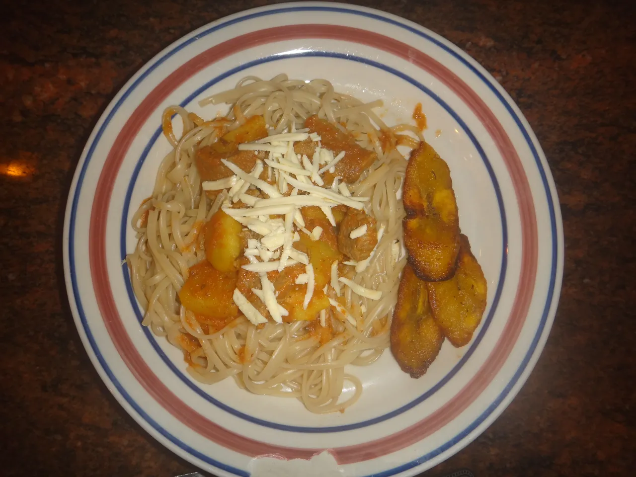 PASTA CON CARNE GUIZADA TAJADA Y QUESO.