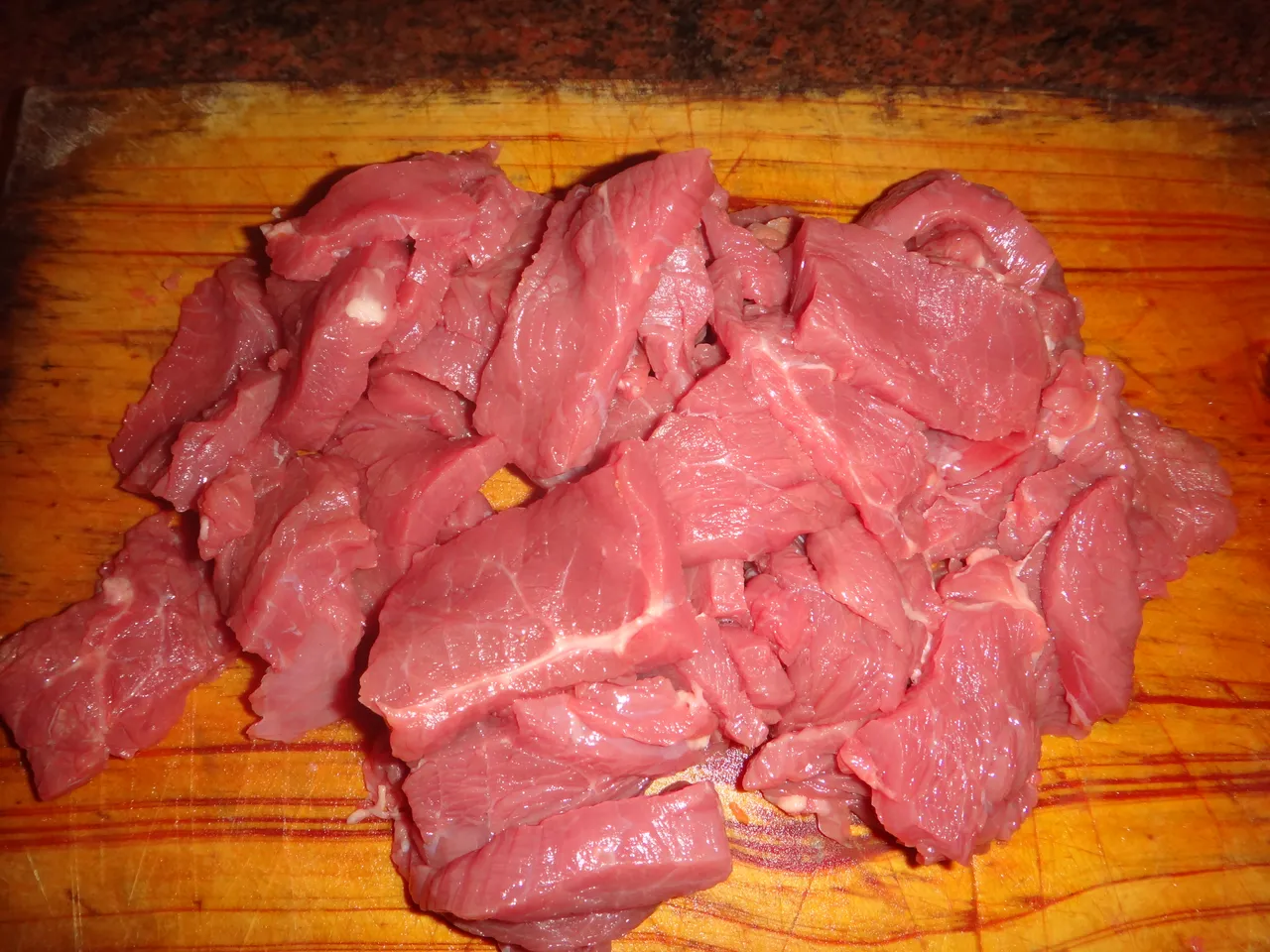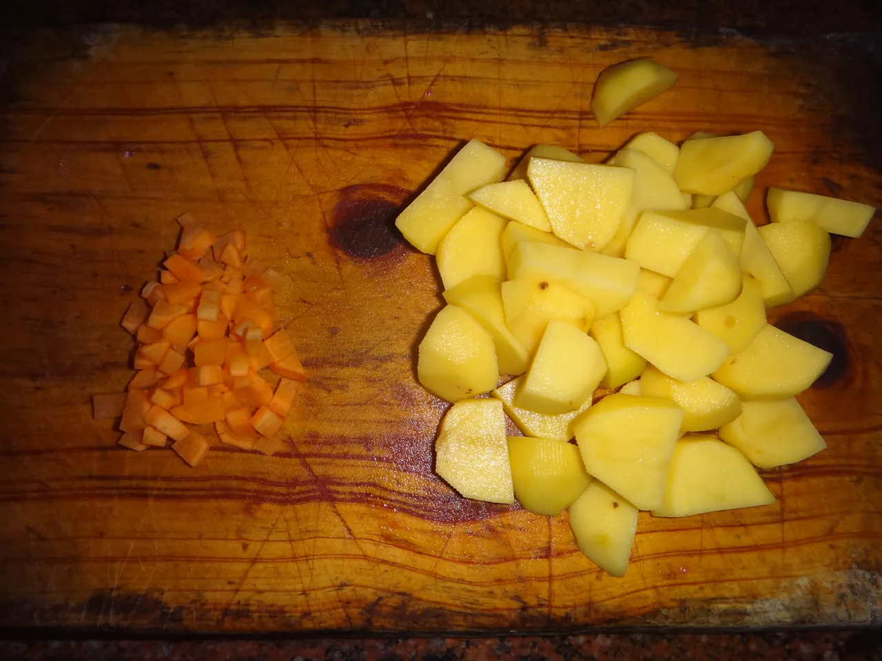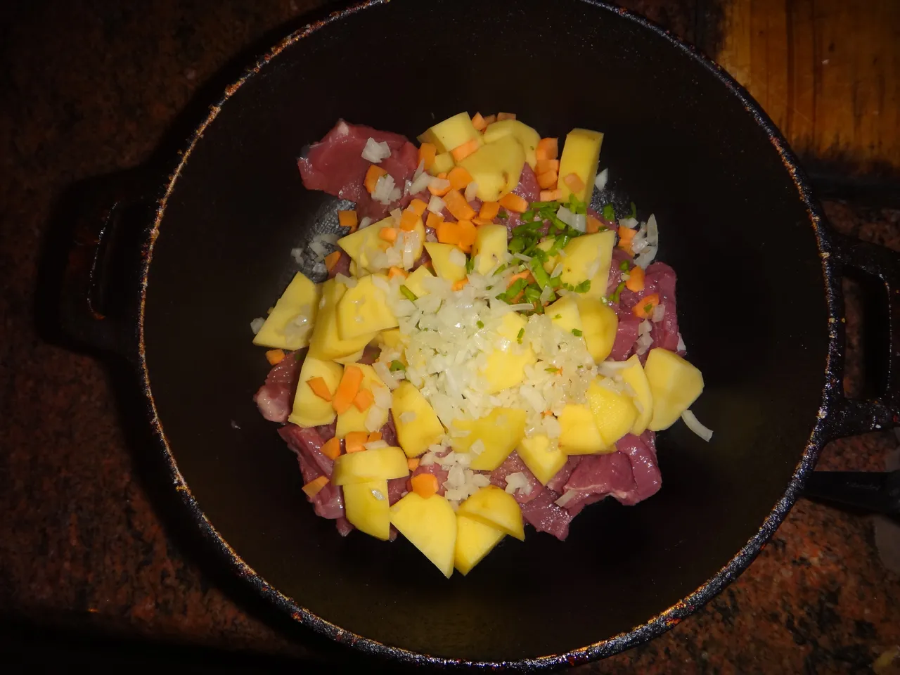 Se corta la carne en pequeños trozos, luego se coloca en una sarten gusto con ella las papas, las zanahorias, y aliños con una taza de agua y ya todo esto esta lista para montar a cocinar durante 30 minutos.