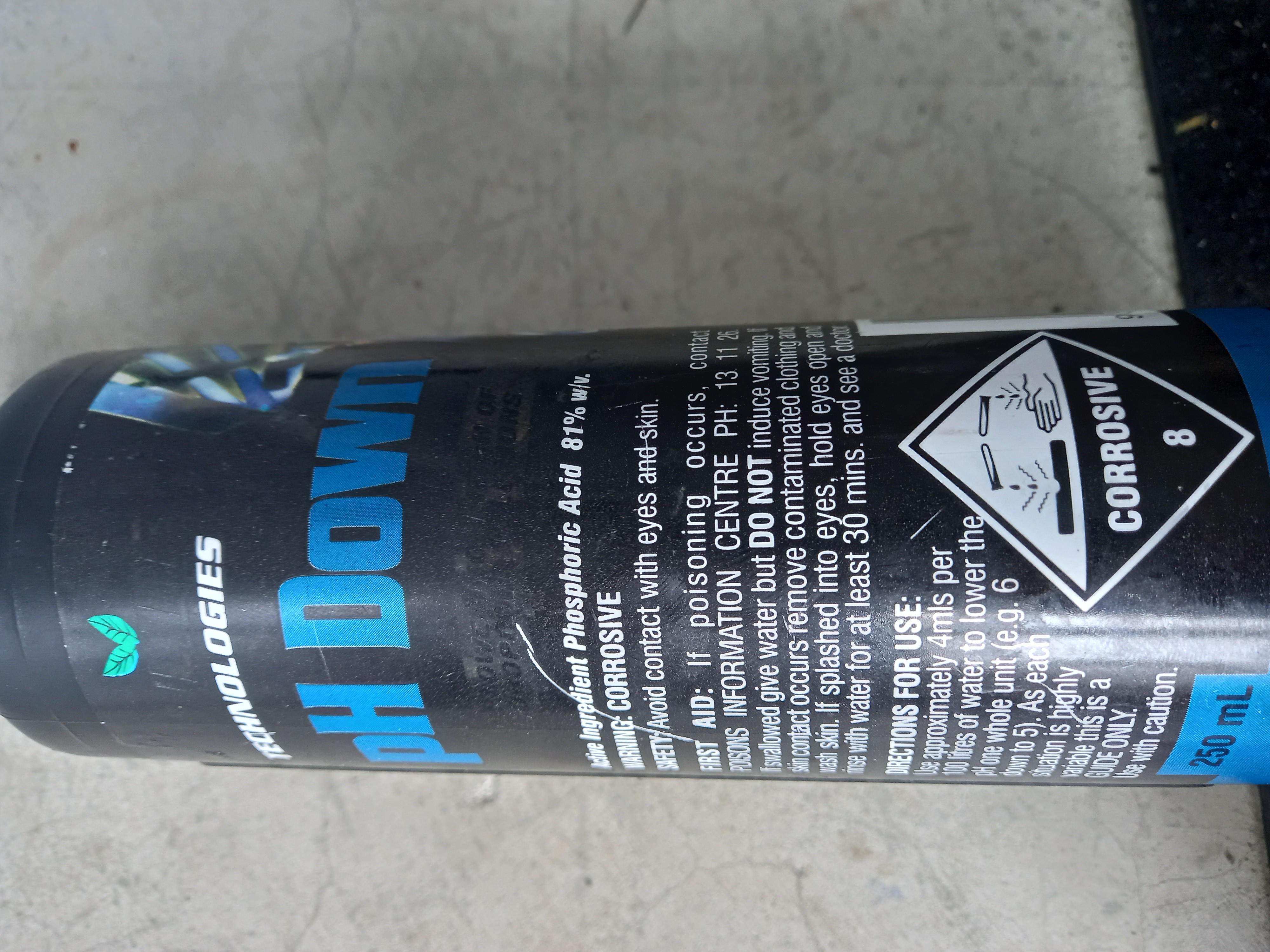 Ok on the right is a Blood and bone $2 bottle which was being added to every 5th or so watering's, on the left is what is used when the need to drop the PH level to around 6.5 - this only takes a drop to lower it.