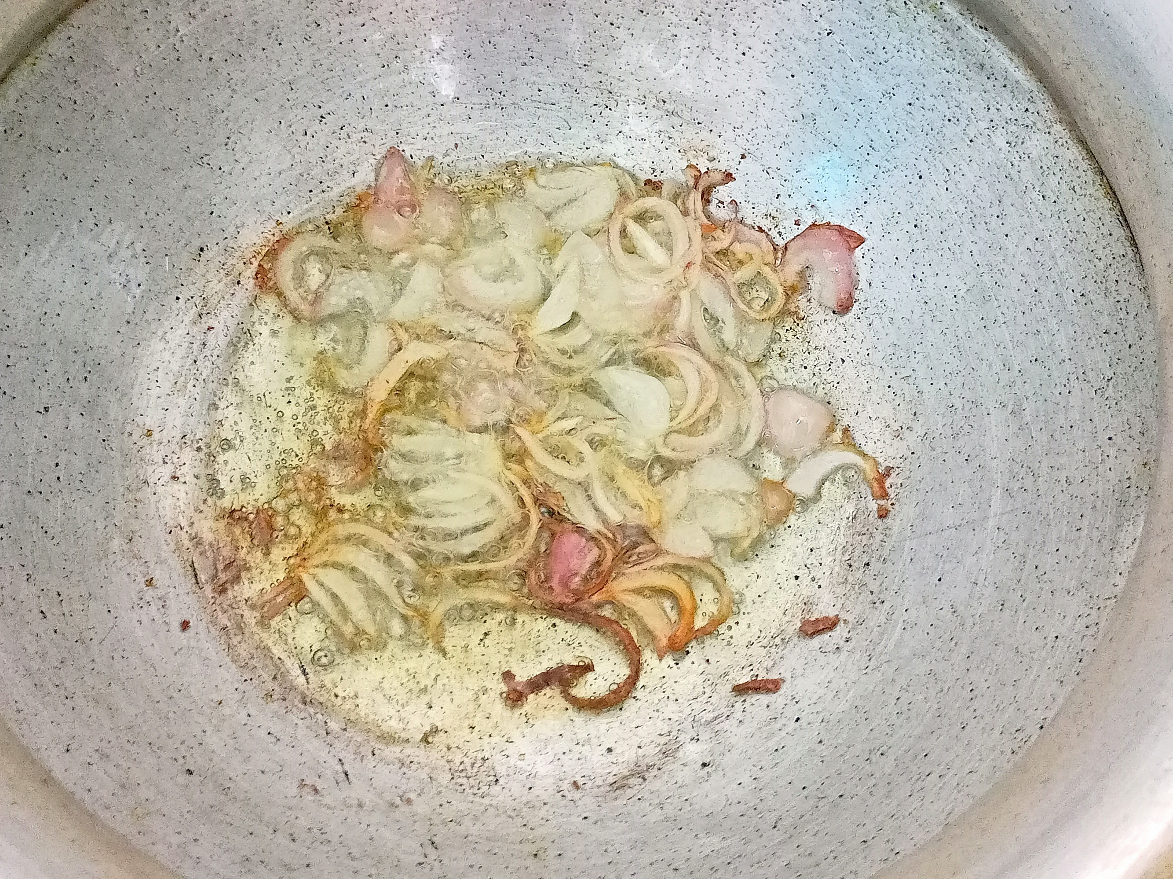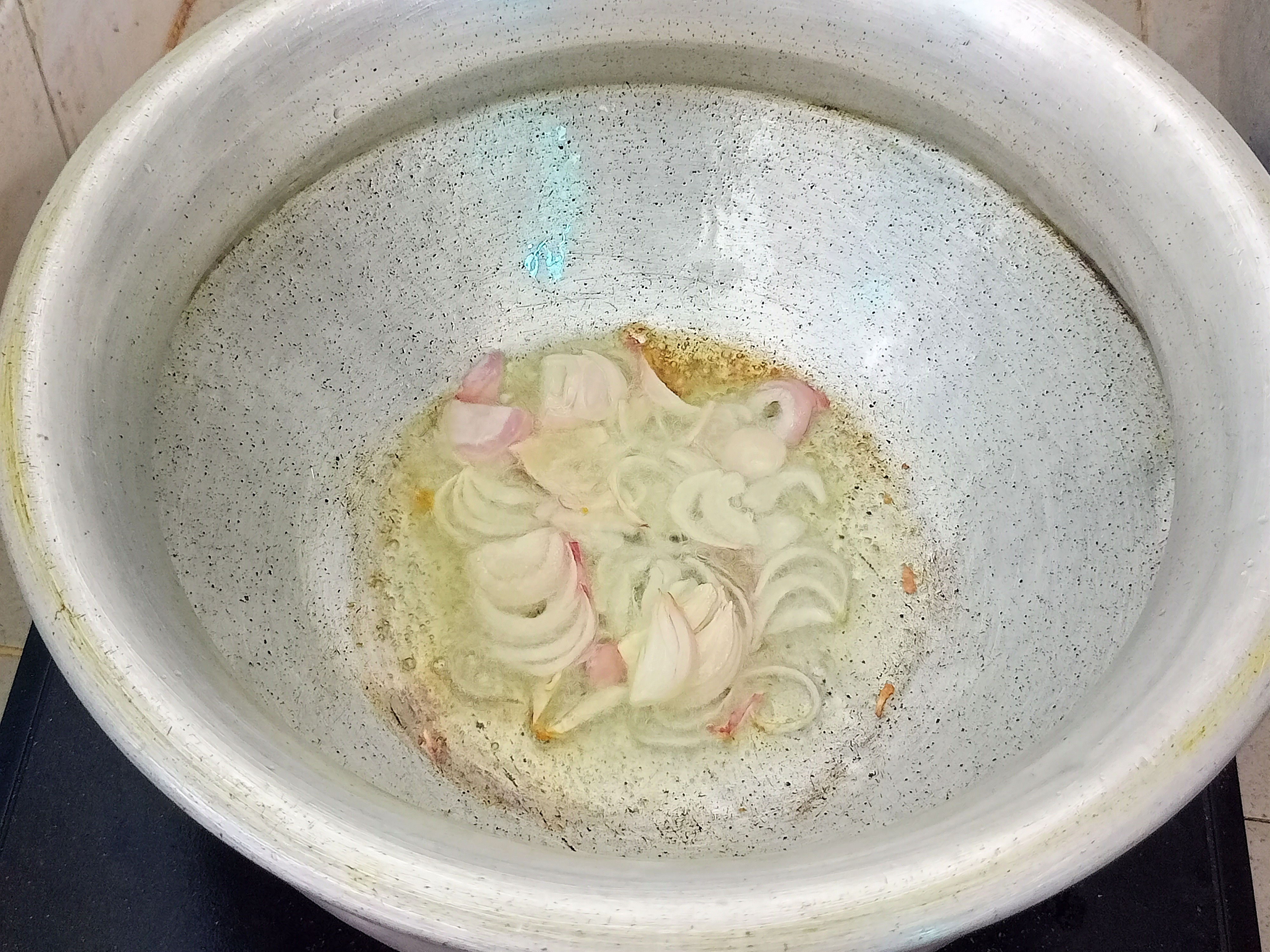 | এই ধাপে একটি পাতিল চুলায় চাপিয়ে দিয়ে পরিমান মতো সোয়াবিন তেল দিলাম। এবার পেঁয়াজ কুচি দিয়ে ভেজে নিলাম। |