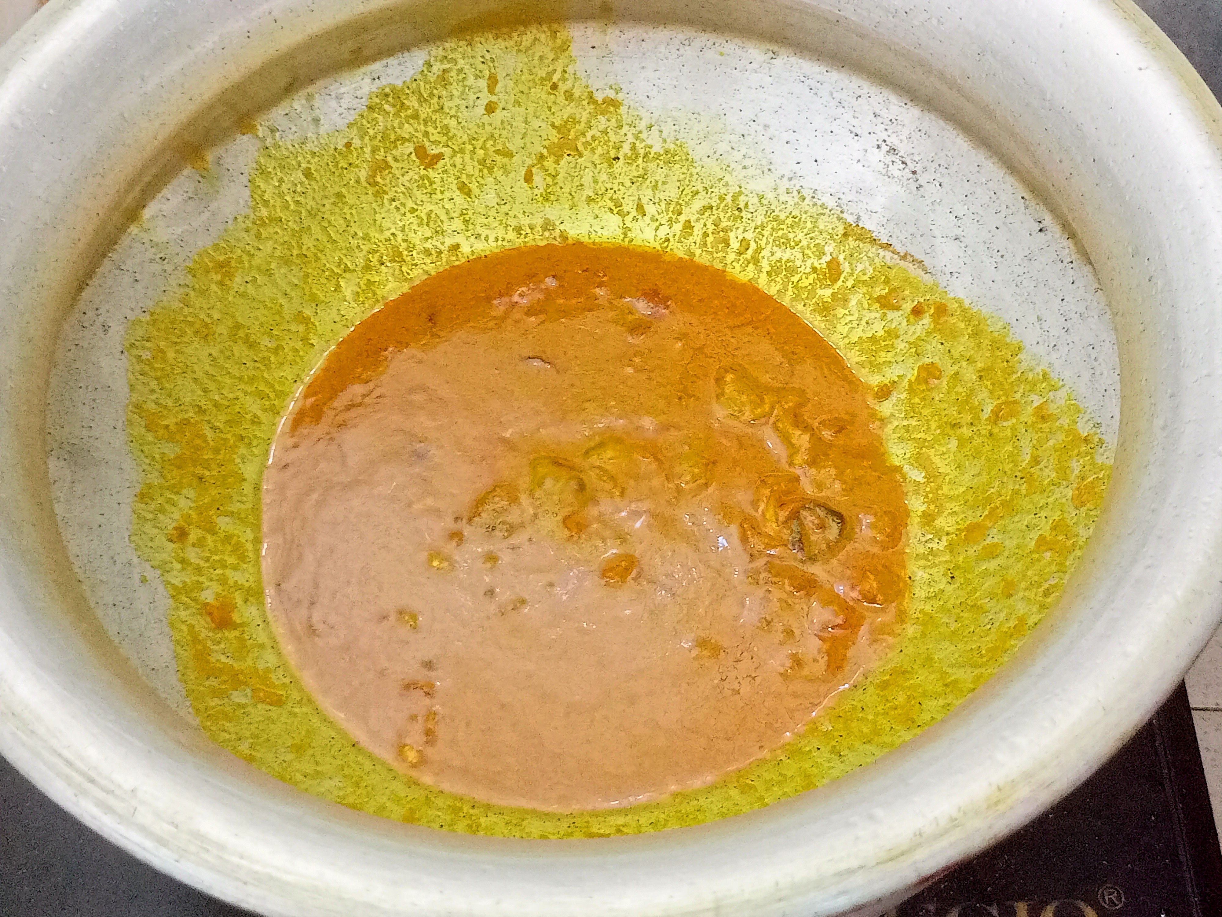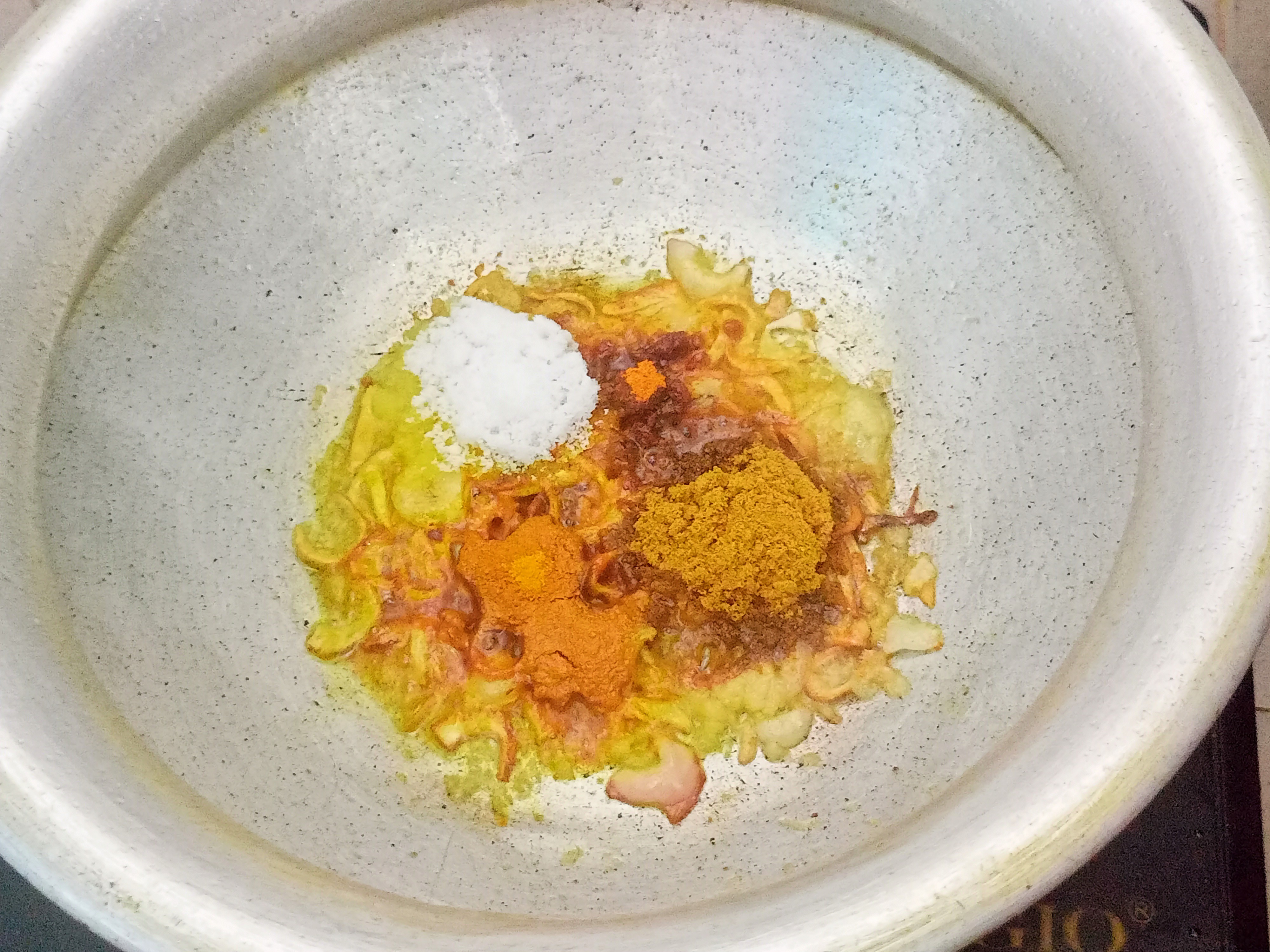 | এবার ভাজা পেঁয়াজের মধ্যে একে হলুদ গুঁড়া, মরিচ গুঁড়া, রসুন বাটা, জিরা গুঁড়া এবং লবণ দিয়ে দিলাম। এখন সামান্য পানি দিয়ে কষিয়ে নিলাম। |