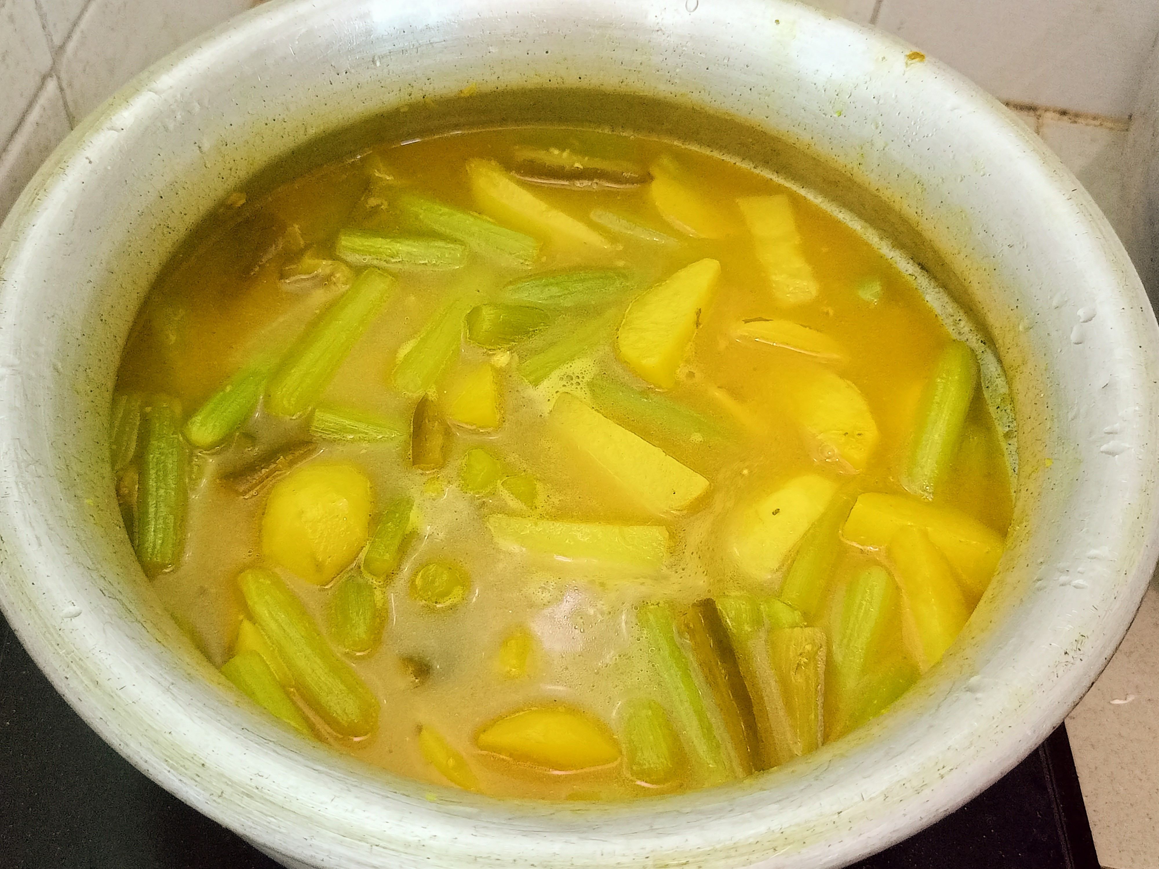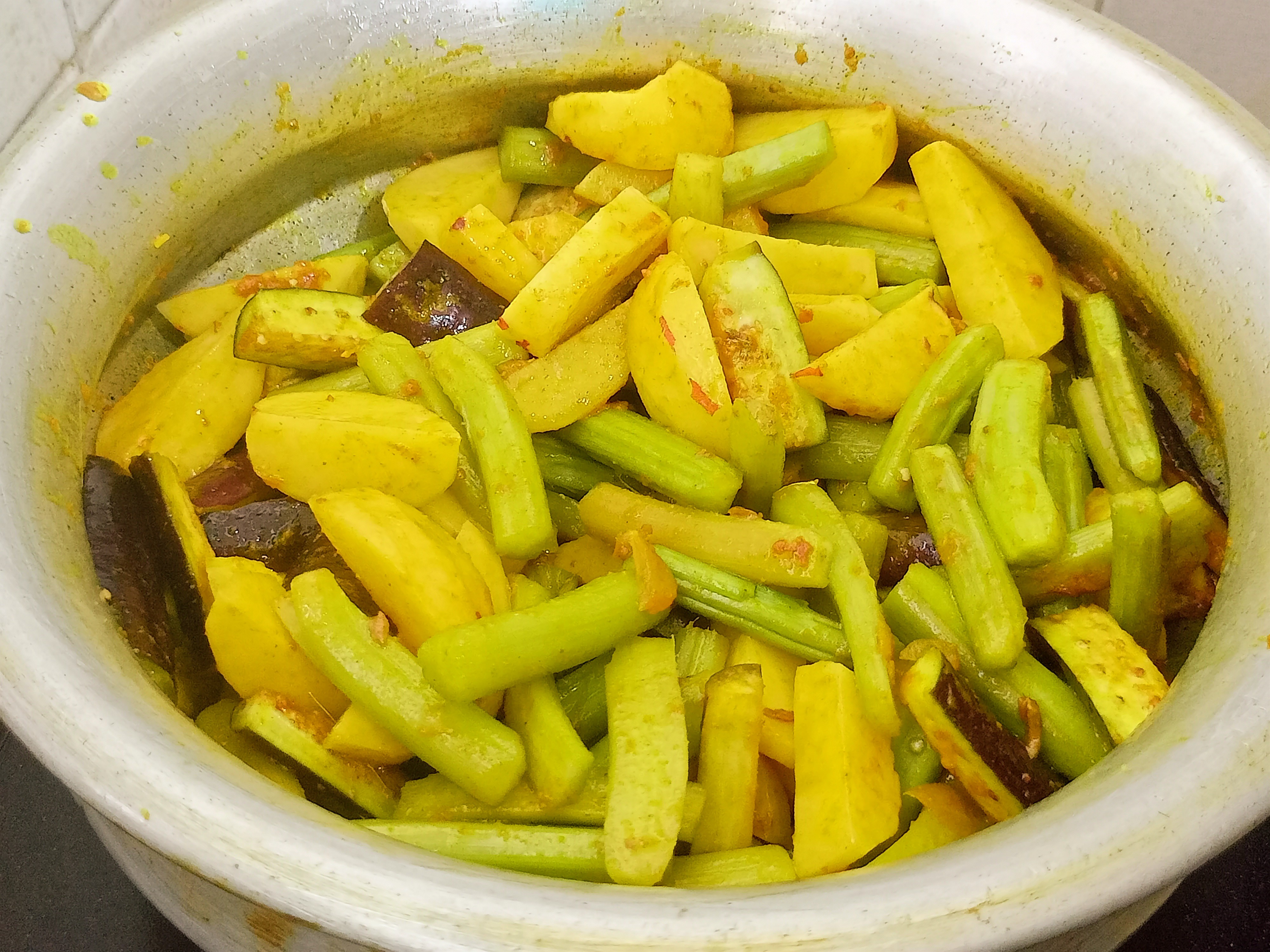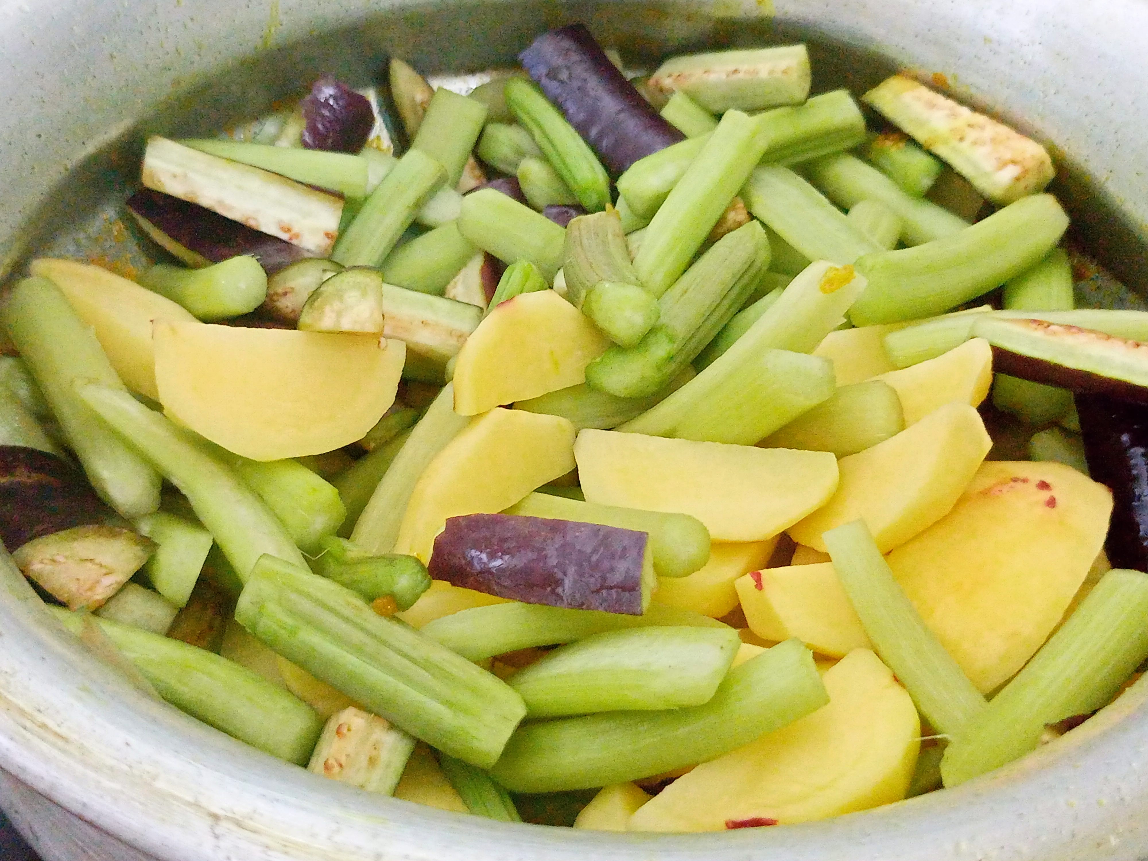 | এবার আমাদের সবজিগুলো দিয়ে দিলাম। কিছুটা সময় মসলার মধ্যে সবজিগুলো কষিয়ে নিলাম। এরপর ঝোল দিয়ে দিলাম। |