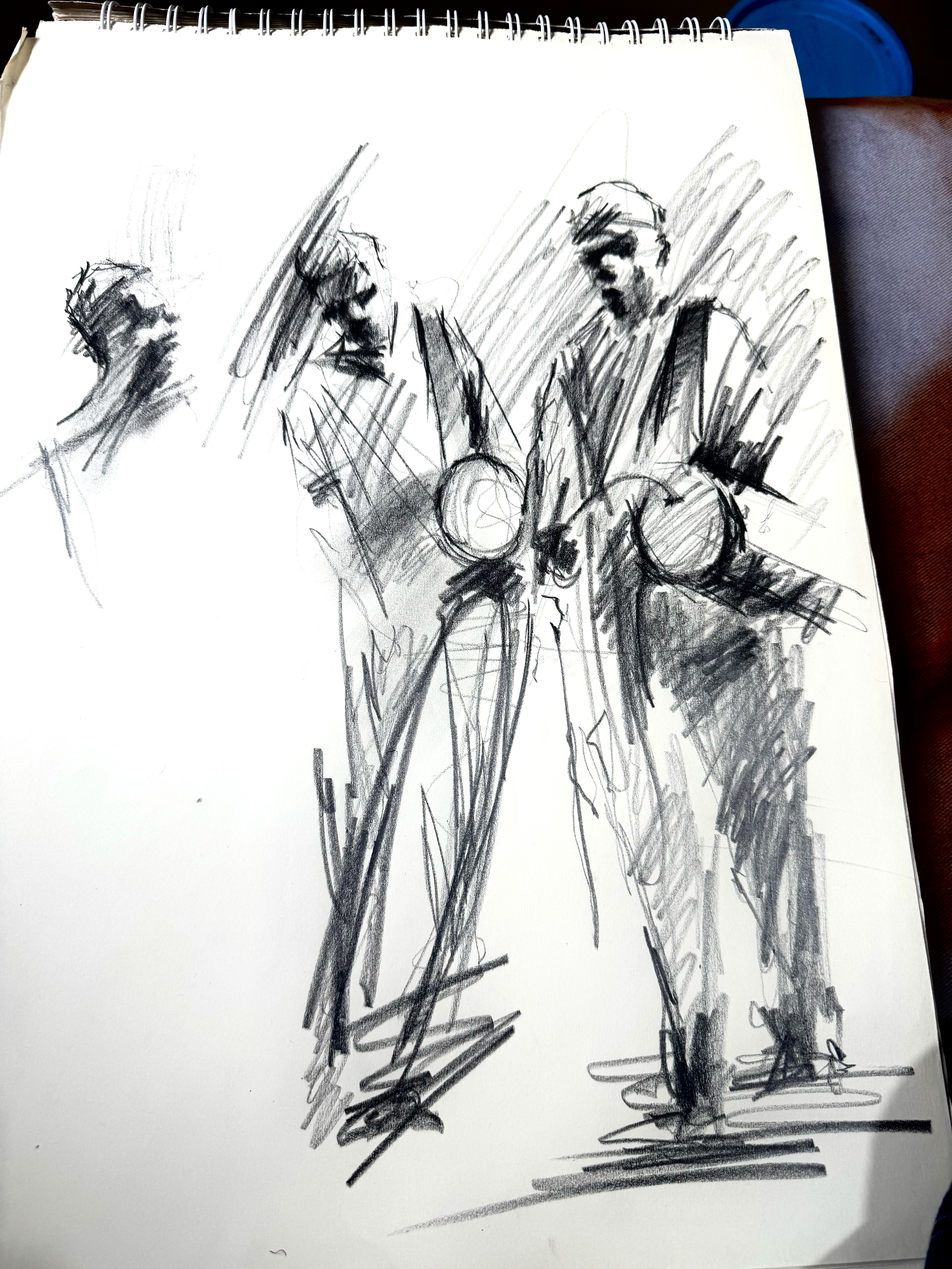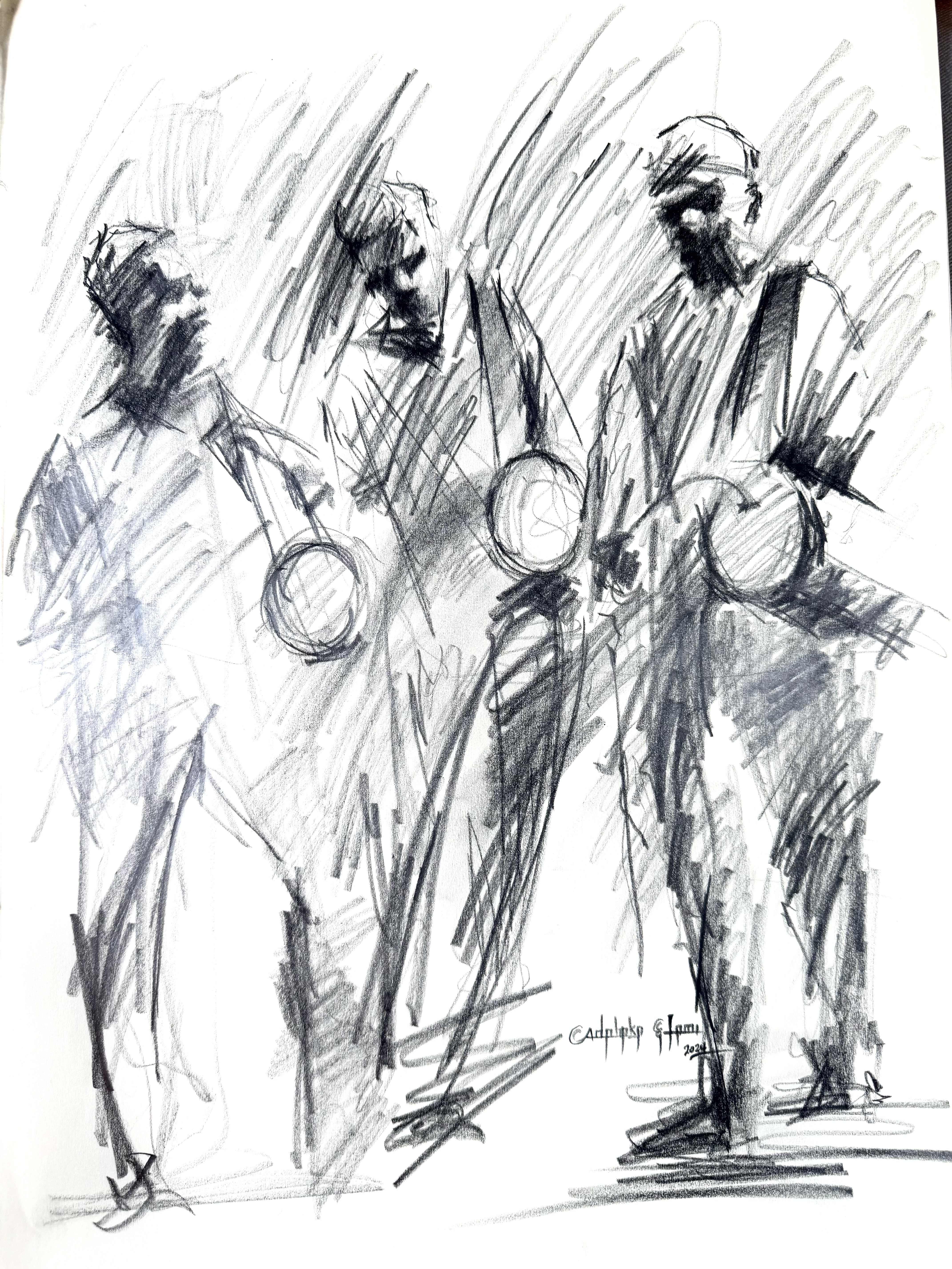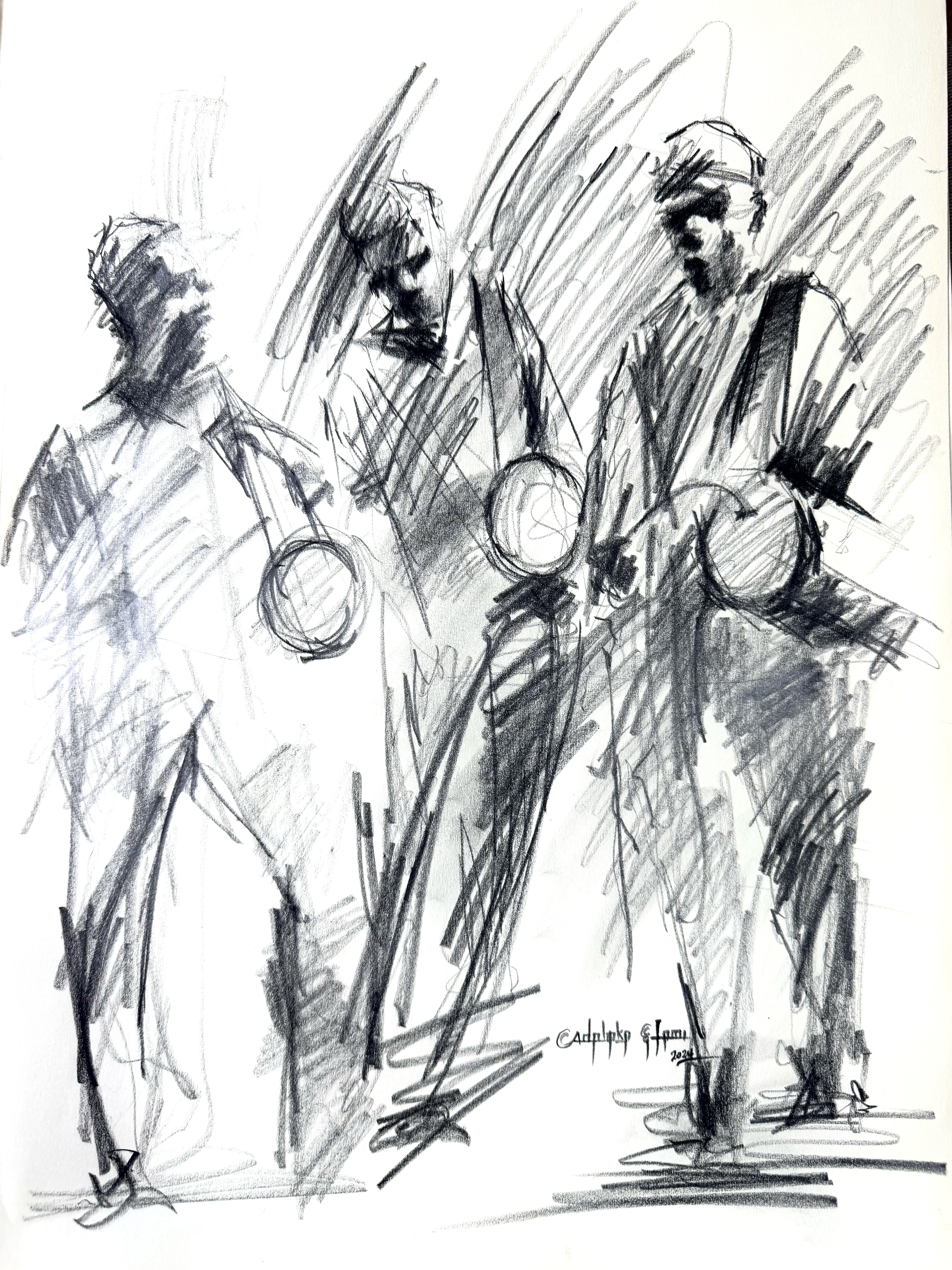 Moved by their presence, I couldn’t resist taking a picture to capture the essence of the moment. As soon as I got home, I translated that inspiration into this drawing, allowing my strokes to flow intentionally, mirroring the rhythm and movement I witnessed. Each line carries the spontaneity and vibrancy of their music, a visual ode to the spirit of the drummers who brightened my day. This artwork is not just a sketch but a celebration of the beautiful and unifying power of music.