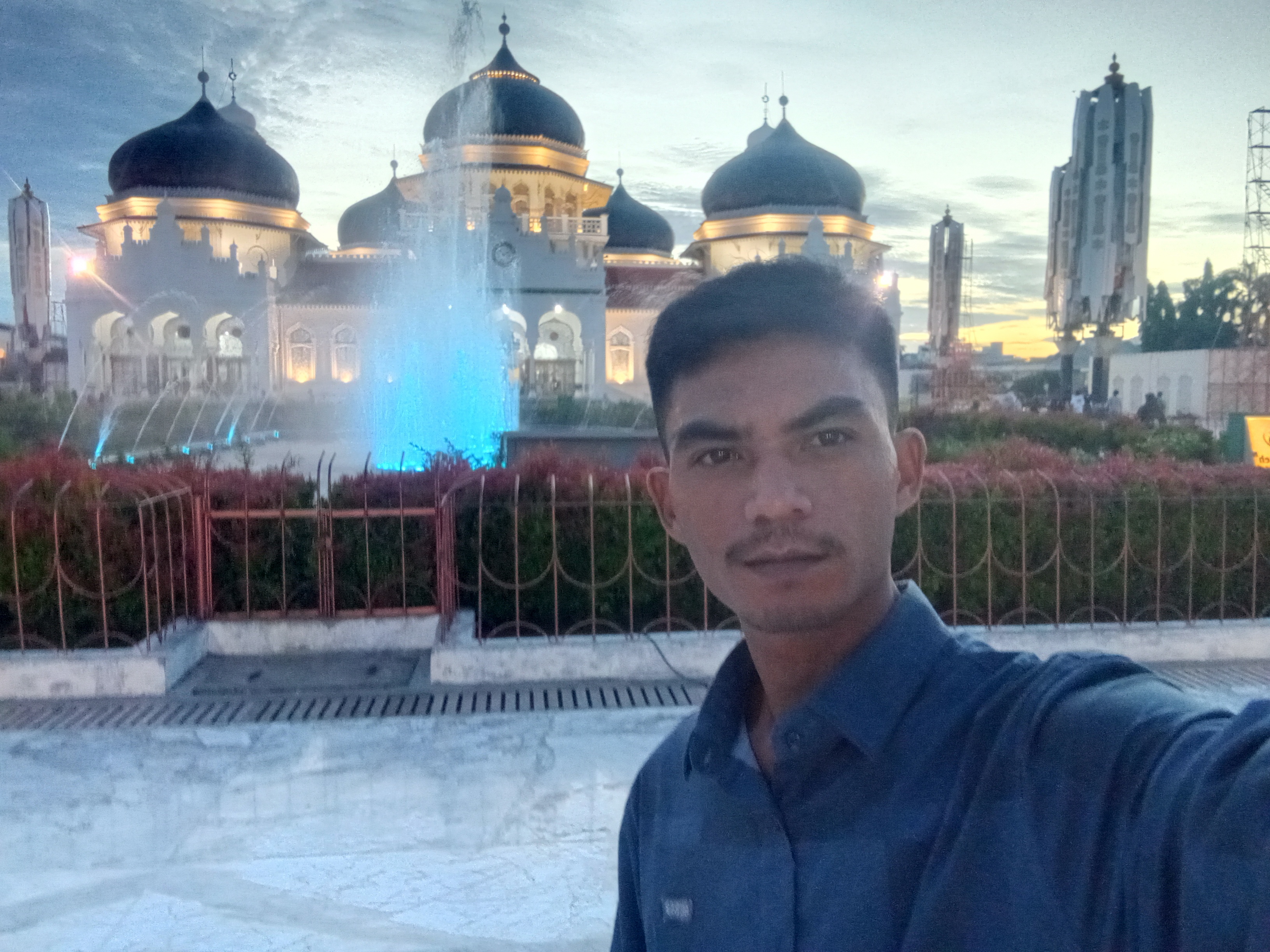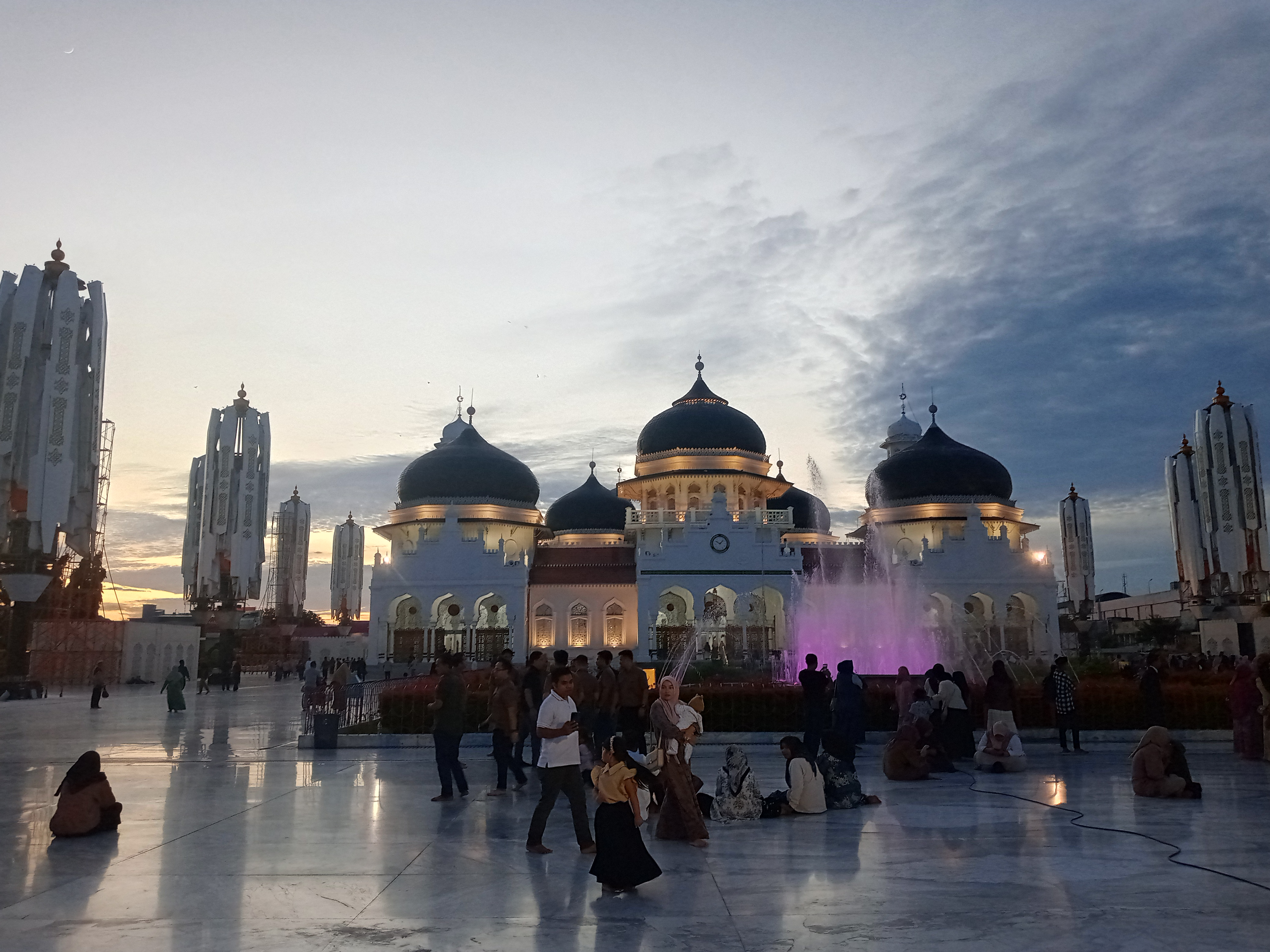 This is a story about the beauty of the Baiturrahman Grand Mosque in Banda Aceh City, Aceh Province, Indonesia. I stood in front of the mosque before performing the Maghrib prayer to admire the beauty of this historic mosque. The fountain in the garden in front of the mosque displays various colors and follows the rhythm of the call to prayer.
