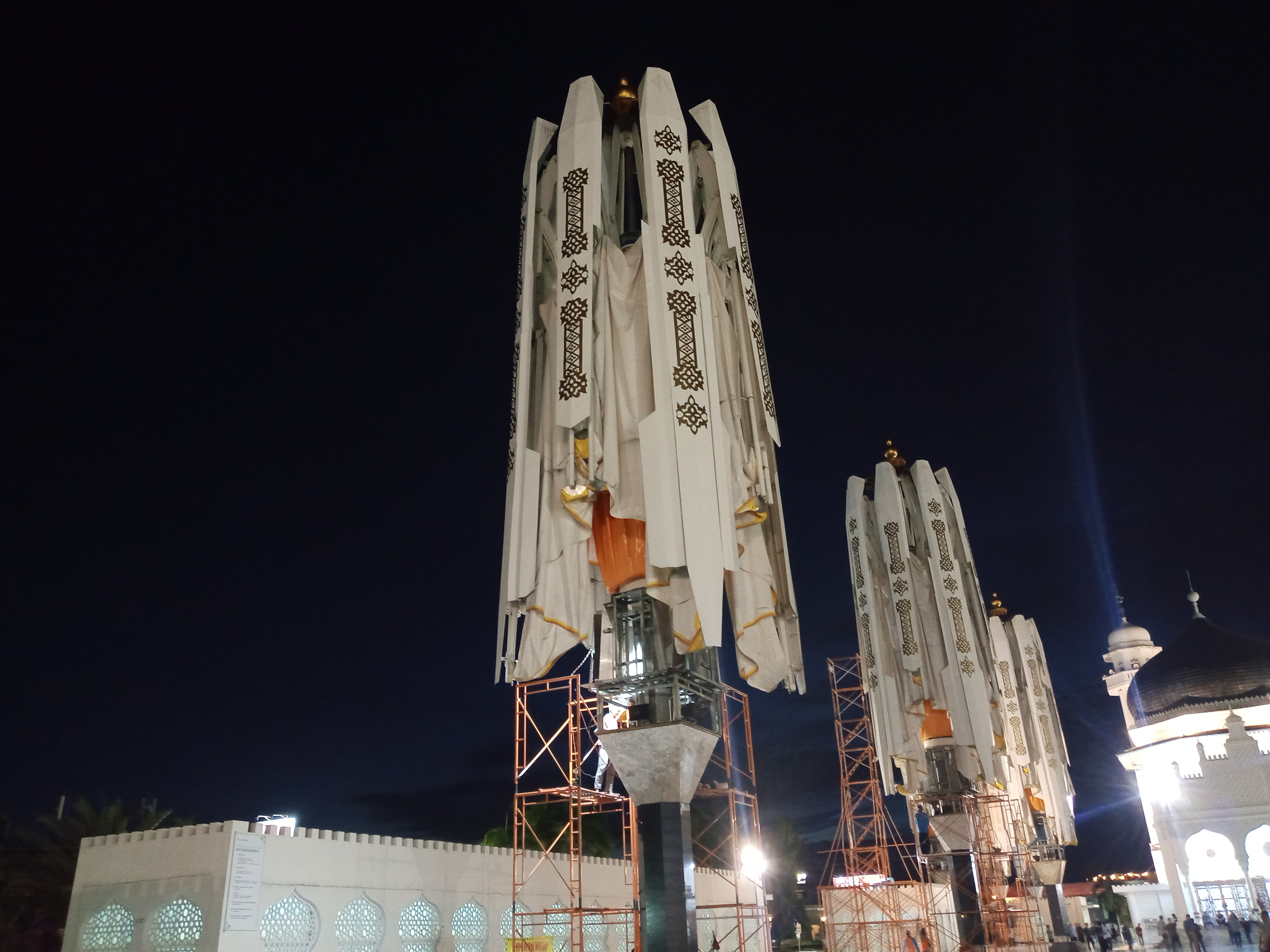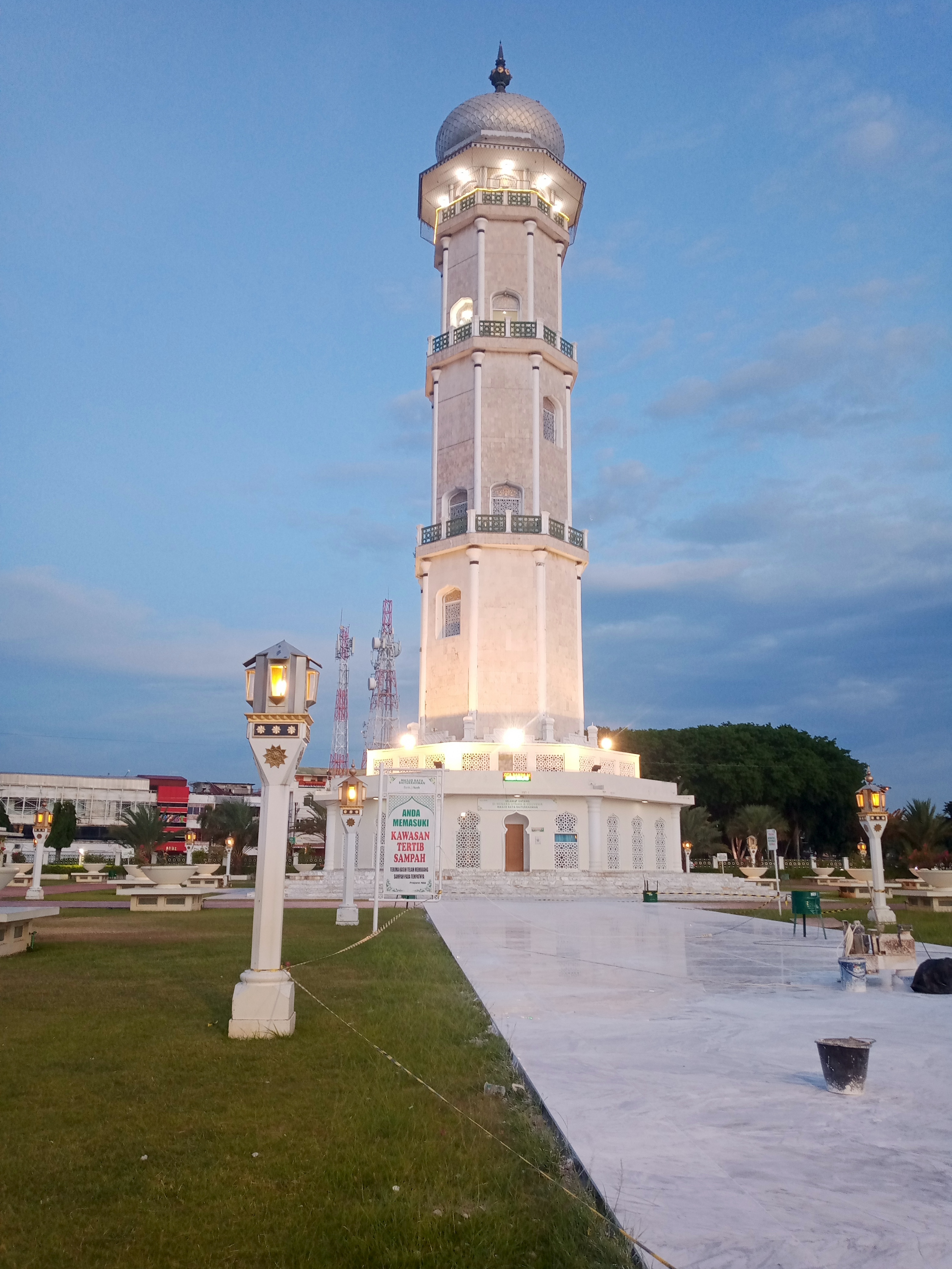 One mosque tower rises high on the eastern side of the mosque which can be seen from all sides of the city of Banda Aceh, the tall white tower is also decorated with lights to make the tower visible from afar, the dome of the tower is white and several lights are lit on top of the tower.