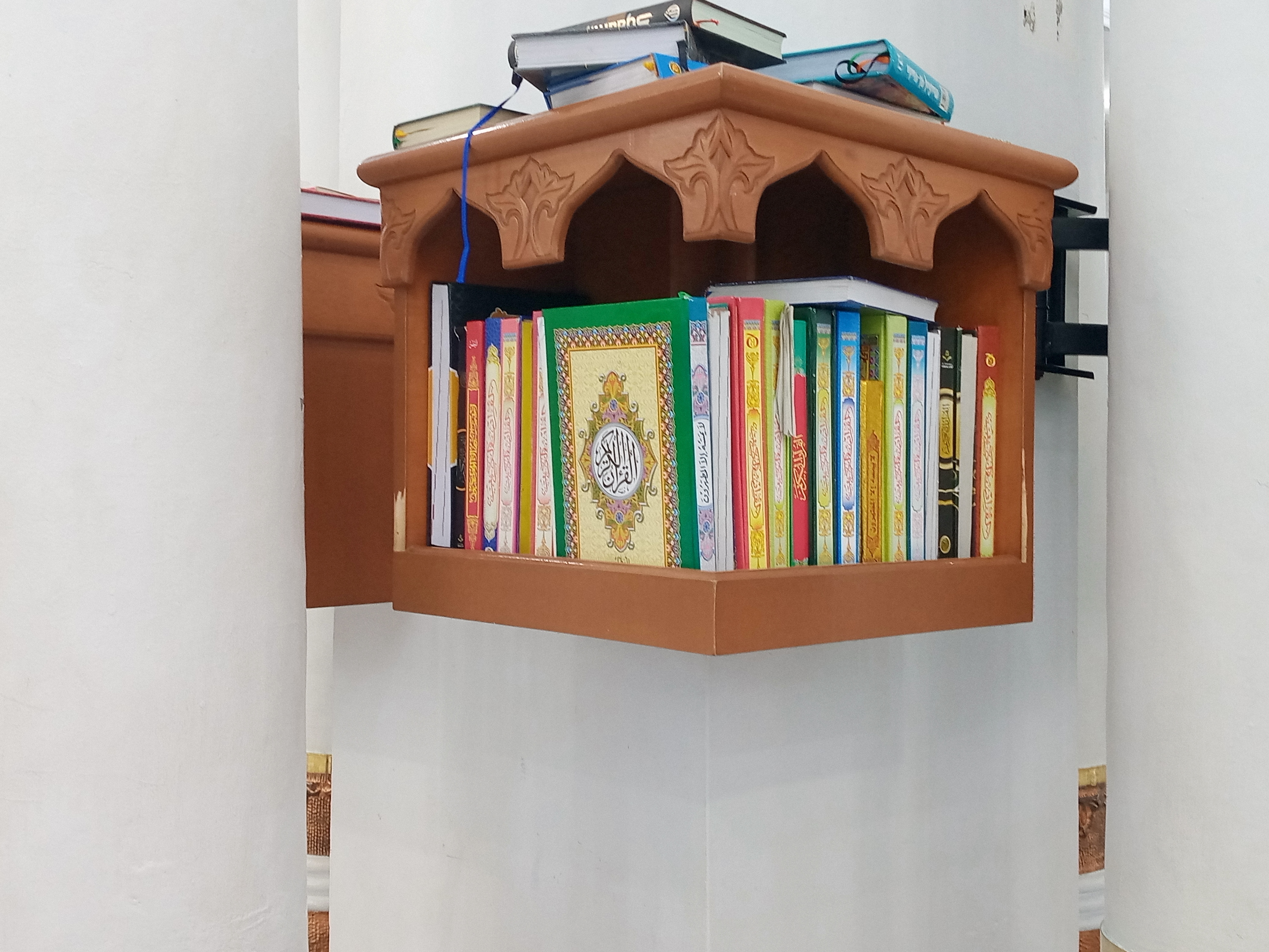 The holy book of the Qur'an and several other book activities are neatly arranged on the table and anyone can take and read it, with the storage place for the holy book of the Qur'an, it makes it easier for the congregation to take and read the holy book of the Qur'an, the place for the holy book of the Qur'an is in several parts and we will see these books neatly arranged on all the pillars of the mosque.