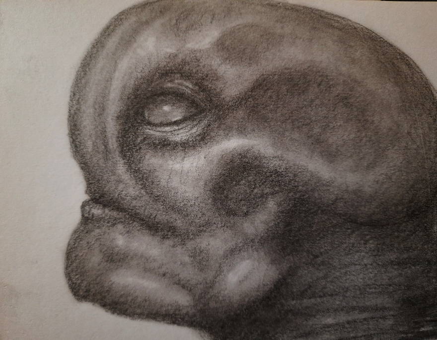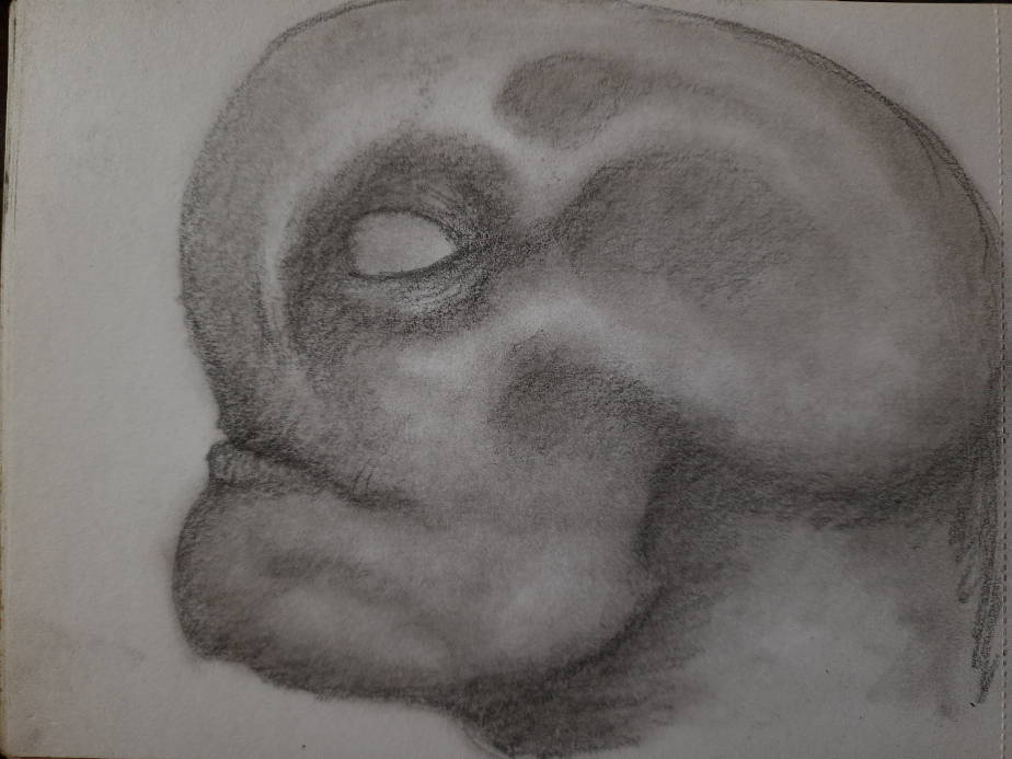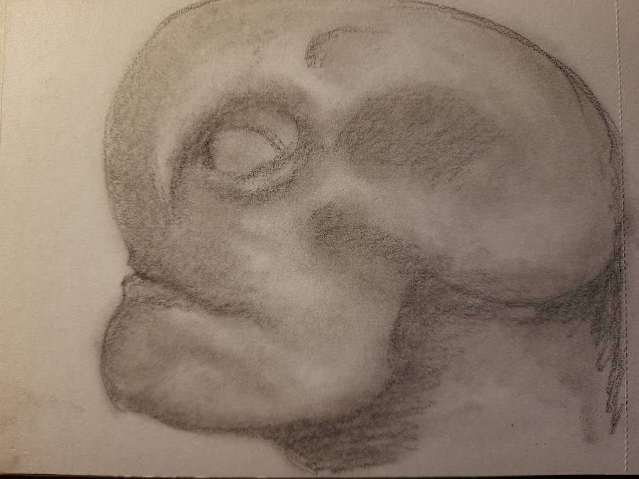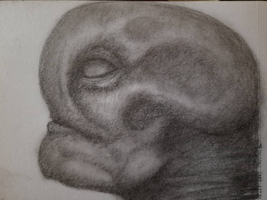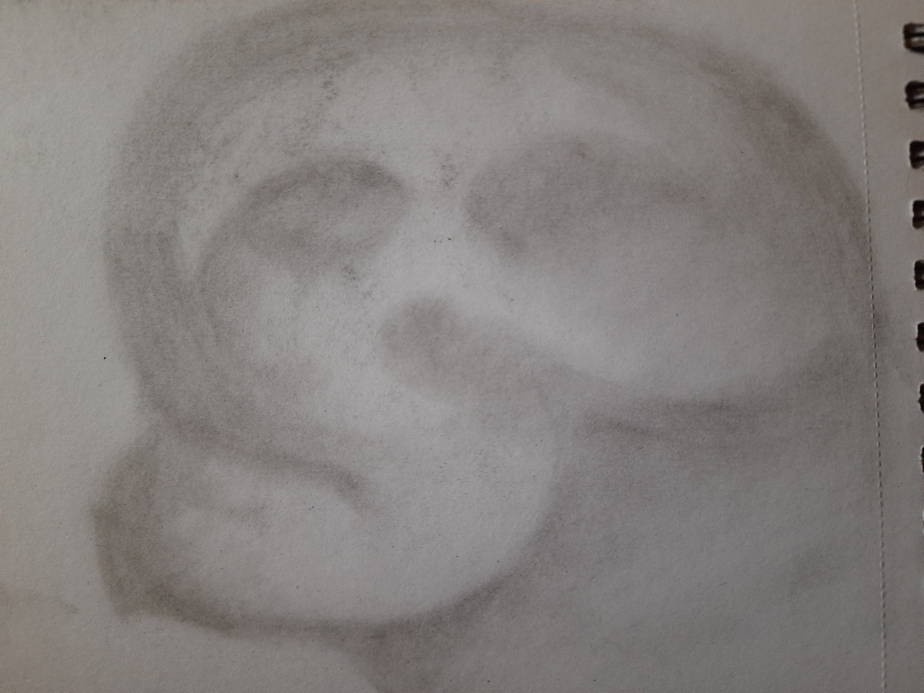 The process for this started with laying down a rough shape with a cotton ball and black pastel chalk, I then use a cotton bud to refine the shapes before using Staedtler Mars black pencils. (4B,8B)