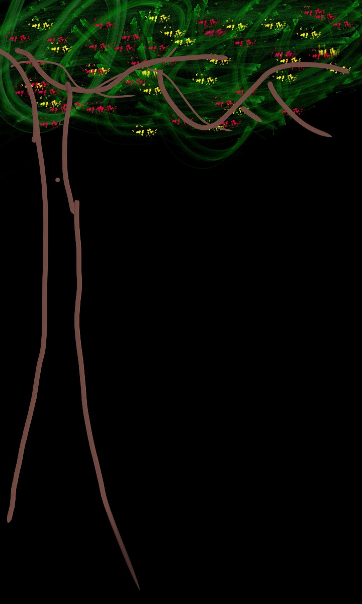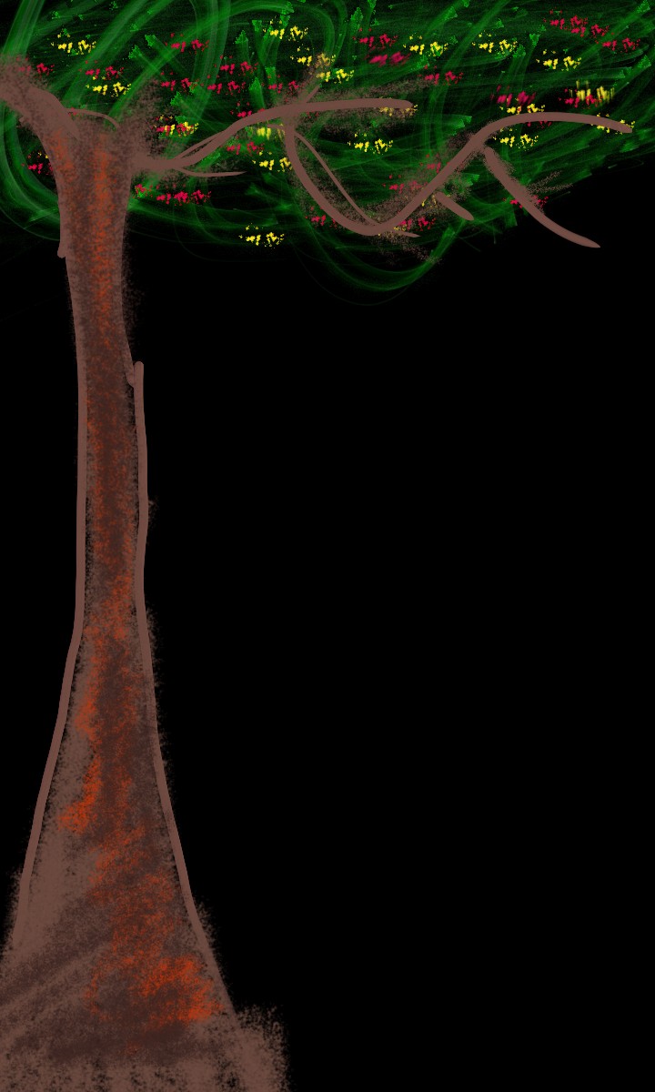 At the top, the focus shifts to a more gestural and expressive feel. The leaves and flowers are depicted with a more abstract and animated touch using circular movements and vibrant green, red, and yellow colors.
