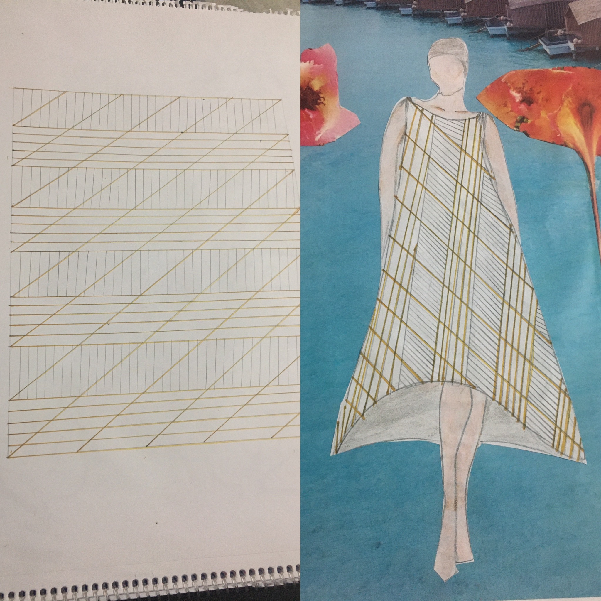 And I made another design. I drew it on the dress. It was different and beautiful. It was the intersection of straight lines. The yellow color was beautiful above the black lines. One of the colors of the year 2021 is yellow.
