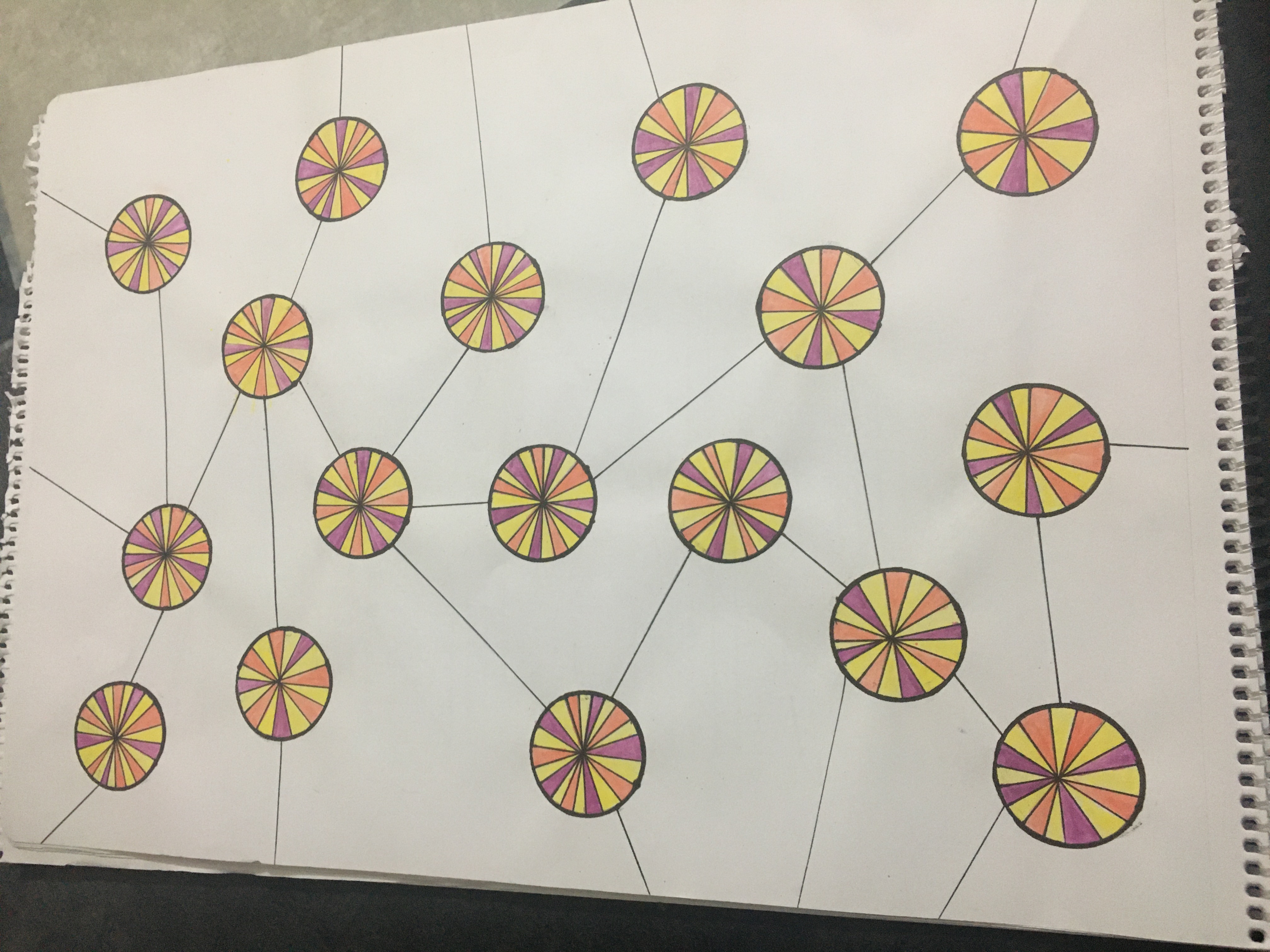 And I made some drawings. First, I made pattern designs. I let it happen. Whatever my hands wanted to do. I used round and straight line together in one of the patterns. I also cut the circles into slices and paint each one separately. Round and straight line contrast. I think it's a nice fit.