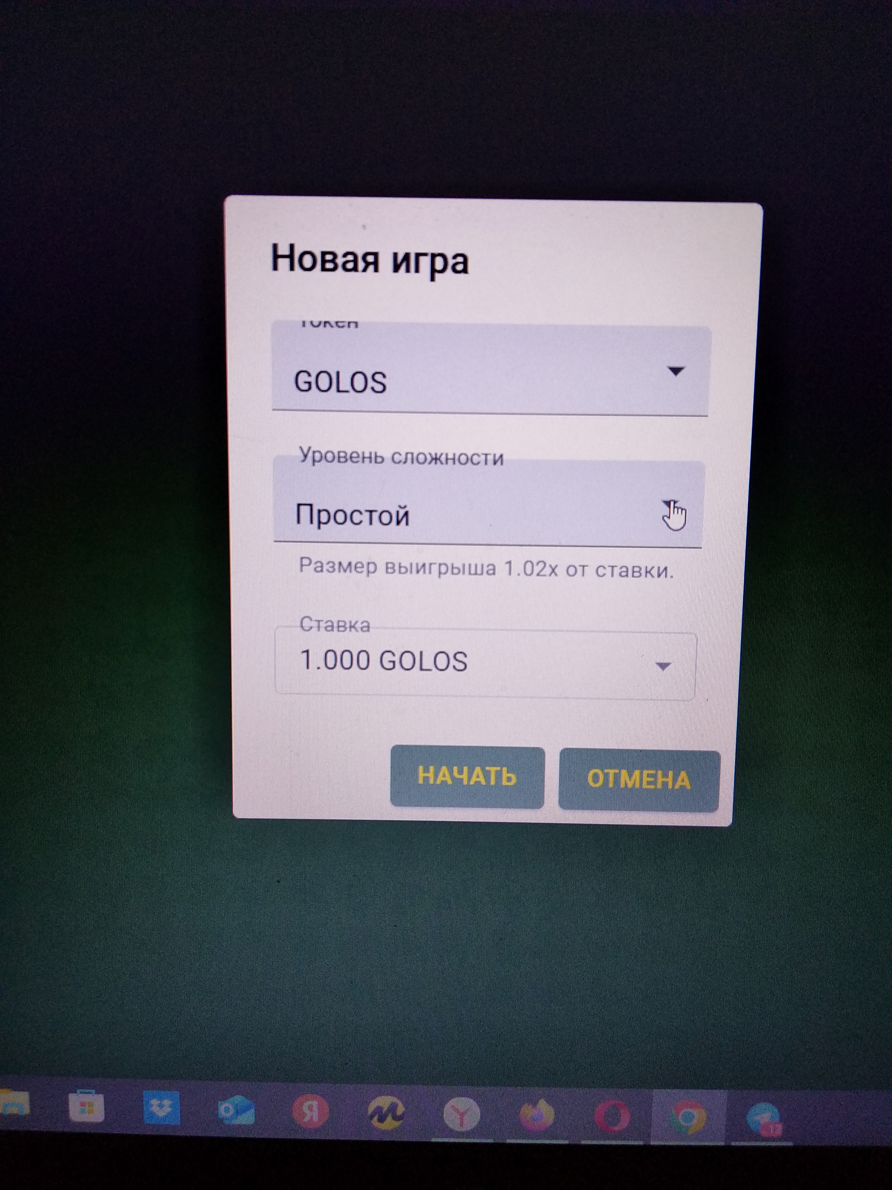 Как только организационные моменты решили, так и приступаем к игре. Нажимаем новая игра, выпадает окно - вам какую, простую, сложную? Выбираете, нажимаете и опять вам предлагается сделать ставку - 4. 6. 10. 20.50.100 Golos, на Cтимите могут быть свои ставки.