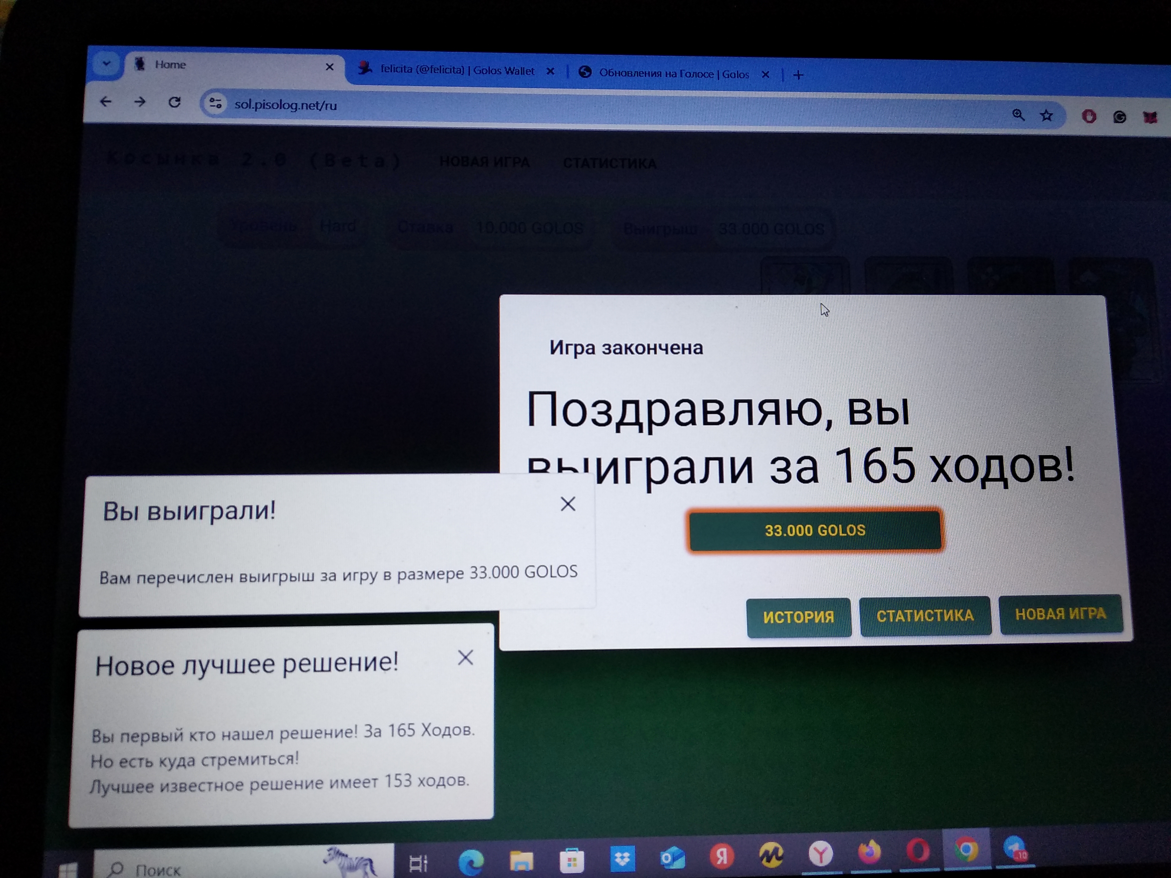 Игровой сервис тут же дает статистику выигрышей и проигрышей всех участников, можно видеть лидеров, по результатам выигрыша можно видеть статистику о своем личном выигрыше: к примеру - лучший результат по количеству ходов, вы их сделали меньше по сравнению с другим участников. Раньше был поздравительный бонус, добавлялось несколько монет к выигрышу.