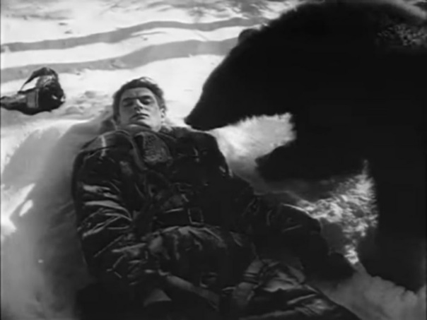Был ужасный жестокий бой в небе, его самолет был подбит и он на парашюте смог спуститься в новгородские леса. Был апрель, лежал снег, было холодно, несмотря на начинающуюся весну. Когда летчик очнулся, он увидел перед собой живого медведя, который проснулся среди зимы от спячки и грохота небесного боя, хотел съесть человека. Приблизился к лицу, понюхал, стал царапать костюм летчика и в этот момент Маресьев вспомнил, что у него в планшете есть пистолет и он застрелил медведя в упор! Затем придя в себя после схватки с медведем решил встать на ноги, чтобы пробираться к своим, он понял, что не может стоять на ногах, т.к. ступни были раздроблены и его ноги так распухли, что чуни на ногах все были в крови и снять их было невозможно.