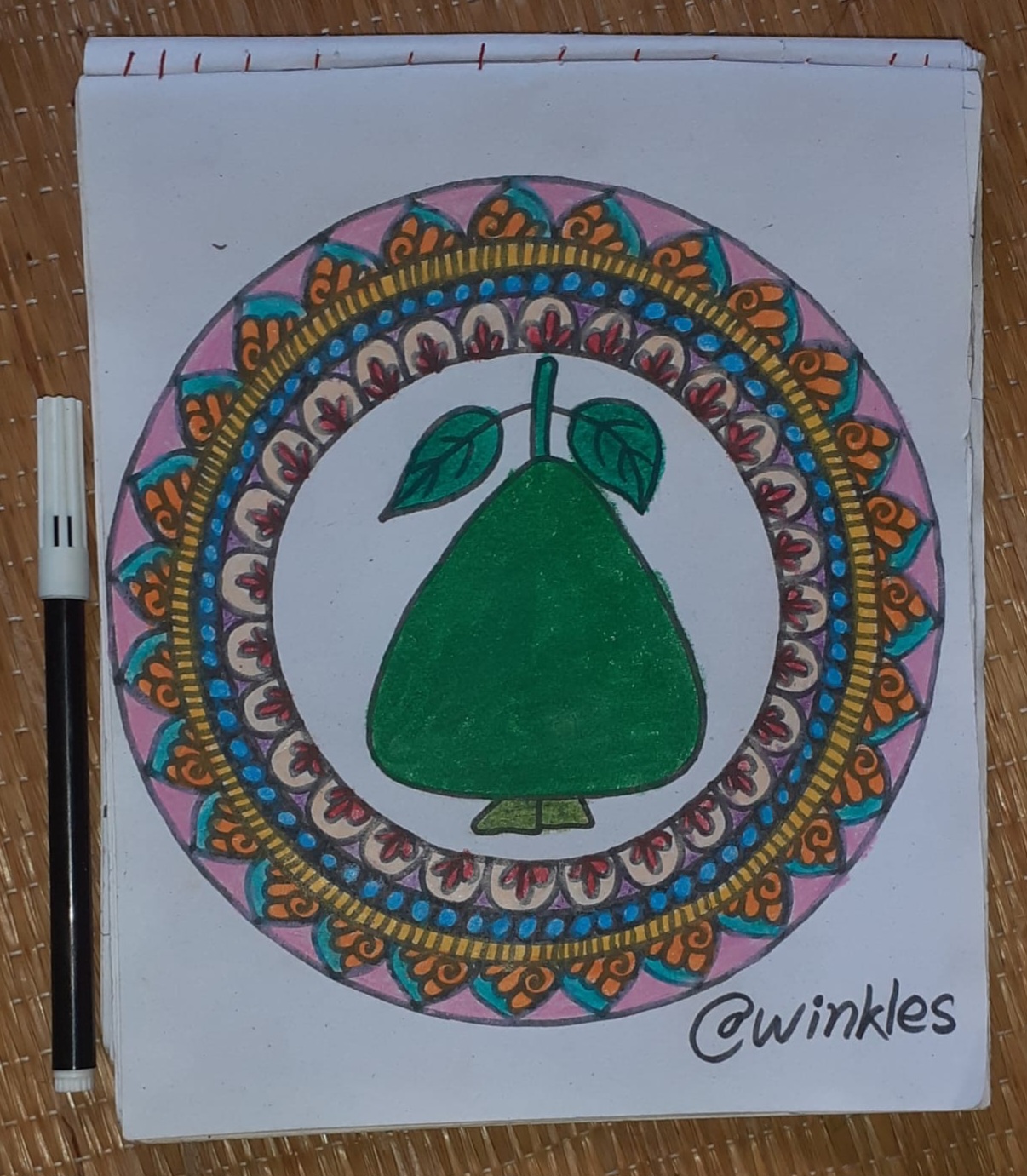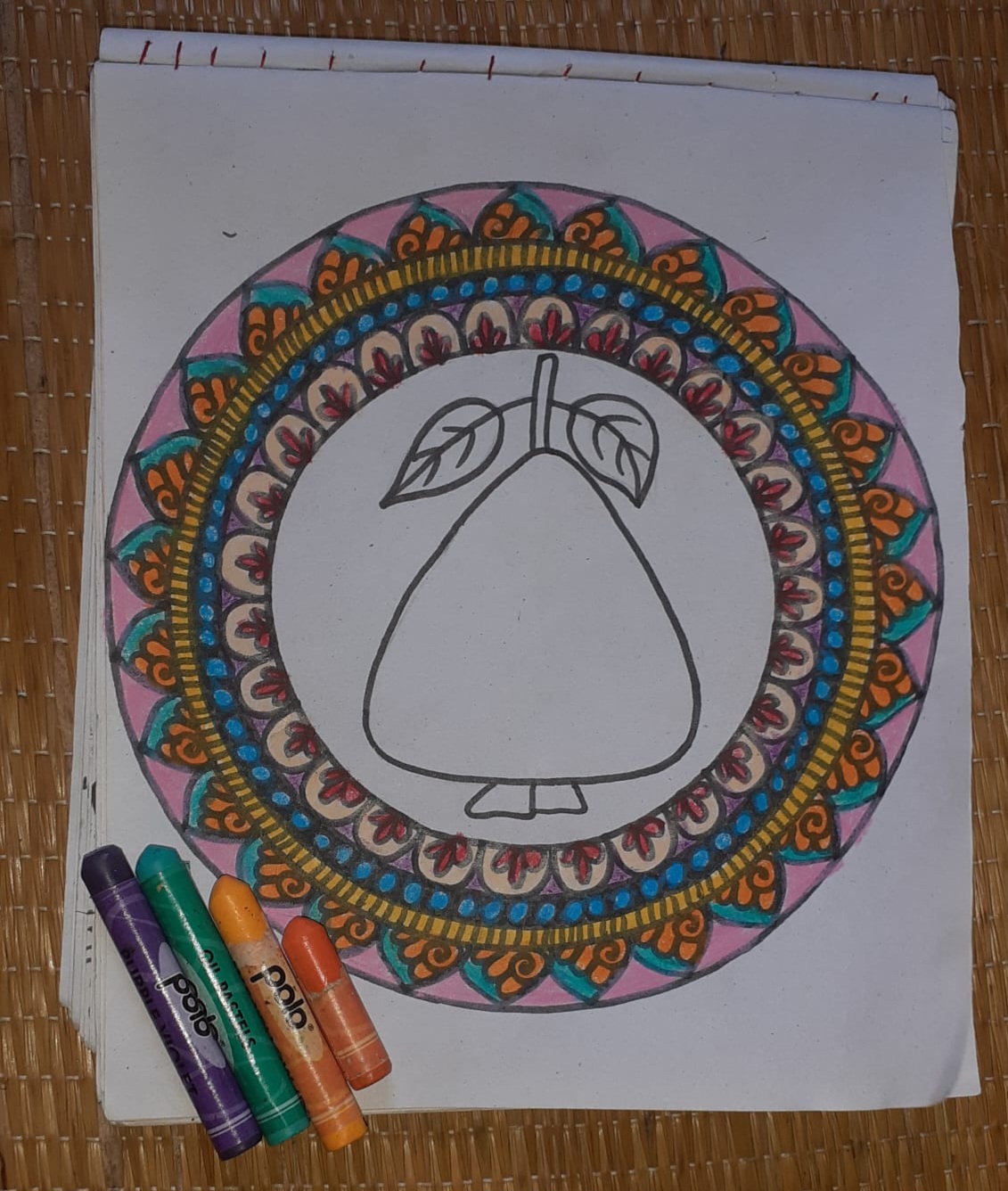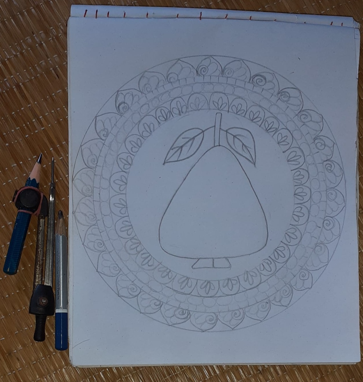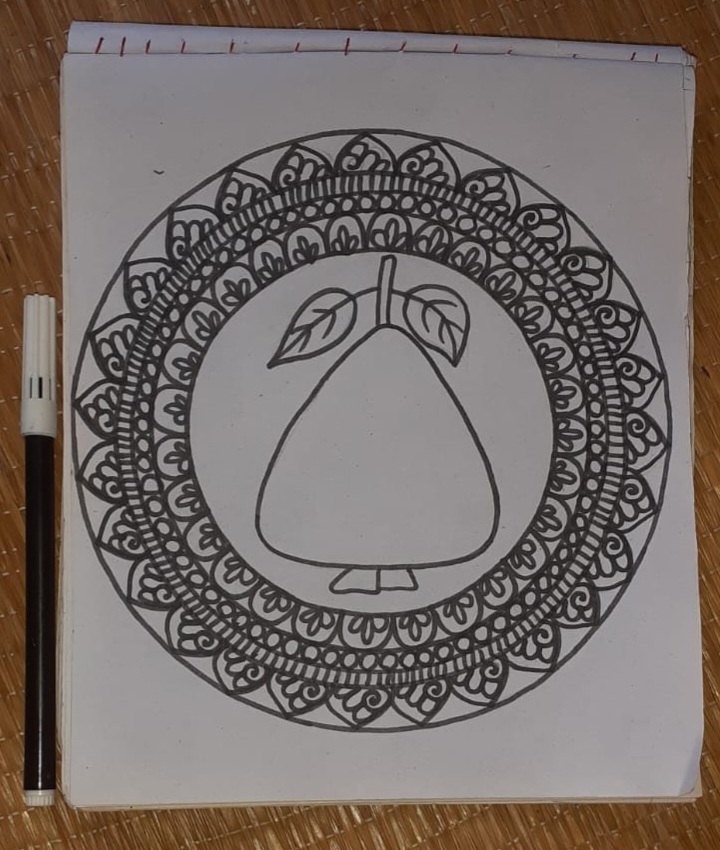 ▶️প্রথম ধাপে- স্কেচ পেন্সিল দিয়ে একটি পেয়ারার সম্পূর্ণ আর্ট করে নিয়েছিলাম। এরপর তাকে ঘিরে কয়েকটা বৃত্ত এঁকে নিয়েছিলাম এবং সেই বৃত্তের প্রতিটা জায়গায় বিভিন্ন ধরণের ম্যান্ডেলা ডিজাইন তৈরী করে নিয়েছিলাম।