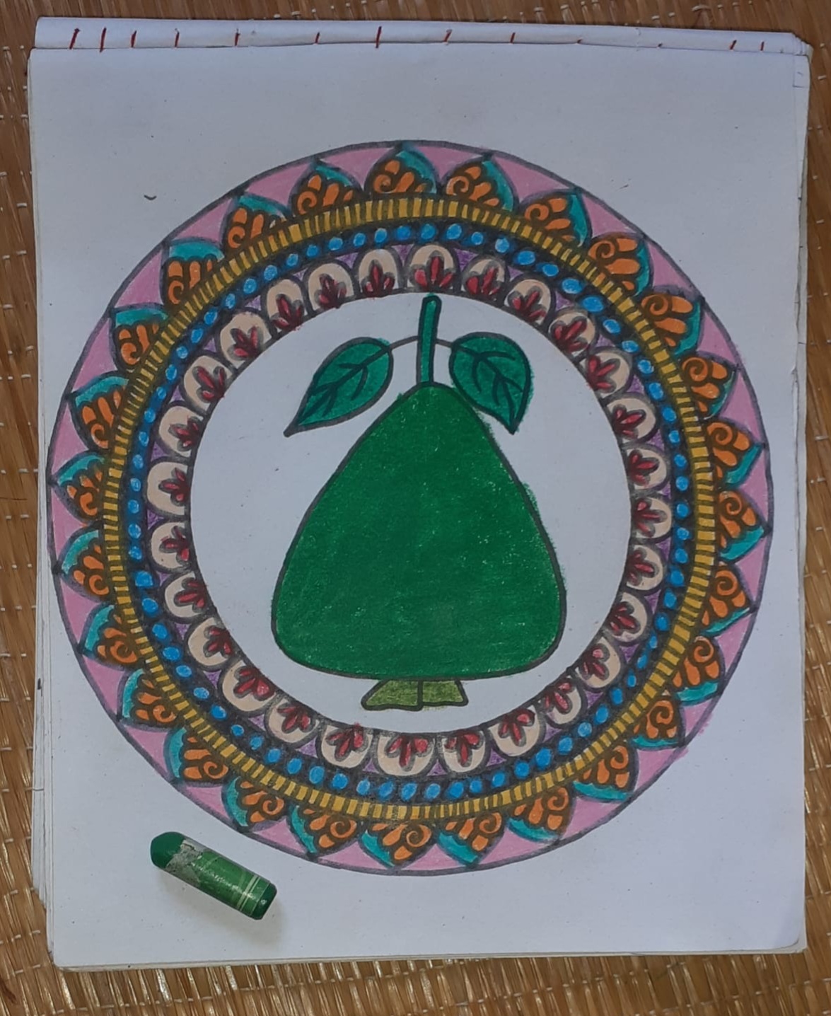 ▶️চতুর্থ ধাপে- মোম রং দিয়ে পেয়ারাটিকে সম্পূর্ণ কালার করে অরিজিনাল দৃশ্য তুলে ধরেছিলাম। এরপর অঙ্কন এখানেই সমাপ্ত করেছিলাম।