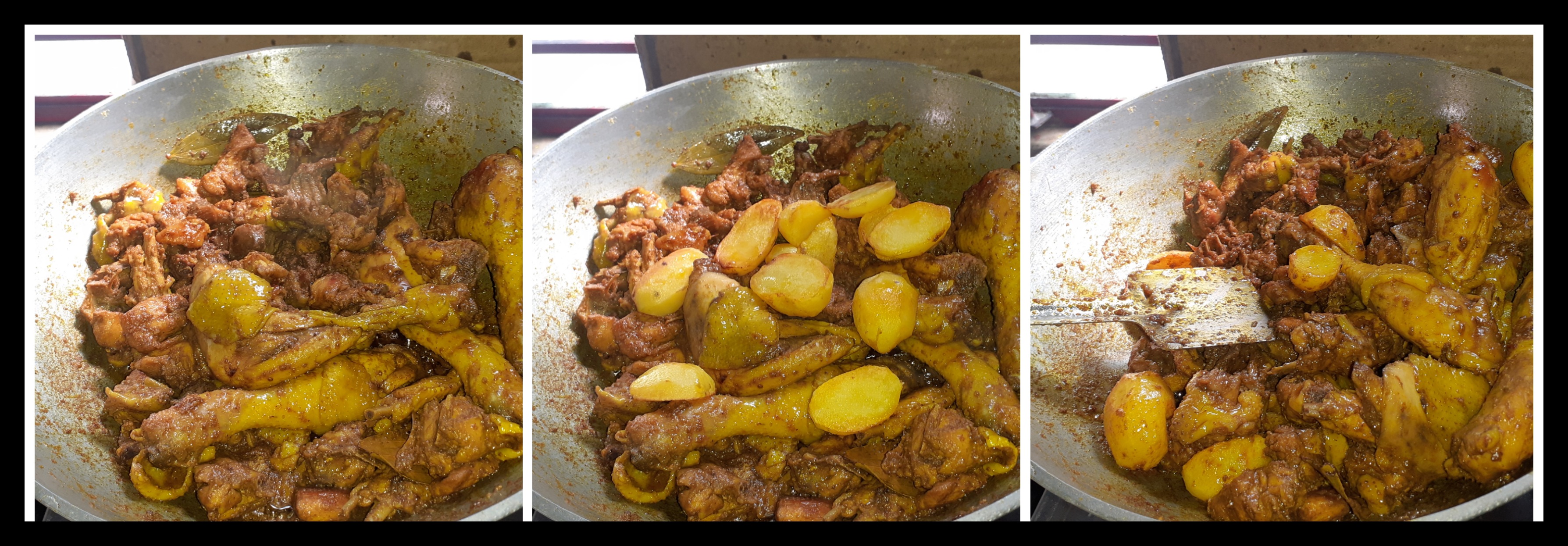 ➤মাংস ভালোমতো কষানো হয়ে গেলে তাতে ভাজা আলু দিয়ে দিয়েছিলাম এবং আলু মাংসের সাথে নেড়ে মিশিয়ে নিয়েছিলাম। মাঝখানে একটা কথা বলি মাংস একটু খাওয়ার মতো হয়ে আসলেই আমি পুরোপুরি কষা হওয়া পর্যন্ত আমি কিন্তু খেতে থাকি😀।