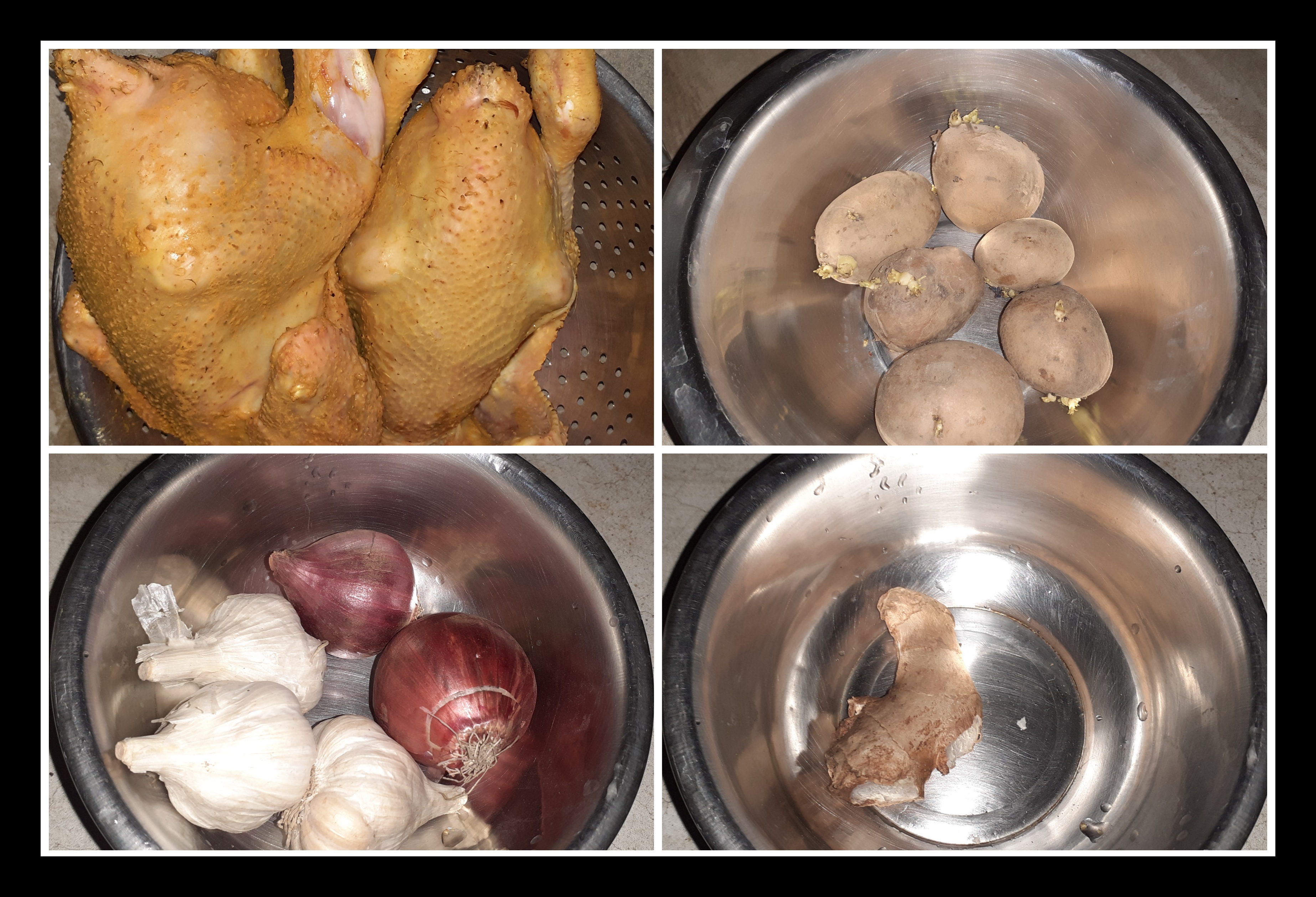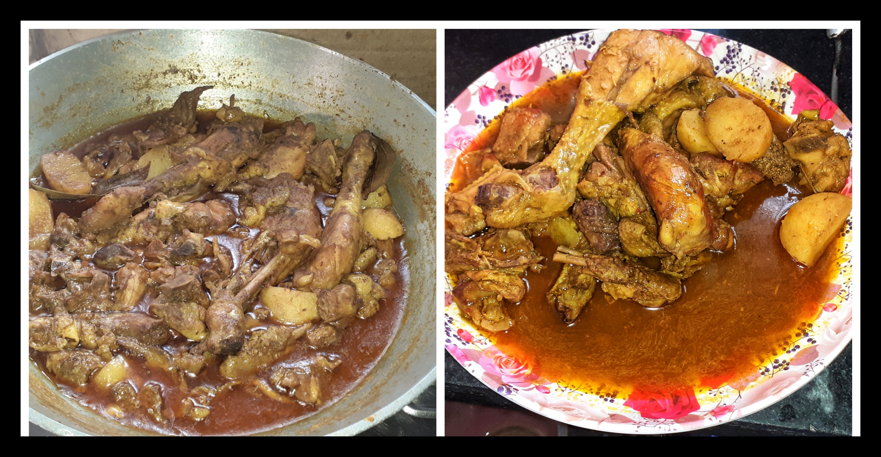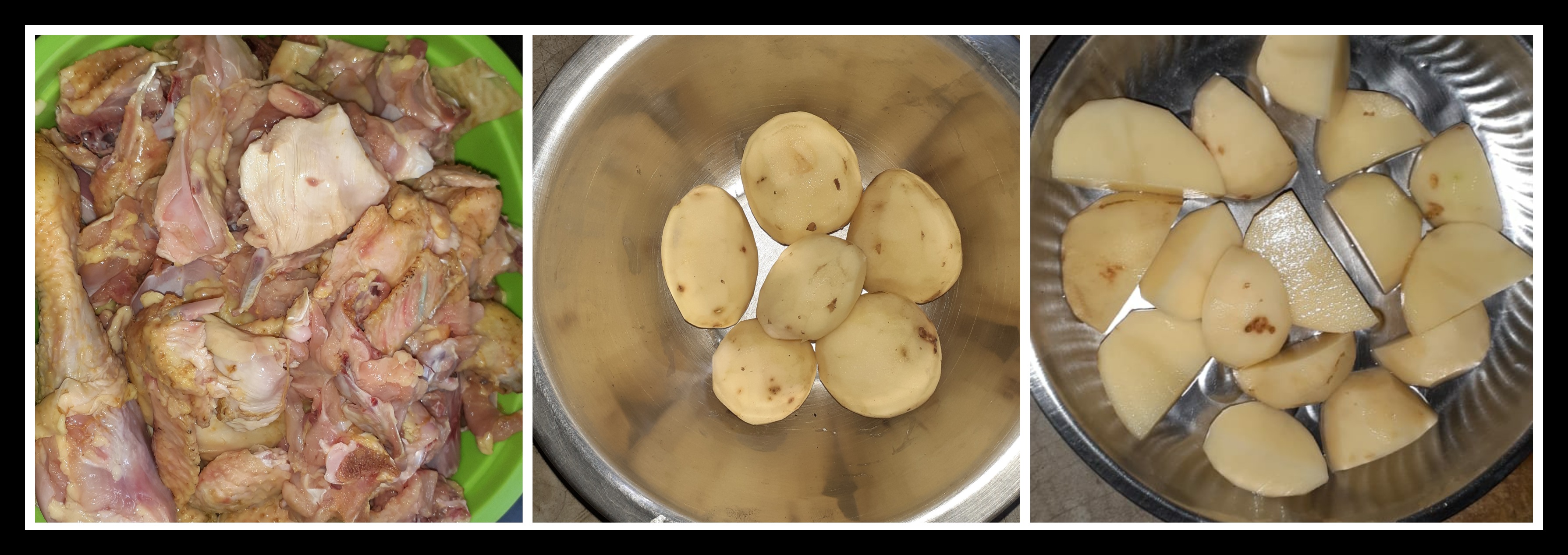 ➤মুরগি দুটোর লোম প্রথমে ফেলে দিয়েছিলাম এবং আগুনে একটু শেক দিয়ে নিয়েছিলাম। এরপর আস্তে আস্তে দুটিকেই কেটে নিলাম এবং জল দিয়ে ভালো করে ধুয়ে নিয়েছিলাম। আলুর খোসা ফেলে দিয়েছিলাম এবং কেটে পিচ করে নিয়েছিলাম।
