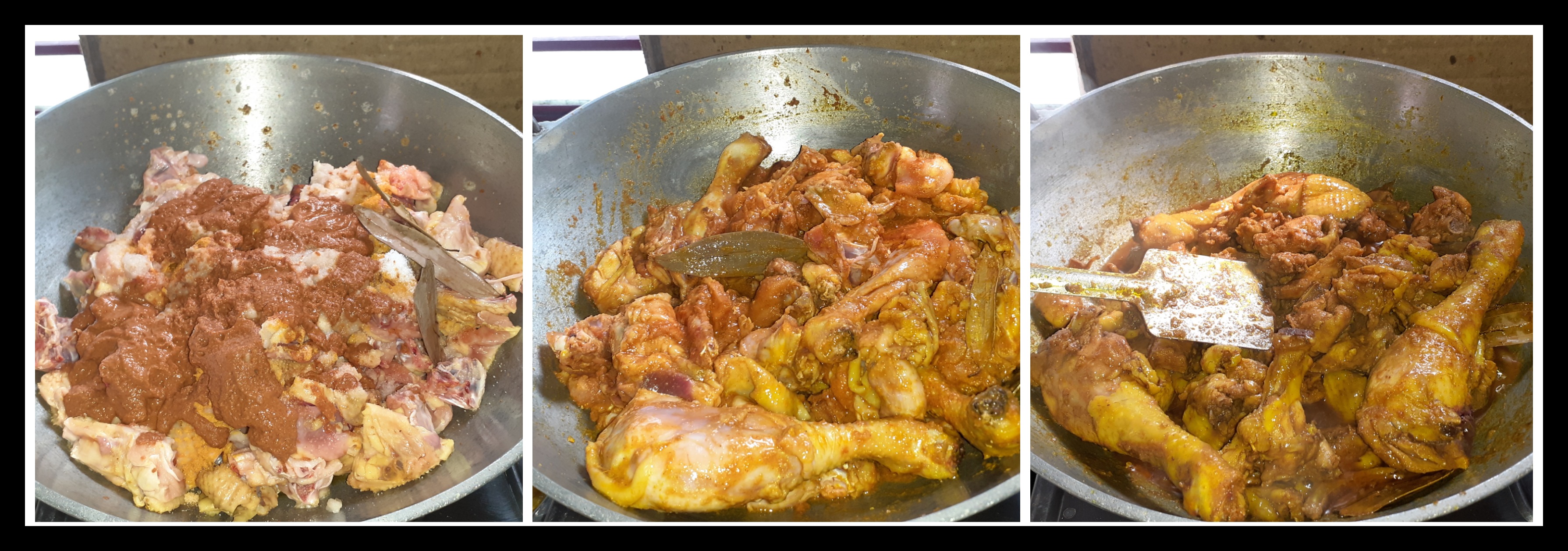 ➤কড়াইতে পরিমাণমতো তেল দিয়ে মাংসগুলো দিয়ে দিয়েছিলাম। তাতে তেজ পাতা এবং নির্দিষ্ট পরিমানে লবণ, হলুদ দিয়ে দিয়েছিলাম এবং পেস্ট করে রাখা মশলাগুলো দিয়ে দিয়েছিলাম। এরপর মাংসের সাথে সবগুলো ভালো করে মিশিয়ে কষাতে দিয়ে দিয়েছিলাম।