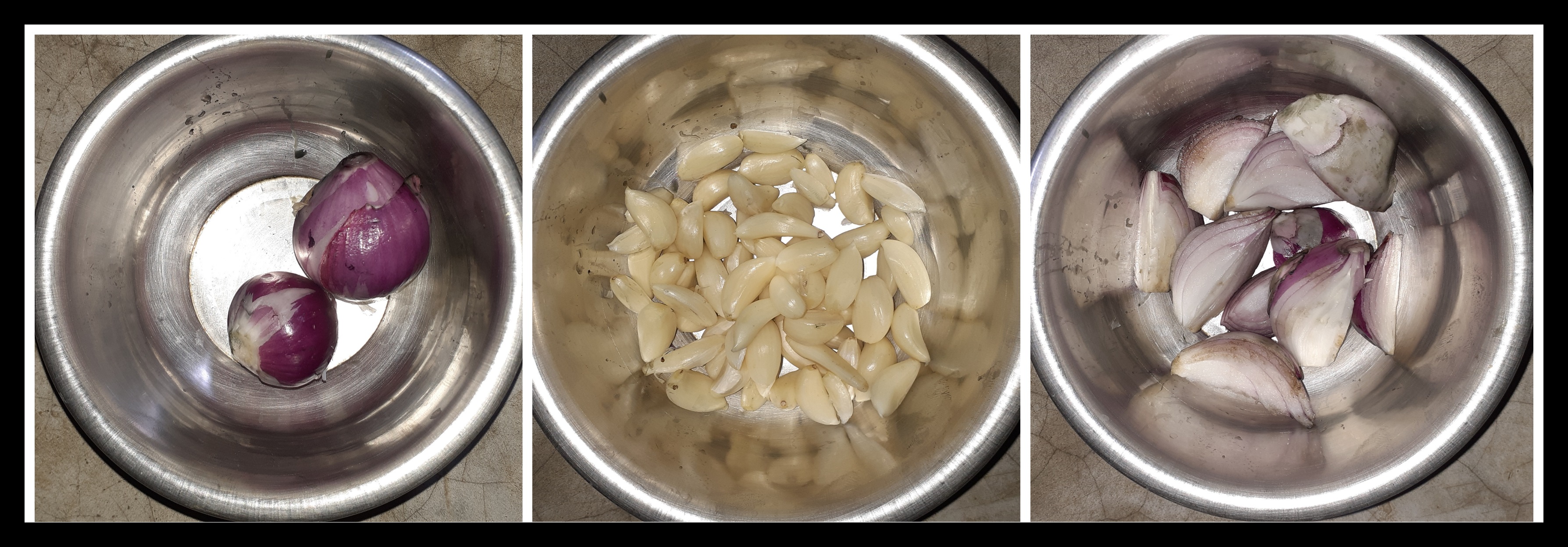 ➤পেঁয়াজ এবং রসুন এর খোসা ফেলে দিয়েছিলাম এবং রসুন ছাড়িয়ে নিয়েছিলাম। এরপর পেঁয়াজ কেটে নিয়েছিলাম।