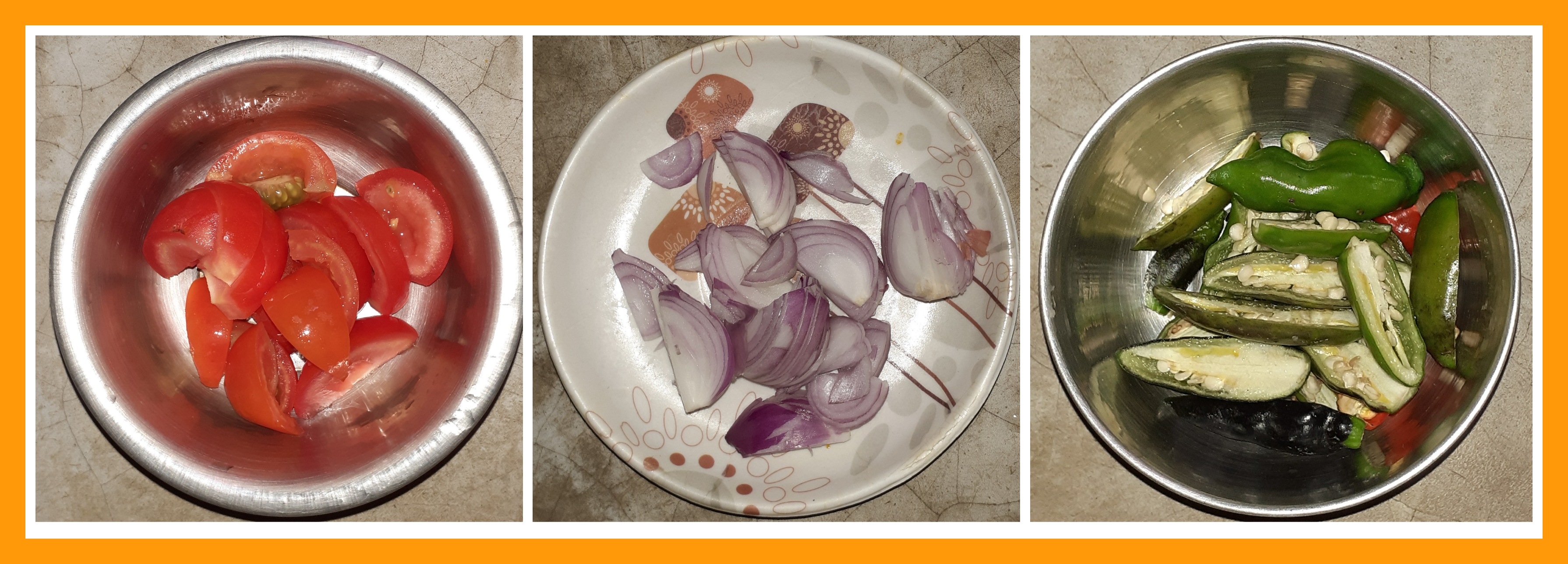 ➤টমেটো দুটি কেটে নিয়েছিলাম। পেঁয়াজ দুটির খোসা ছালিয়ে নিয়ে কেটে নিয়েছিলাম এবং সেই সাথে কাঁচা লঙ্কাগুলোও কেটে নিয়েছিলাম।