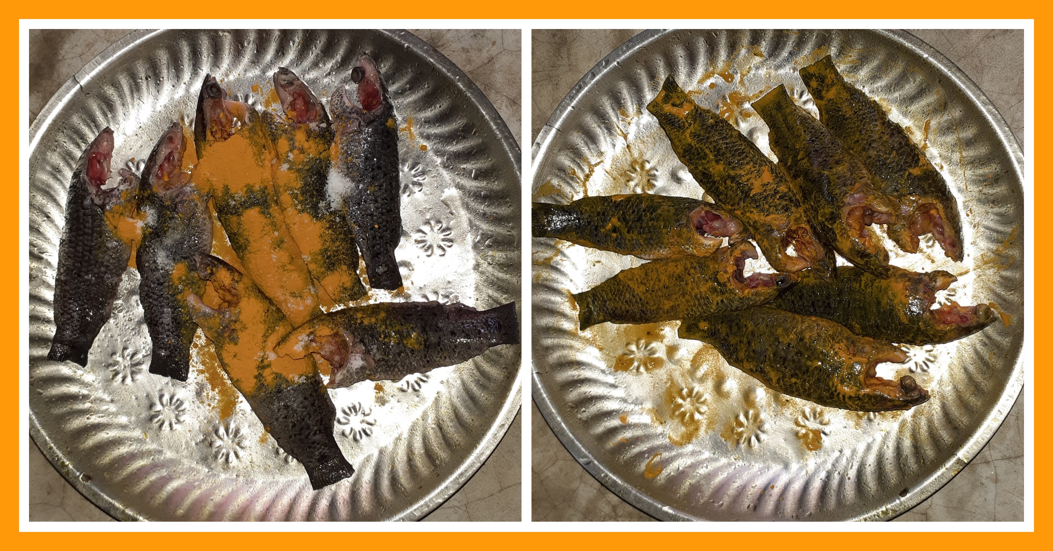 ➤কেটে রাখা সেই কই মাছের সব পিচগুলোতে লবন আর হলুদ দিয়ে দেওয়ার পরে হাত দিয়ে গায়ে মাখিয়ে নিয়েছিলাম।