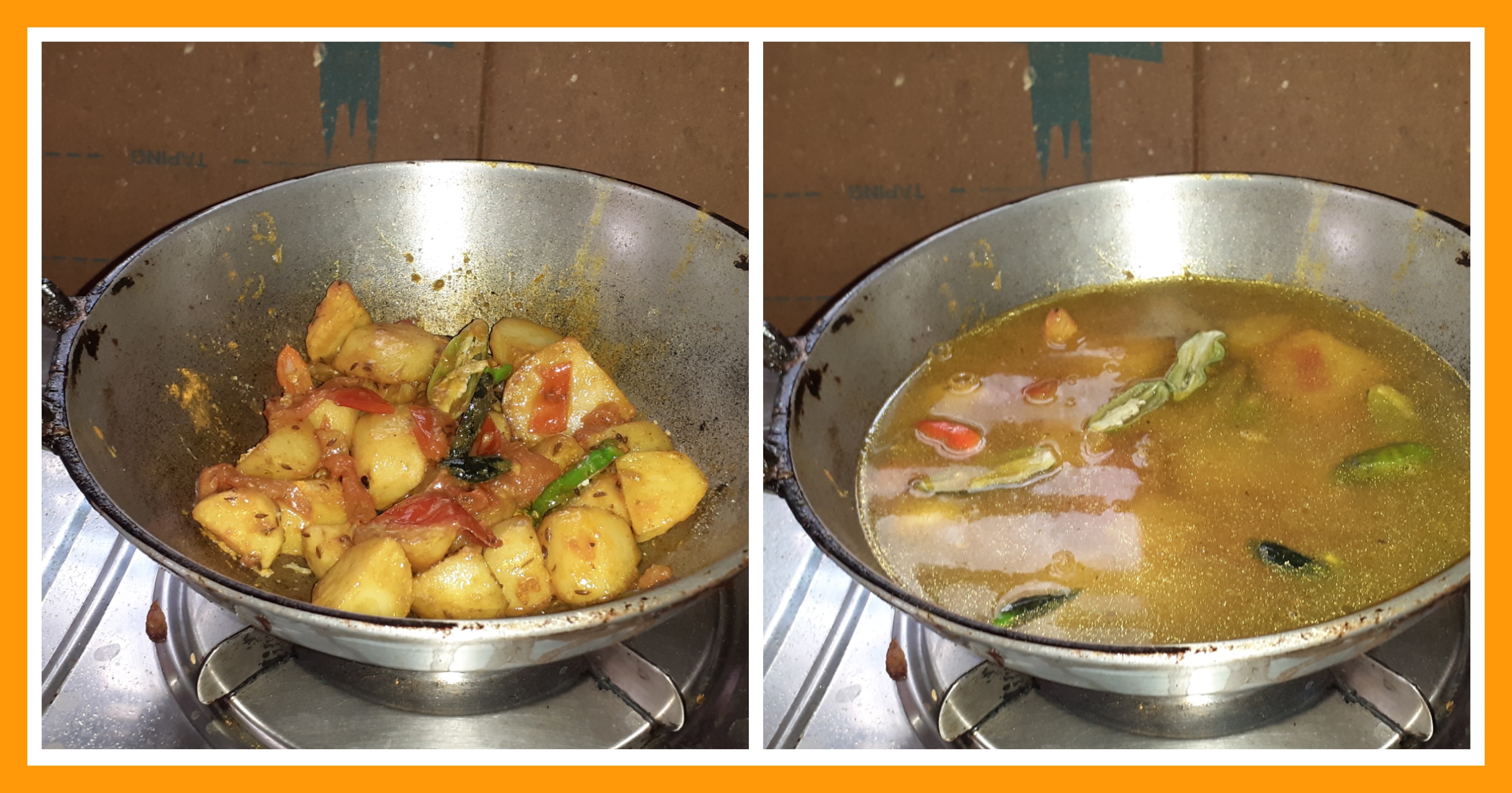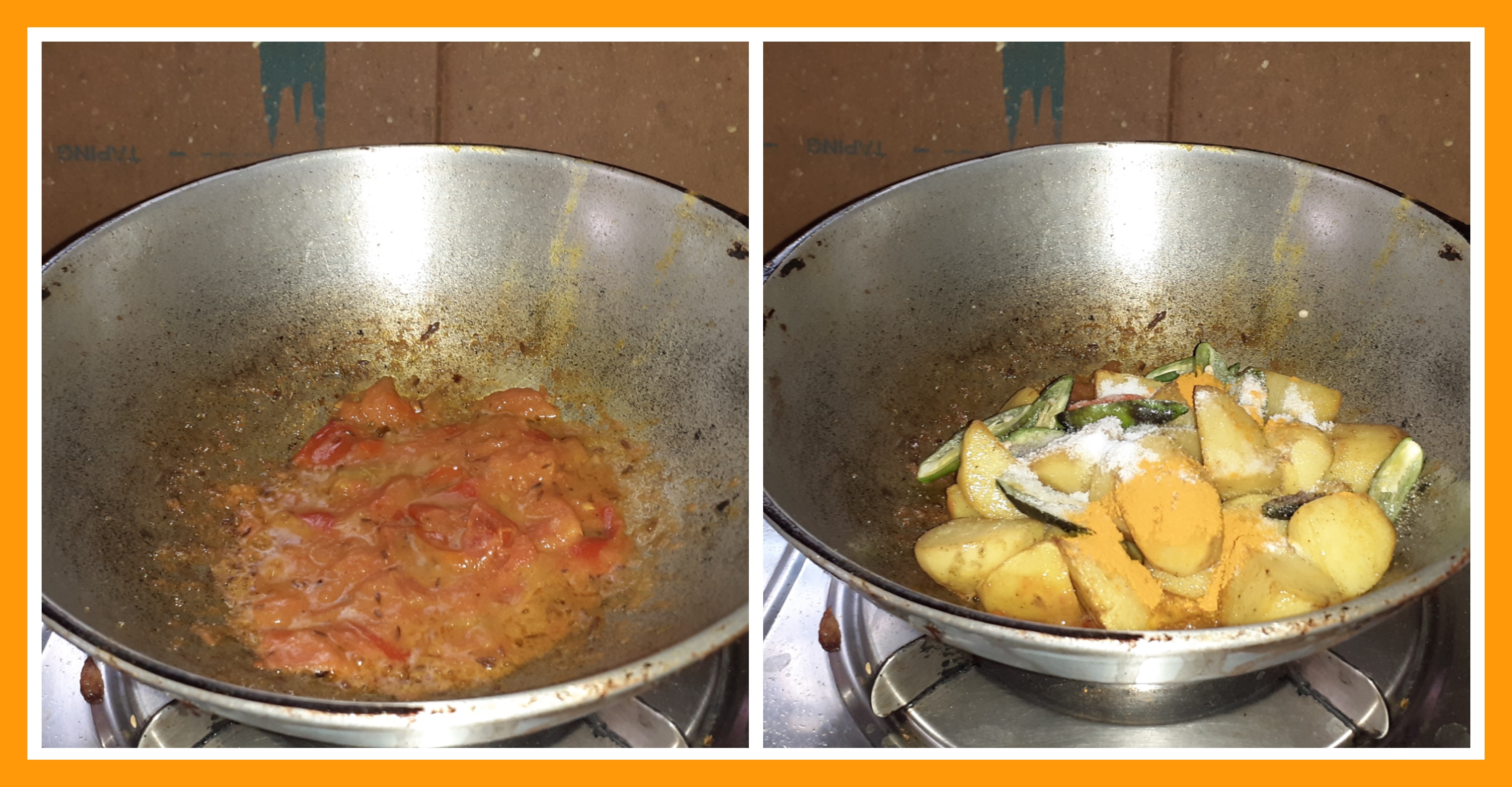 ➤কেটে রাখা টমেটো জিরার সাথে নেড়েচেড়ে ফুটিয়ে সেদ্ধ করে নিয়েছিলাম। এরপর তাতে ভেজে রাখা আলু দিয়ে দিয়েছিলাম এবং সাথে লবন, হলুদ ১ চামচ করে আর কেটে রাখা কাঁচা লঙ্কাগুলো দিয়ে দিয়েছিলাম।