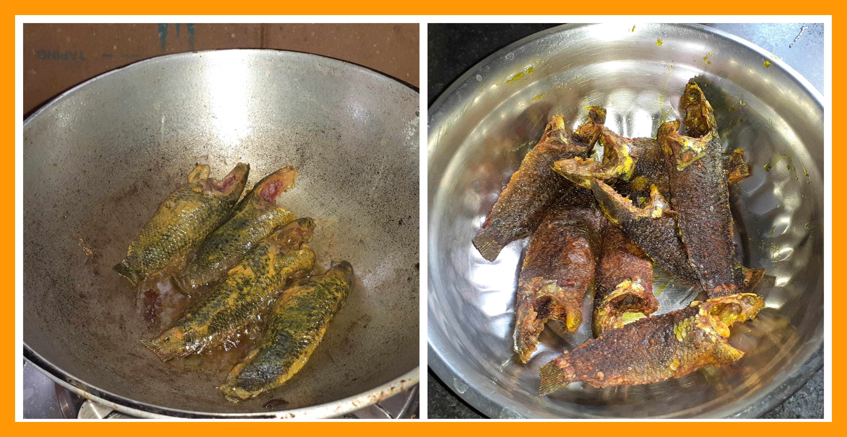 ➤কড়াইতে তেল দিয়ে অল্প অল্প করে সবগুলো কই মাছ ভালো করে ভেজে নিয়েছিলাম।