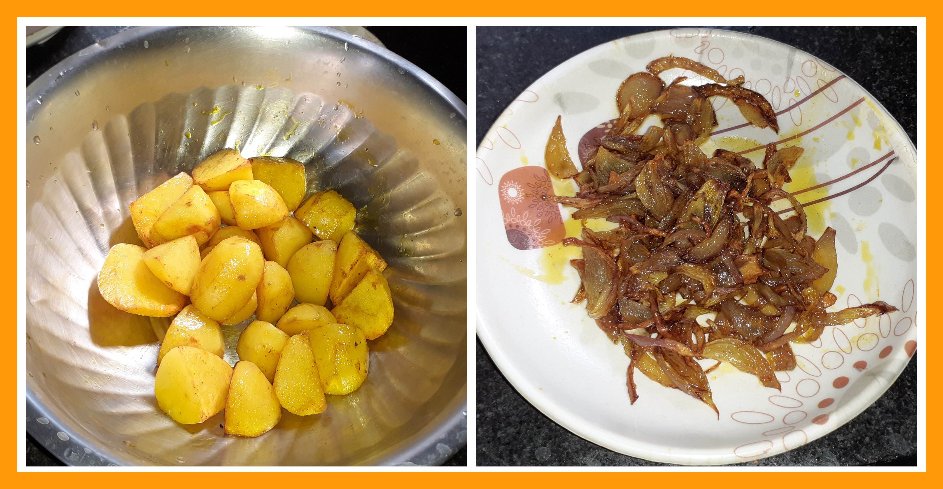 ➤আলুর পিচগুলো সব লাল মতো করে ভেজে নিয়েছিলাম। এরপর কাটা পেঁয়াজ ভালো করে ভেজে নিয়েছিলাম।