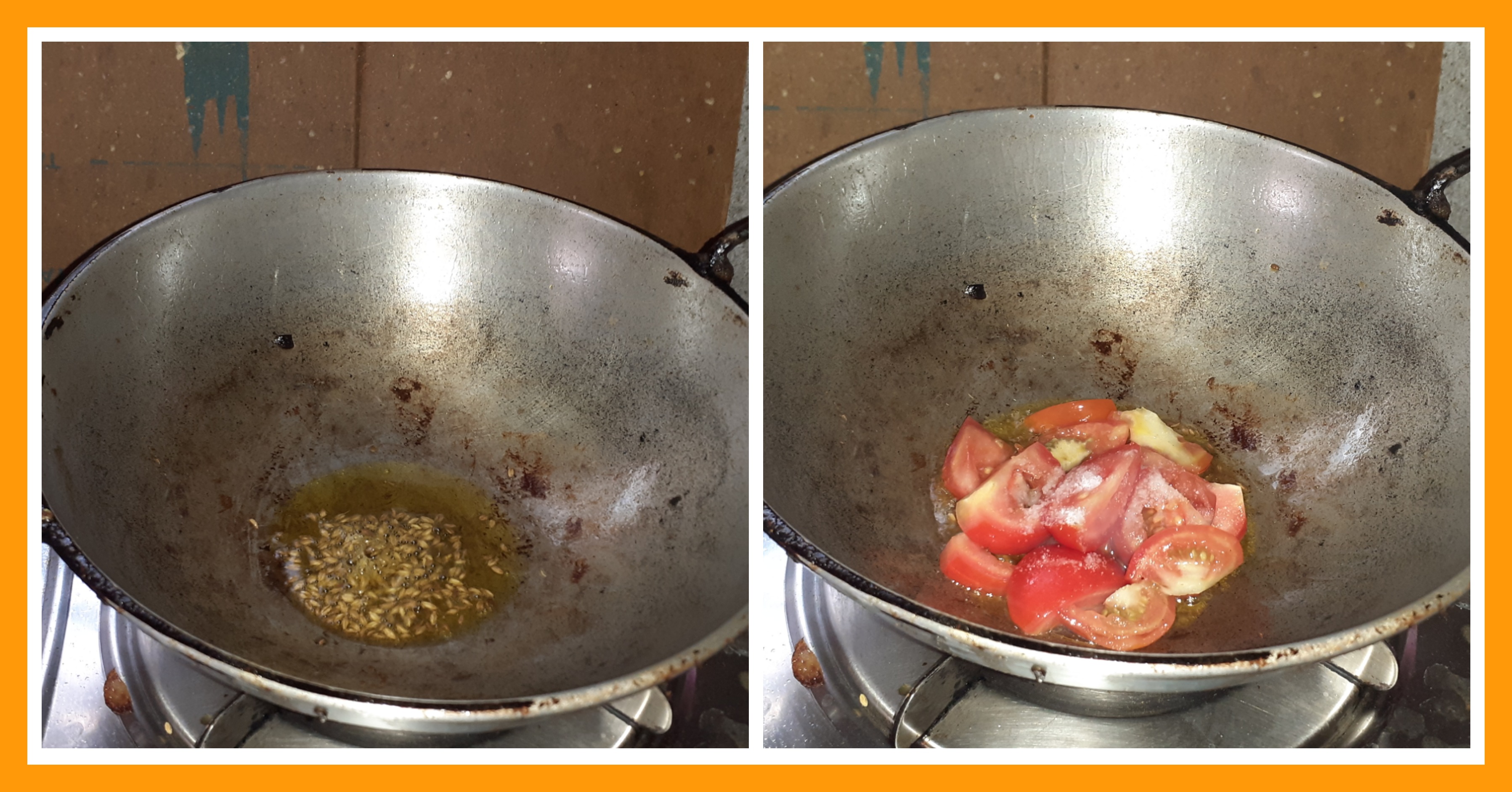 ➤কড়াইতে পুনরায় পরিমাণমতো তেল দিয়ে তাতে জিরা দিয়ে দিয়েছিলাম। এরপর তাতে একটু পরে কেটে রাখা টমেটো দিয়ে দিয়েছিলাম।