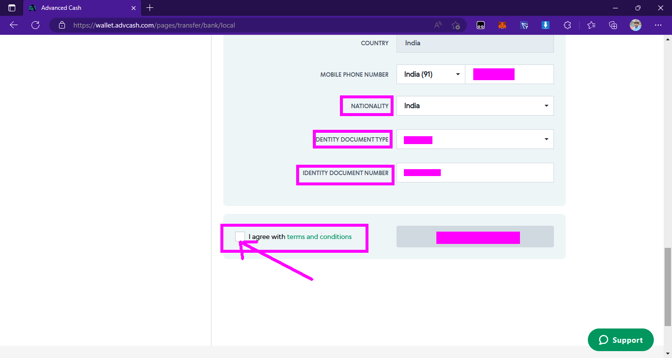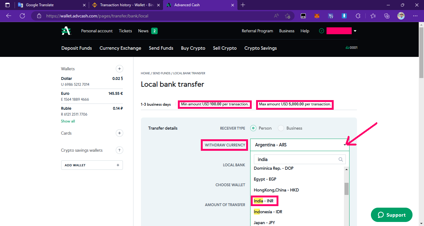 ➤পঞ্চম পর্যায়ে, এই পর্যায়ে এসে আপনারা দেখতে পাবেন উপরেই লেখা আছে মিনিমাম ১০০$ পার ট্রানসাকশান এবং ম্যাক্সিমাম ৫০০০$ পার ট্রানসাকশান। যাইহোক, এরপর নিচে উইথড্র কারেন্সী এর ওখানে পাশে ড্রপ ডাউন অপশনে ক্লিক করে যার যার কান্ট্রি সিলেক্ট করে নেবেন( ইন্ডিয়া হলে ইন্ডিয়া, বাংলাদেশ হলে বাংলাদেশ )।