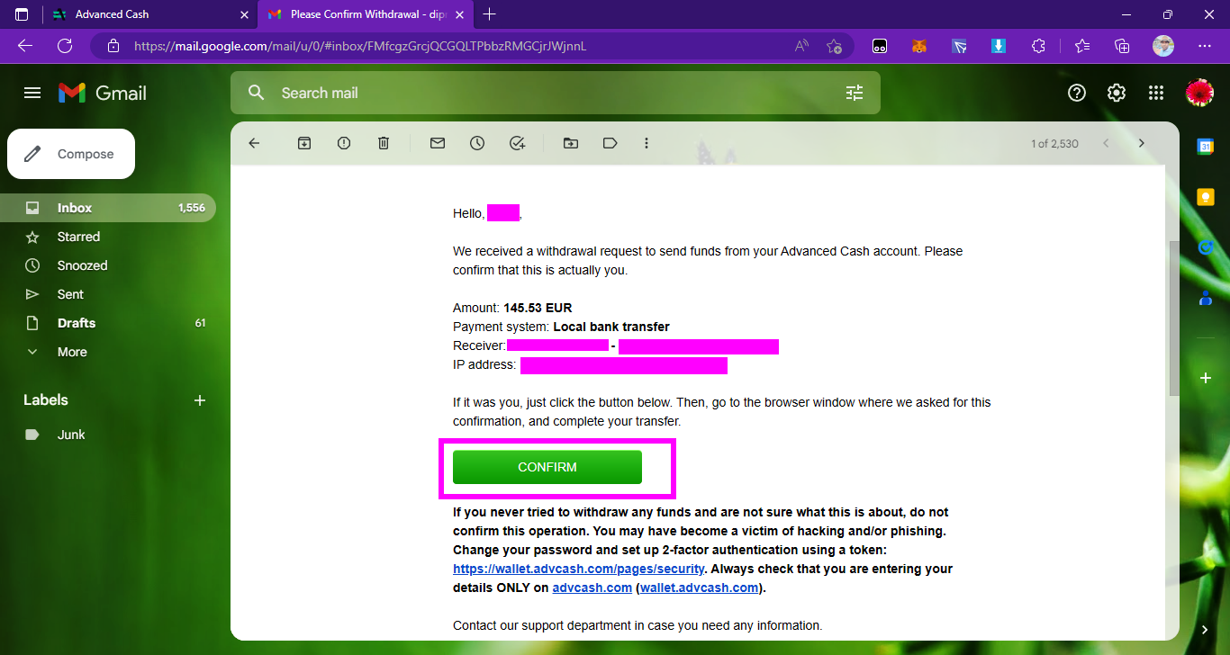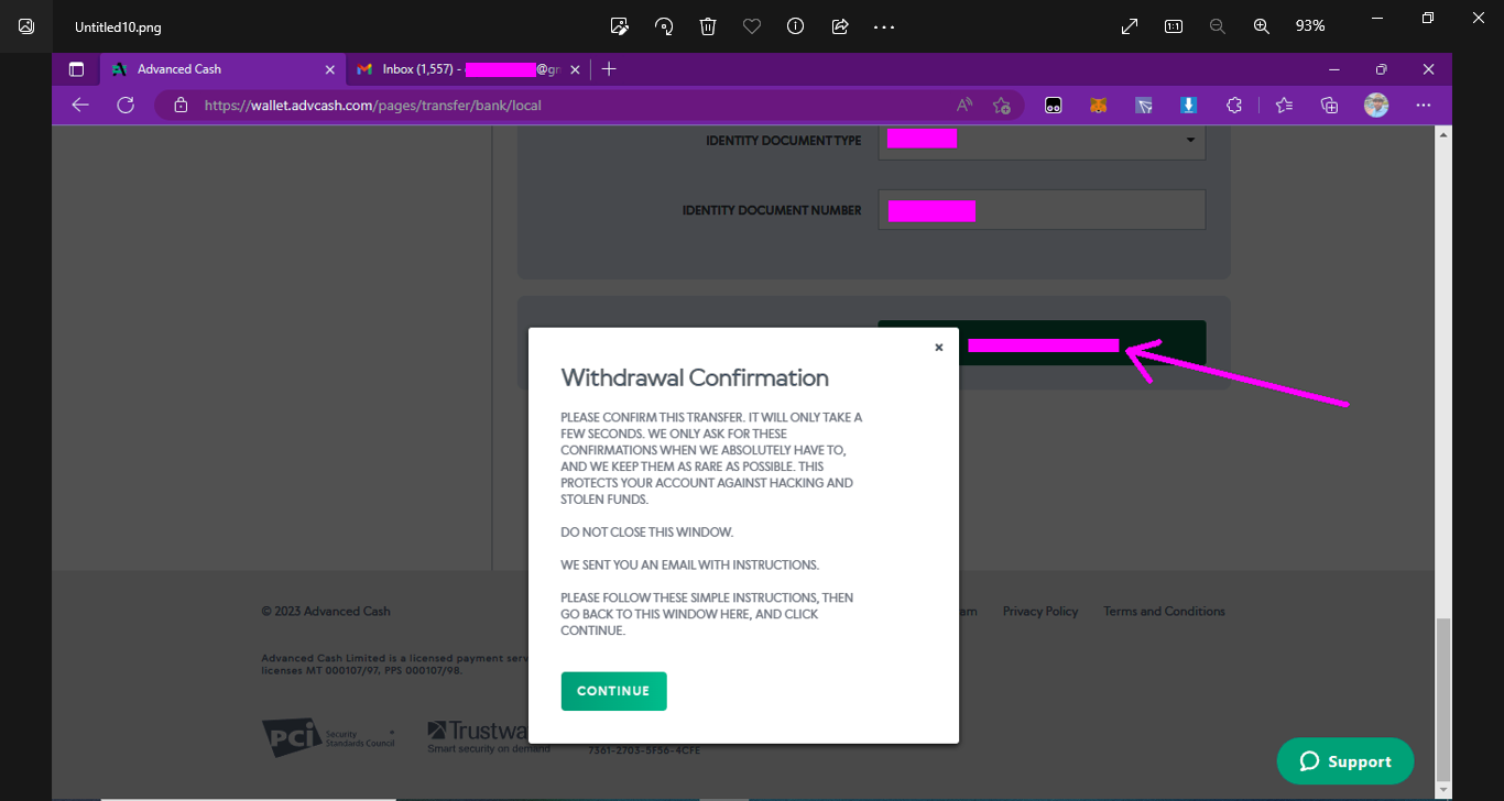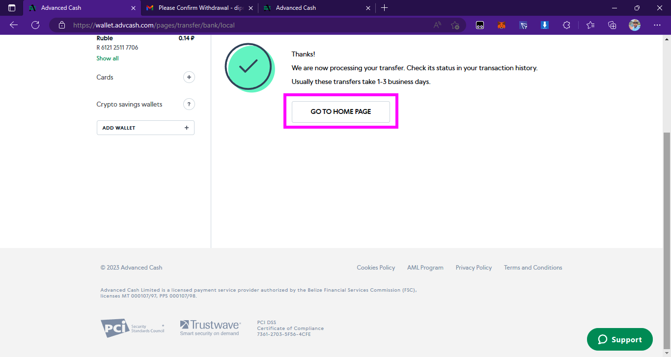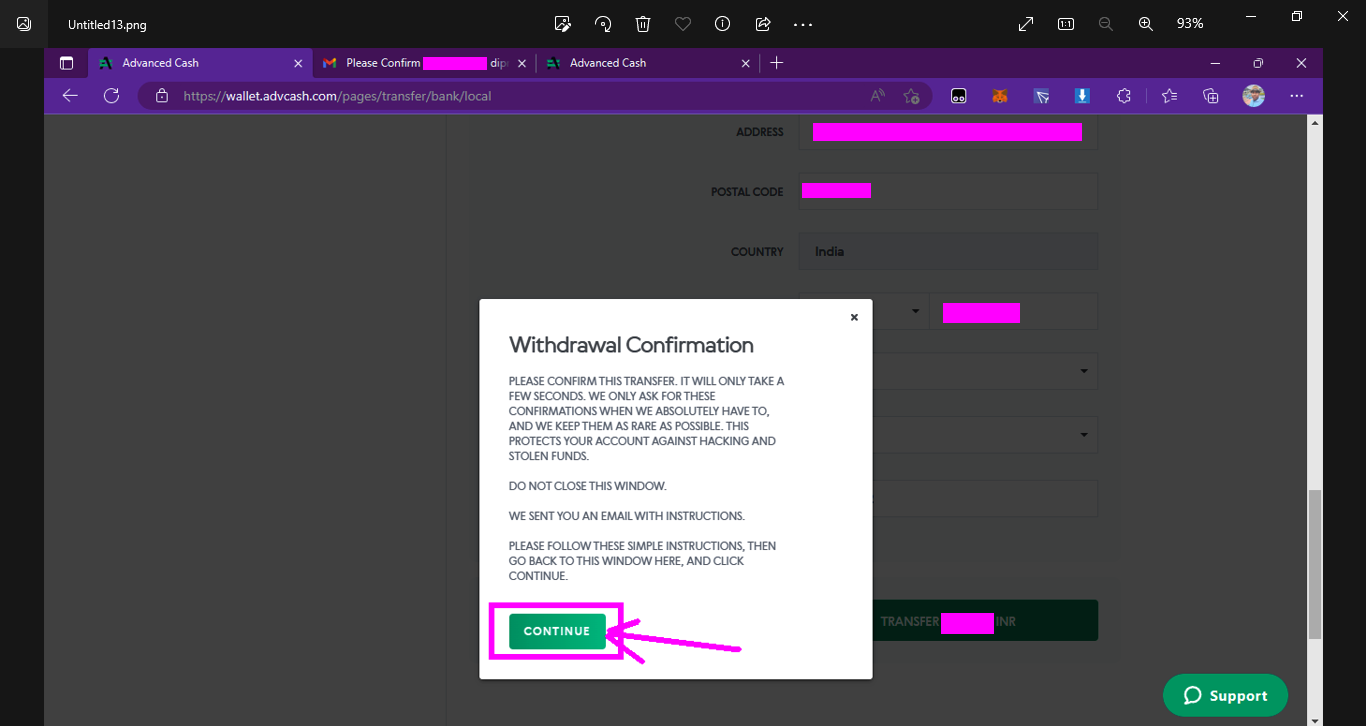 ➤দশম পর্যায়ে, টিক বক্সে ক্লিক করে agree করার পরে ট্রান্সফার অপশনে ক্লিক করবেন এবং আপনাদের সামনে withdrawal confirmation এর একটা অপশন ওপেন হবে। এখানে কিছু ইন্সট্রাকশন দেওয়া আছে সেগুলো পড়ে নেবেন। যাইহোক ট্রান্সফার অপশনে ক্লিক করার পরে ক্লোস করবেন না, কারণ আপনার যে মেইল দিয়ে অ্যাডভান্সড ক্যাশ ওয়ালেট খোলা ছিল সেই মেইলে একটা কনফার্মেশন মেইল যাবে সেটা এই ইন্সট্রাকশনেও লেখা থাকবে।