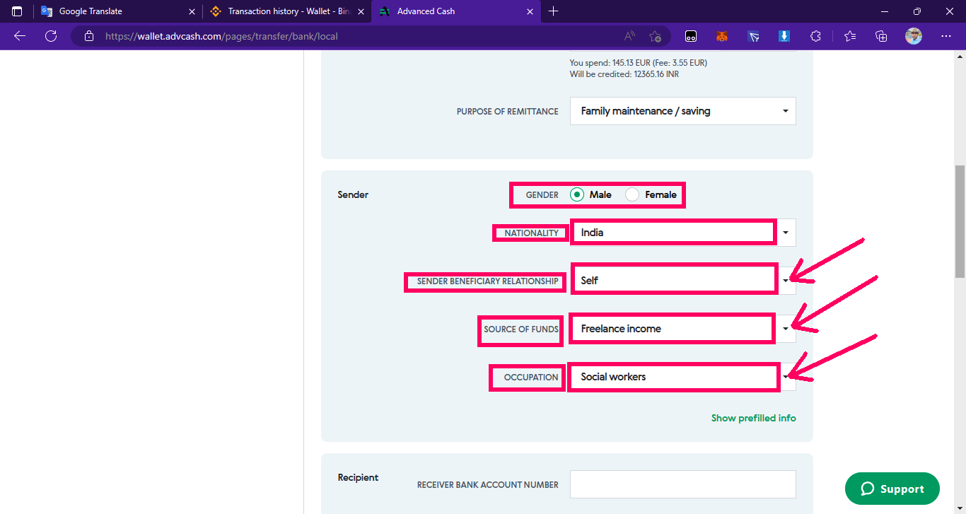 ➤সপ্তম পর্যায়ে, উপরের ট্রান্সফার ডিটেইলস এর কাজ শেষ করার পরে এখন সেনডার ডিটেলস এর কাজ। সেনডার ডিটেইলস এ এসে আপনাকে gender সিলেক্ট করতে হবে। তারপর পরপর অপশনগুলোতে গিয়ে ড্রপ ডাউন মেনুতে ক্লিক করে সব সেট করে নিতে হবে, যেমন প্রথমে আপনার ন্যাশনালিটি সিলেক্ট করে নেবেন। তারপর sender beneficiary relationship অপশনে গিয়ে আপনাকে একইভাবে ড্রপ ডাউন মেনুতে ক্লিক করে SELF অপশনটা সেট করে নিতে হবে। তারপর source of funds অপশনে গিয়ে একইভাবে FREELANCE INCOME অপশনটা সেট করে নিতে হবে। তারপর occupation অপশনে গিয়ে একইভাবে SOCIAL WORKERS অথবা SOFTWARE DEVELOPER এই দুটির যেকোনো একটি সেট করে নেবেন।