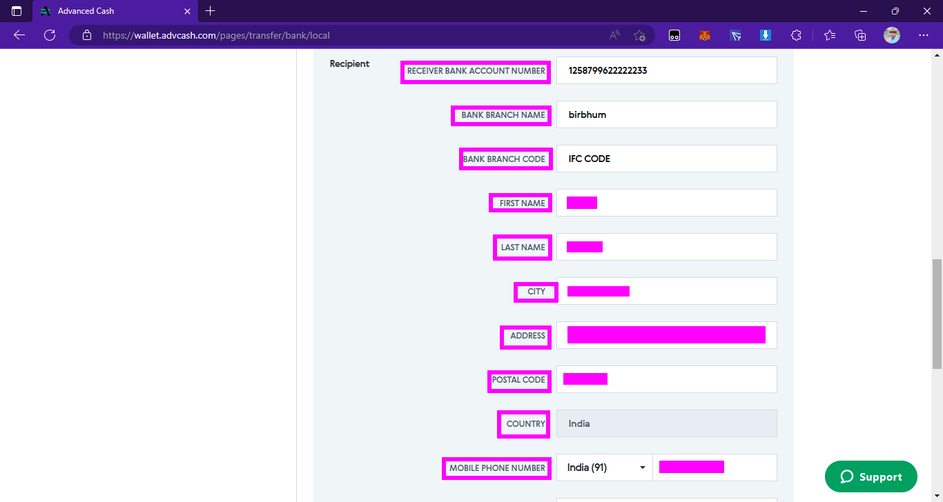 ➤অষ্টম পর্যায়ে, সেনডার অপশন কমপ্লিট করার পরে এইবার আপনার রেসিপিয়েন্ট অপশন কমপ্লিট করার পালা। এই রেসিপিয়েন্ট অপশনে এসে আপনাকে ব্যাঙ্ক একাউন্ট এর ডিটেলসগুলো ভরতে হবে। প্রথমে আপনাদের একাউন্ট নম্বর দেবেন, তারপর আপনাদের যার যে ব্রাঞ্চ সেইটা লিখবেন, তারপর ব্যাঙ্কের ব্রাঞ্চ কোড মানে আপনার IFC কোডটা লিখতে হবে, তারপর আপনার পার্সোনাল ডিটেইলসগুলো ভরতে হবে যেটা যেটা চাইবে ( এইগুলো আপনার আইডেন্টি এবং এড্ড্রেস ভেরিফিকেশন করার পরে অটোমেটিক সেভ হয়ে যায়, তারপরেও না থাকলে নিজেরা ভরে নেবেন ডিটেলস )।
