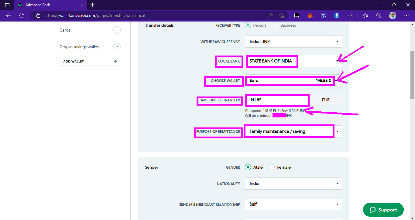 ➤ষষ্ঠ পর্যায়ে, উইথড্র কারেন্সী অপশন কমপ্লিট করার পরে আপনারা পরের স্টেপগুলো যেমন LOCAL BANK অপশনে গিয়ে যার যে ব্যাঙ্ক সেইটা একইভাবে ড্রপ ডাউন অপশনে ক্লিক করে সেট করে নেবেন। তারপর CHOOSE WALLET অপশনে গিয়ে ফান্ডটা কোন কারেন্সিতে আছে সেটা ড্রপ ডাউন মেনুতে ক্লিক করে সেট করে নেবেন। এরপর AMOUNT OF TRANSFER অপশনে গিয়ে এমাউন্টটা লিখবেন এবং পরে বাইরে ক্লিক করলে আপনাদের fee অপশনটা দেখাবে, তখন কত fee লাগবে সেইটা বাদ দিয়ে পুনরায় এমাউন্ট এর ঘরে এমাউন্টটা লিখবেন। এরপর PURPOSE OF REMITTANCE অপশনে গিয়ে FAMILY MAINTENANCE/ SAVINGS অপশনটা সেট করে নেবেন।