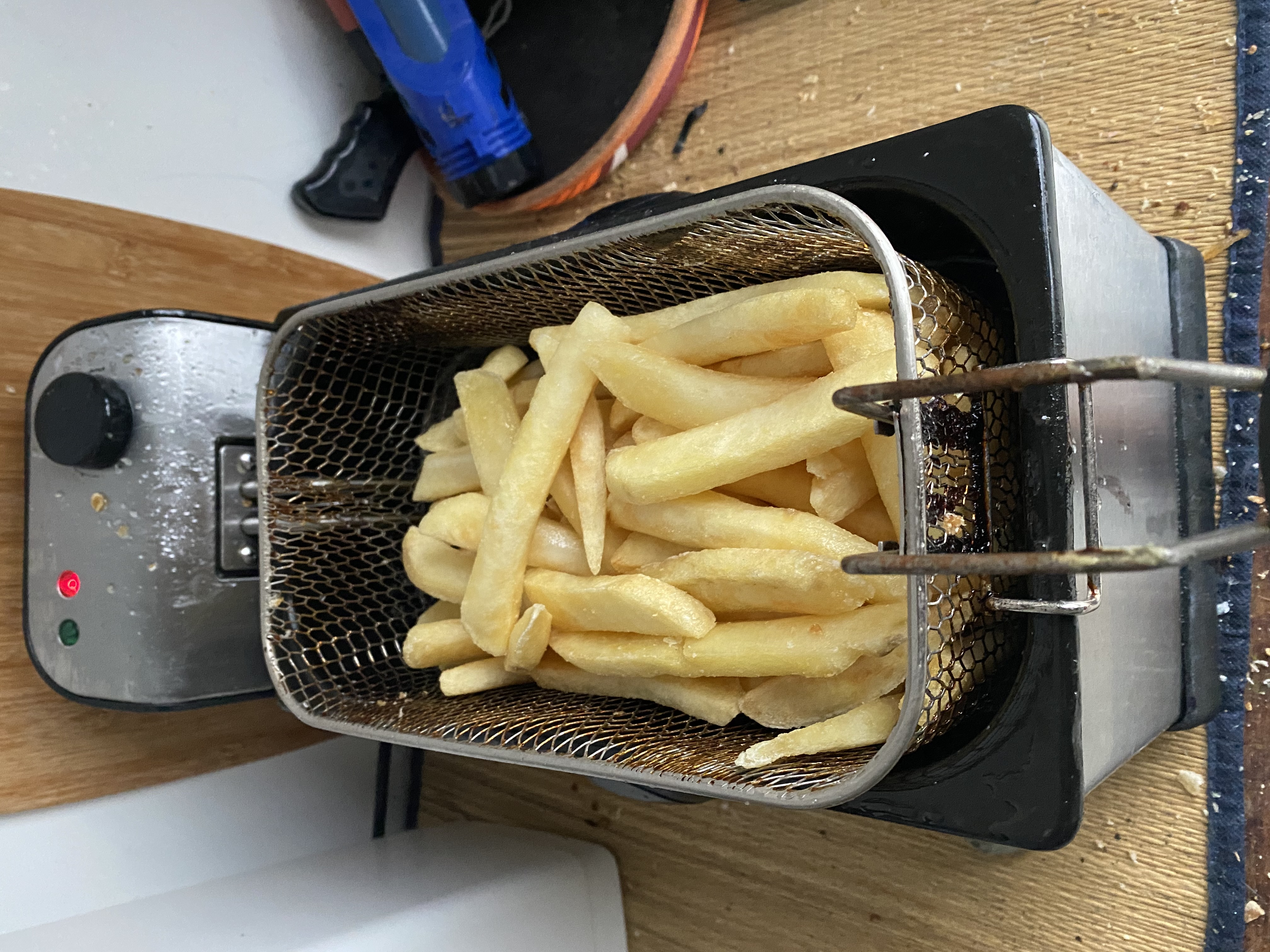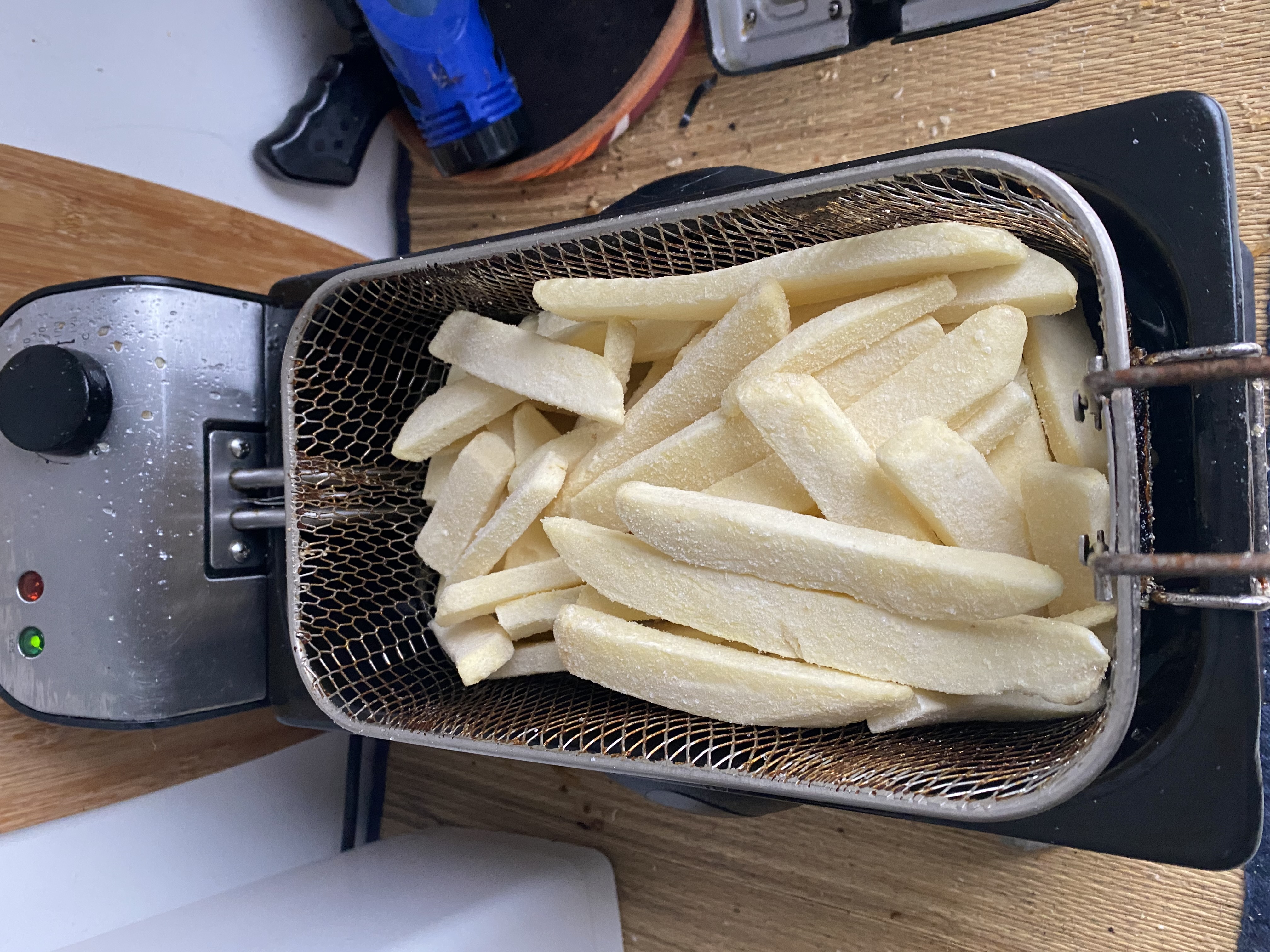 I am in charge of cooking the chips in our Deep fryer, i know we should have an air fryer but you cant beat the taste of a deep fried chip. on he left is uncooked and cooked on the right.