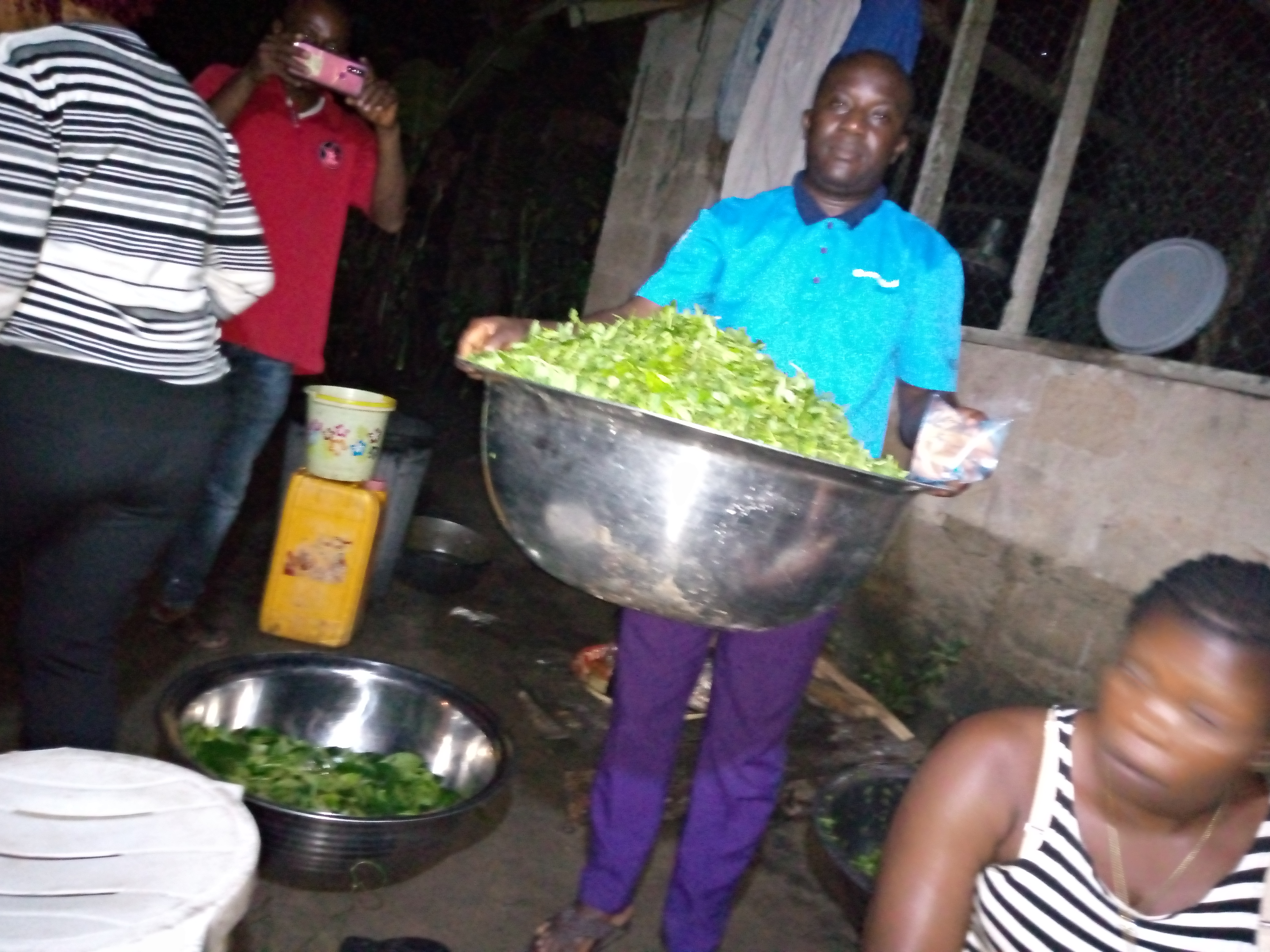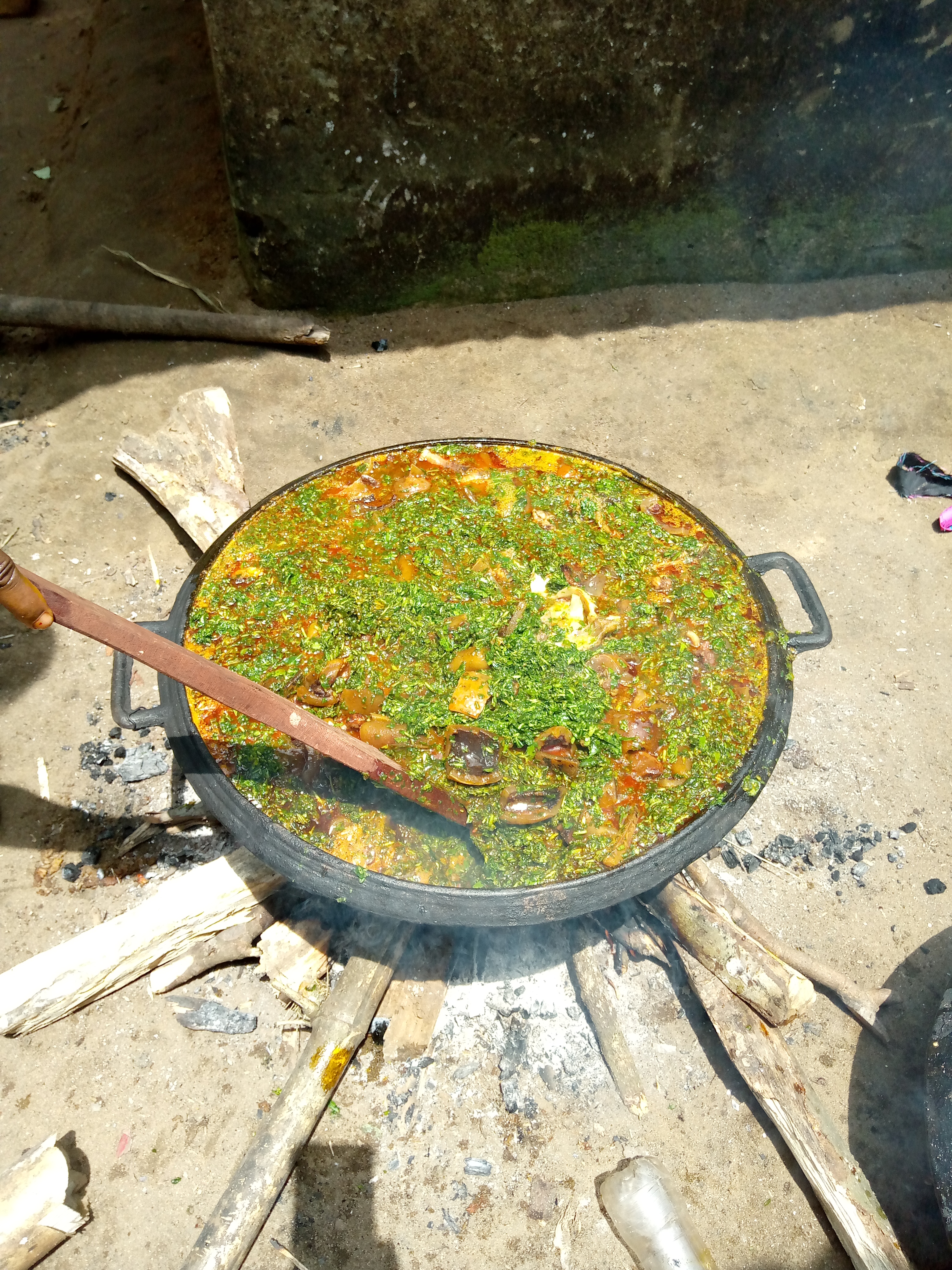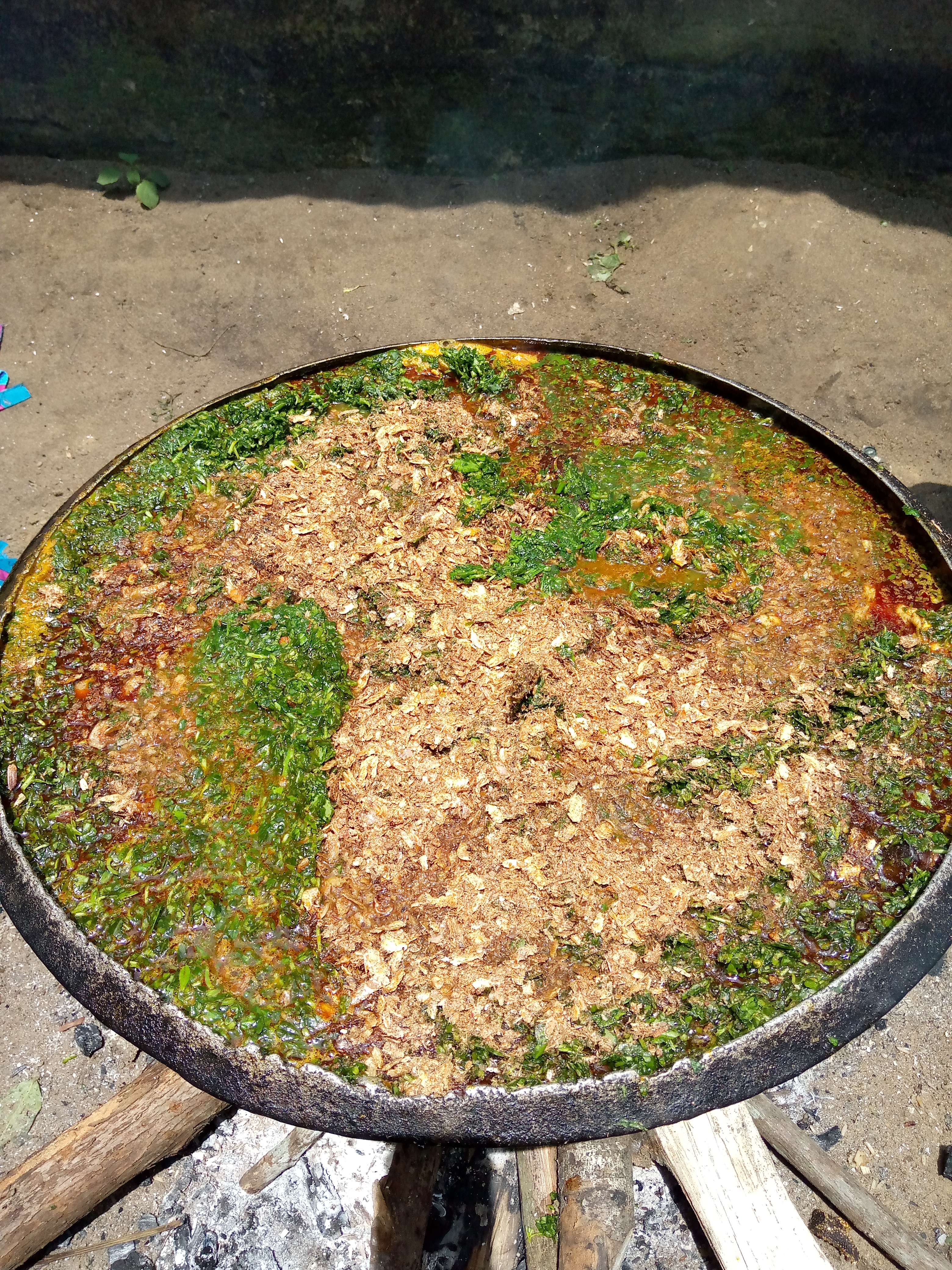Today I was actively involved in the preparation of a our traditional food called,"edikan ikong" the delicious vegitable soup. In preparing the soup, here are the ingredients or condiments.peper, crayfish,Maggi,solt, Palm oil, onions, fish,meat,water leafe and pumpkin leave.
